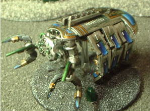| 基本 5つのカテゴリー 基本からしてFBとは違うのが40K。まず(日本語)5版FBのようにキャラクター、ユニット、ウォーマシンというようなカテゴリーでユニットが分けられているのではない。 どちらかというと六版FBっぽいと言えるな。 40Kのユニットカテゴリーは大きく5つある。 ・HQ(ヘッドクオーター)...アーミーのジェネラル的存在のユニットやキャラクターが属する。 ・ELITE(エリート)...読んで字のごとくだ。アーミー内のエリート部隊がこのカテゴリーに属する。 ・TROOPS(トループ)...アーミーの格となるカテゴリー。これに属するユニットがそのアーミーで最も一般的な戦力となる。 ・FAST(ファスト)...これも読んで字のごとくだ。高速部隊がこのカテゴリーに属する。 ・HEAVY(ヘビー)...火力部隊、射撃などに特化したような部隊から、強力なウォーマシンなどがここに属する。 いきなり目新しい単語を羅列されて少々驚いているかもしれないが、そんなに難しいことは無いよな。どれも単語を見ただけで中身が想像できる、だろ?。 もし、君がすでにCodexを手に入れている優秀な模範初心者なら、Codexを見ながら読んでクレよな。 ...ん?文字ばっかで飽きたか?よし、ここは1つ、オレのアーミーを使って実例ってヤツを紹介しよう。順当に行けばみんなの人気者スペースマリーンで 紹介したいところだけどさ、オレはそのアーミー持ってねぇの。ゴメンな。 オレのアーミーはケイオスとネクロンなんだけど、編成が簡単なネクロンを例にしてみようか。 余談になっちゃうんだが、このネクロンアーミーは編成もペイントも簡単で、なんつーか凄く初心者に優しいアーミーになってるぜ。 コストも40K中最も高い奴等だから、ミニチュアの数も少なくて済む。映画のターミネーターのビデオを持ってたり、ロードショウでやるたんびに 飽きもせずに何回も見てるヤツなんかには、マジでゾクっとくるようなデザインだ!まぁパクったどうのって話はまた今度な。