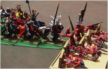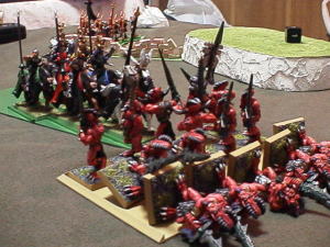 | ジェネラル合流のレルム主力部隊が、ブラッドレターに再度チャージ宣言。 今度は、退却できそうな距離ではありません。 「ゲハハハ!たった7体のナイト風情、返り討ちにしてのけるわ!」 勇ましく応戦するブラッドレター。 心の中では 「このぐらいだったら何とかなるだろう」と思っていた僕の考えを大きく覆し、 ジェネラル、チャンピオン以下5体のナイトがブラッドレターを7体も葬る! ヒットロールに+1する事の出来る「バナー・オブ・マイト」を持っているブラッドレターだが、 反撃する事は出来ずあっさりブレイク! しかし、徒歩とは思えぬ逃げ足でナイトの追撃から逃れる! 続く接近戦、ジャガーノートがポカをやらかしたおかげで 孤独な戦闘を強いられているフレッシュハウンドが健闘空しくついにブレイク! しかし、逃げ切る事に成功! ナイトは、ジャガーノートの前で部隊の側面をさらす事になる。やったぜ! |