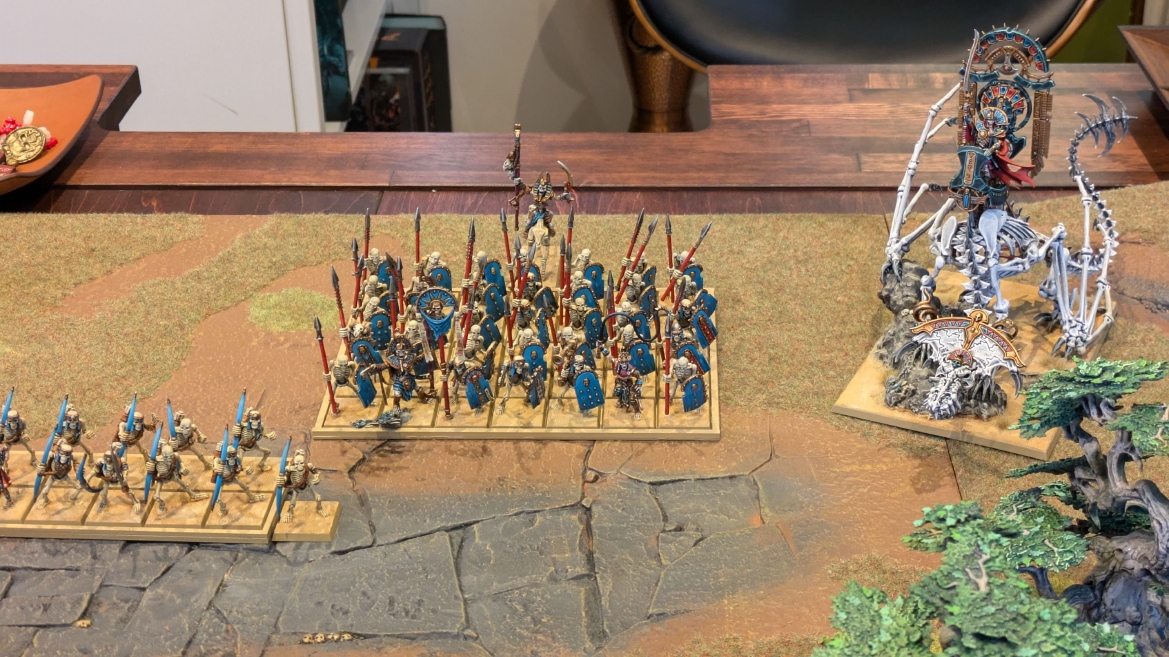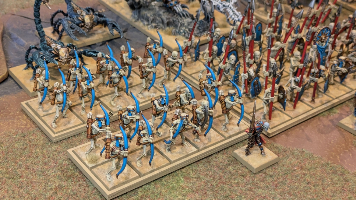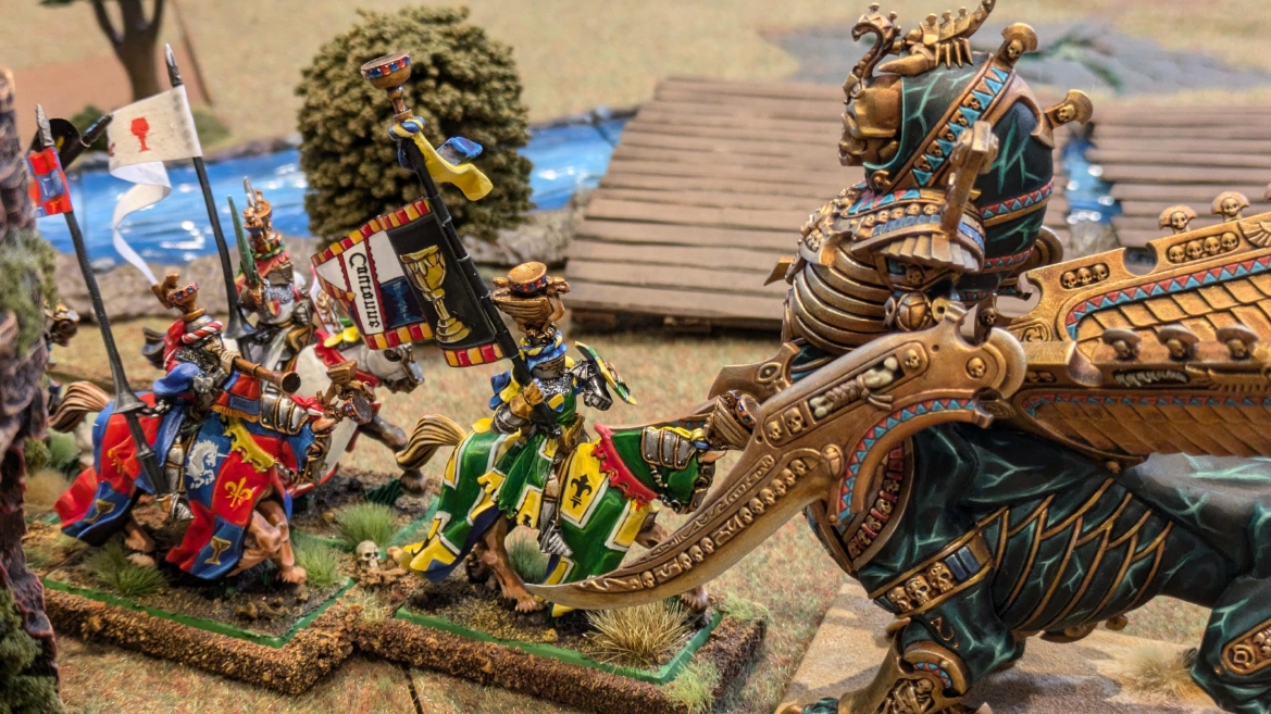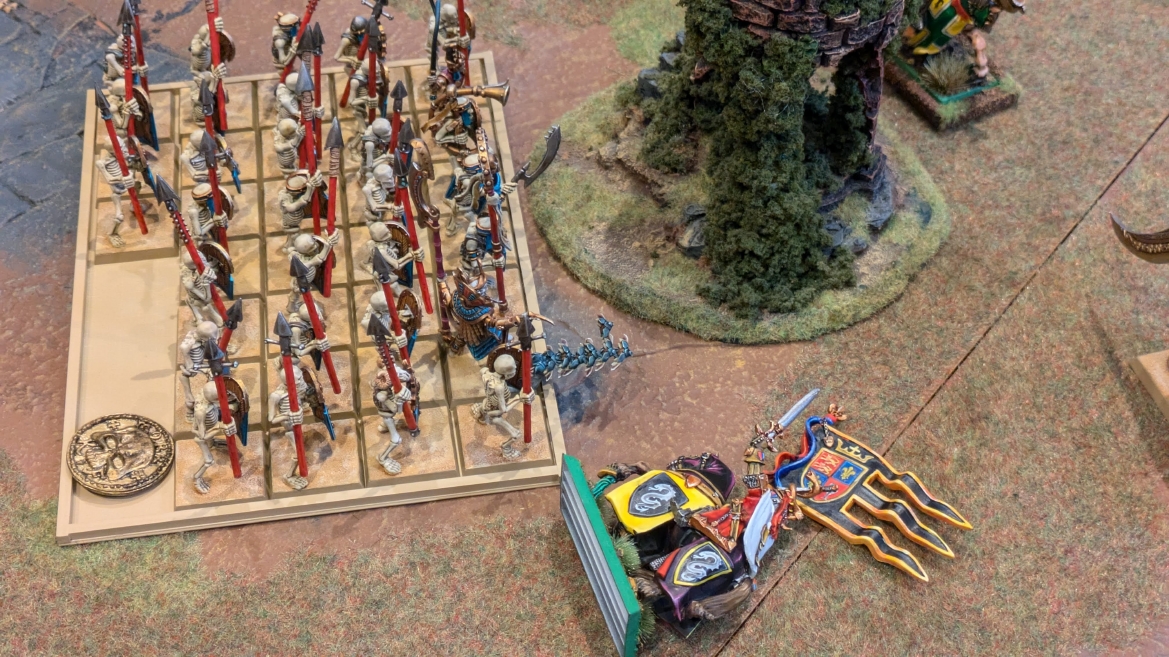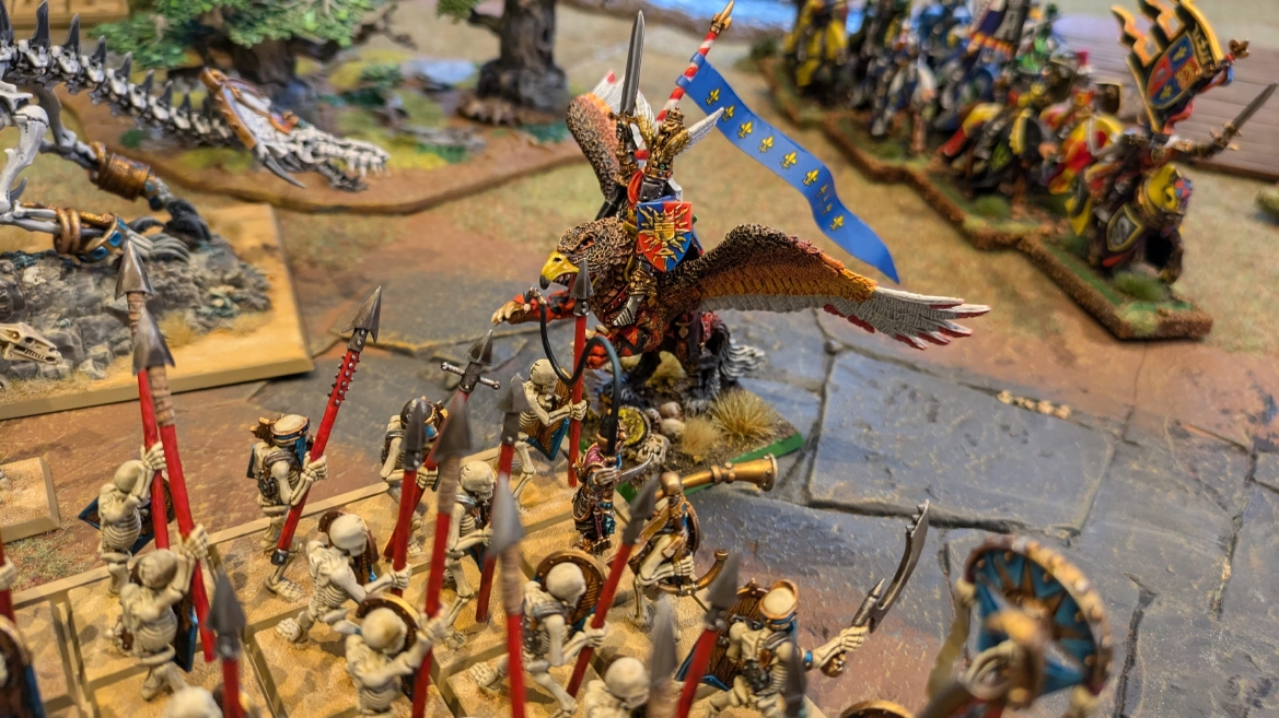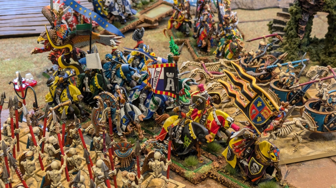 | イントロ ウォーハンマーファンタジーバトルの再誕、その名も WARHAMMER THE OLD WORLD 。 ![]() 皆さん、オールドワールド(以下OW)遊んでますか!? 遊んでいる人は多いような少ないような、少なくとも僕のTL上では遊んでる人はいつも同じ人で、新しくOW始めた!という人は少ない印象があります。 まぁ、OWの元になったファンタジーバトルこそ元祖ウォーハンマー!ではあるものの、一度滅んでから随分時間が経ちましたし、 かつてありし世界で遊んでいた趣味人もだいぶ少なくなったり、 時代の流れのなかで、数あるGWゲームの中でもマイナー寄りなイメージになってしまってる感じはしますね。英語版しかないのが何と言っても痛い。 しかし僕は今年ブレトニアの制作に打ち込んだこともあり、僕の中では大いに盛り上がっていましたので、今年のMyホビーはOW一色な一年になったという印象です。 今回のゲームを含め、2024年はOWを4回遊べたというのは一般的には極少かもしれませんが、 厳しい妻ににらまれている身分としては大変上出来な回数だったと満足しています。 記念すべき第一回のバトルは卵帝君との宿命の対決となりました。 1回目のバトルレポートはこちら 第二回目のバトルは同郷の友はたさんのトゥームキングのデビュー戦になりました。 2回目のバトルレポートはこちら 第三回目のバトルは再びはたさんのトゥームキングとの熱戦となりました。 3回目のバトルレポートはこちら 今回の4回目のバトルも対戦相手は、はたさんです。 はたさんのトゥームキングとは、僕のブレトニアとのバトルを通じて熱い物語を紡いでいきたいなと思っています。 今回は前回以上に記録があいまいなところもありますので雰囲気重視のレポートになります。OWの熱気が伝われば幸いです。 アーミー紹介