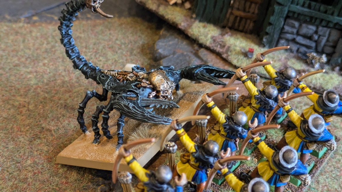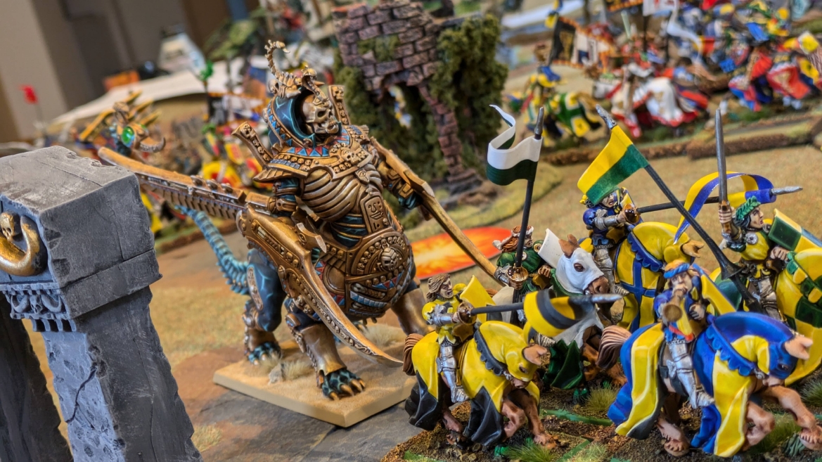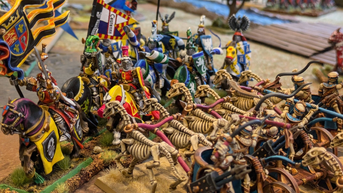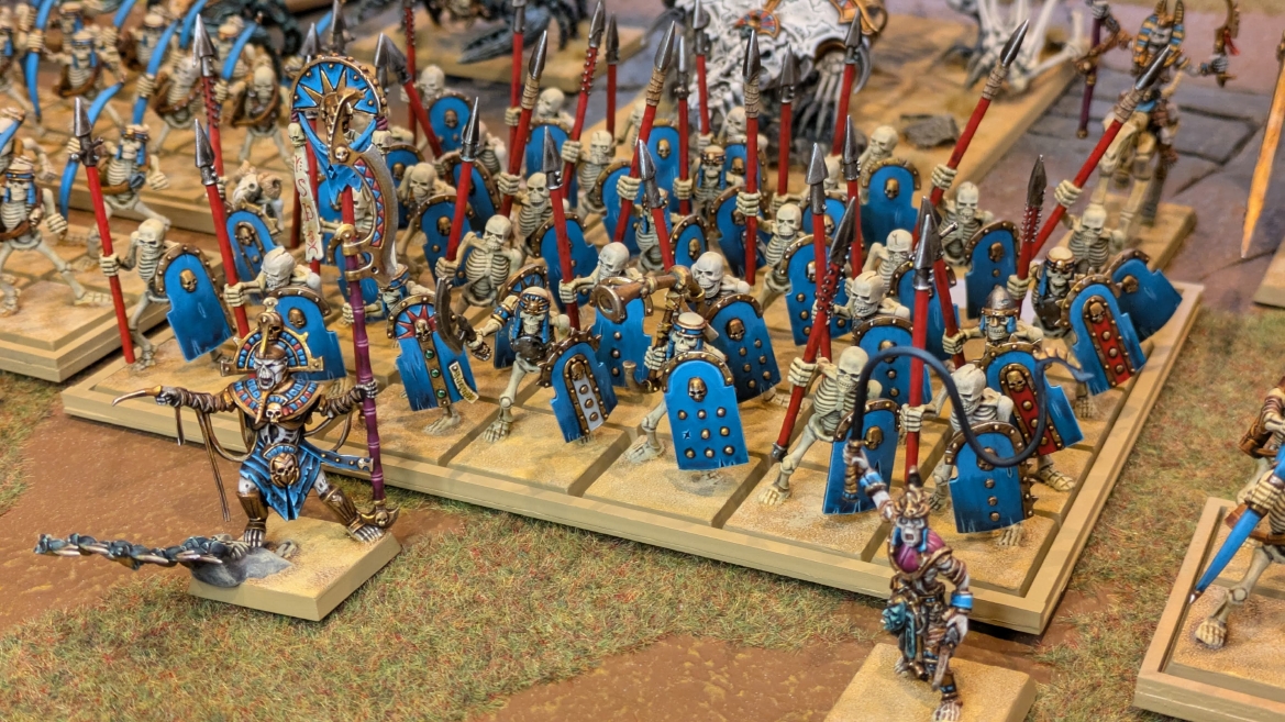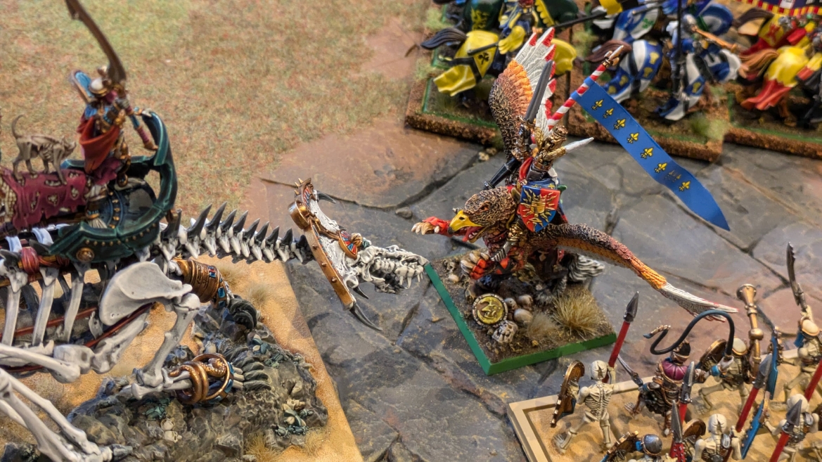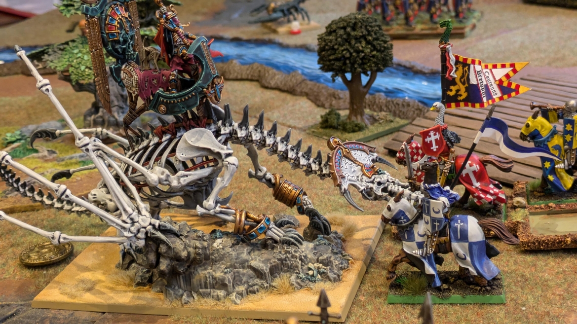 | イントロ ウォーハンマーファンタジーバトルの再誕、その名も WARHAMMER THE OLD WORLD 。 ![]() 皆さん、オールドワールド(以下OW)遊んでますか!? 遊んでいる人は多いような少ないような、少なくとも僕のTL上では遊んでる人はいつも同じ人で、新しくOW始めた!という人は少ない印象があります。 まぁ、OWの元になったファンタジーバトルこそ元祖ウォーハンマー!ではあるものの、一度滅んでから随分時間が経ちましたし、 かつてありし世界で遊んでいた趣味人もだいぶ少なくなったり、 時代の流れのなかで、数あるGWゲームの中でもマイナー寄りなイメージになってしまってる感じはしますね。英語版しかないのが何と言っても痛い。 しかし僕は今年ブレトニアの制作に打ち込んだこともあり、僕の中では大いに盛り上がっていましたので、今年のMyホビーはOW一色な一年になったという印象です。 今回のゲームを含め、2024年はOWを4回遊べたというのは一般的には極少かもしれませんが、 厳しい妻ににらまれている身分としては大変上出来な回数だったと満足しています。 記念すべき第一回のバトルは卵帝君との宿命の対決となりました。 1回目のバトルレポートはこちら 第二回目のバトルは同郷の友はたさんのトゥームキングのデビュー戦になりました。 2回目のバトルレポートはこちら 第三回目のバトルは再びはたさんのトゥームキングとの熱戦となりました。 3回目のバトルレポートはこちら 今回の4回目のバトルも対戦相手は、はたさんです。 はたさんのトゥームキングとは、僕のブレトニアとのバトルを通じて熱い物語を紡いでいきたいなと思っています。 今回は前回以上に記録があいまいなところもありますので雰囲気重視のレポートになります。OWの熱気が伝われば幸いです。 アーミー紹介