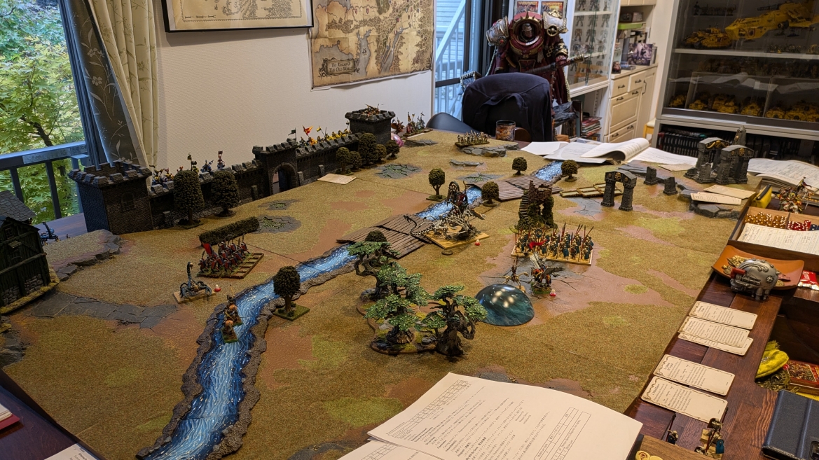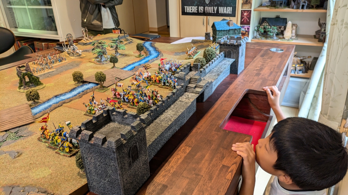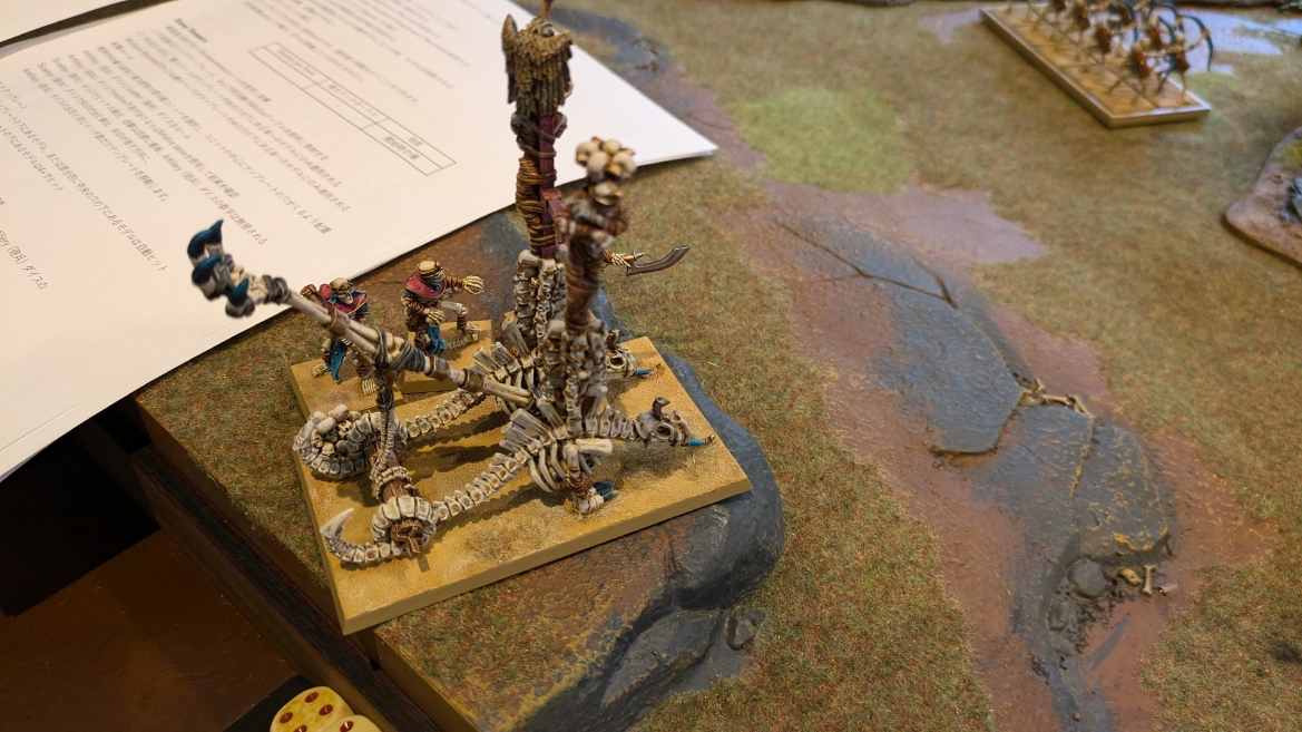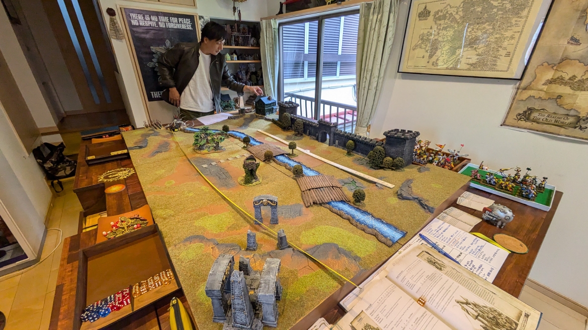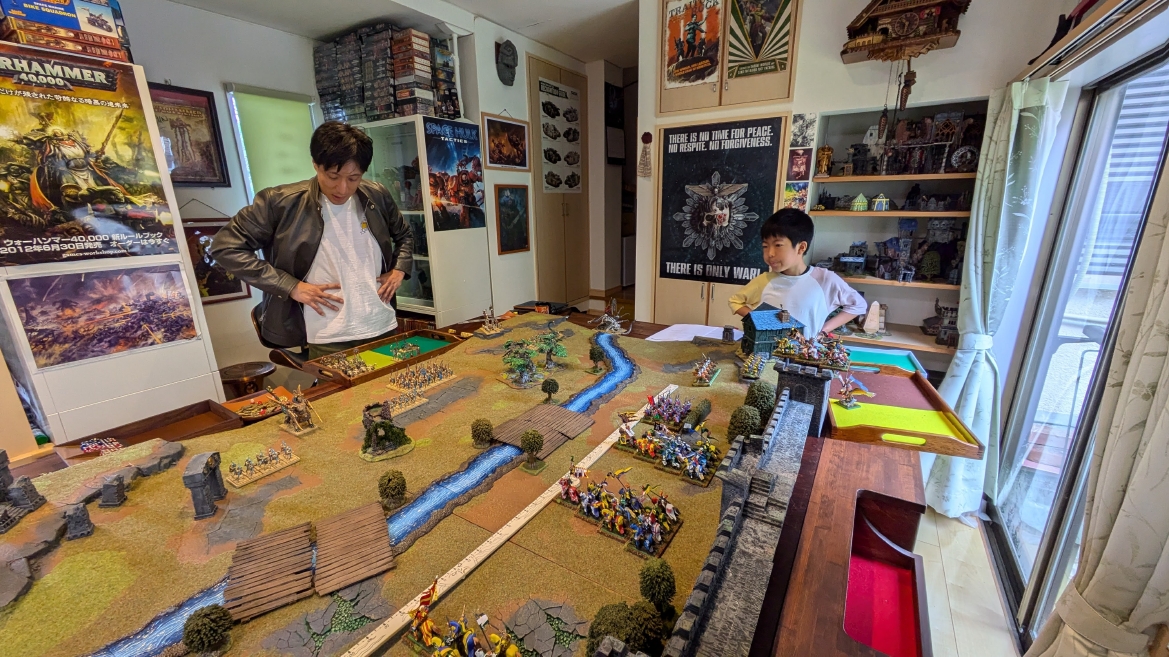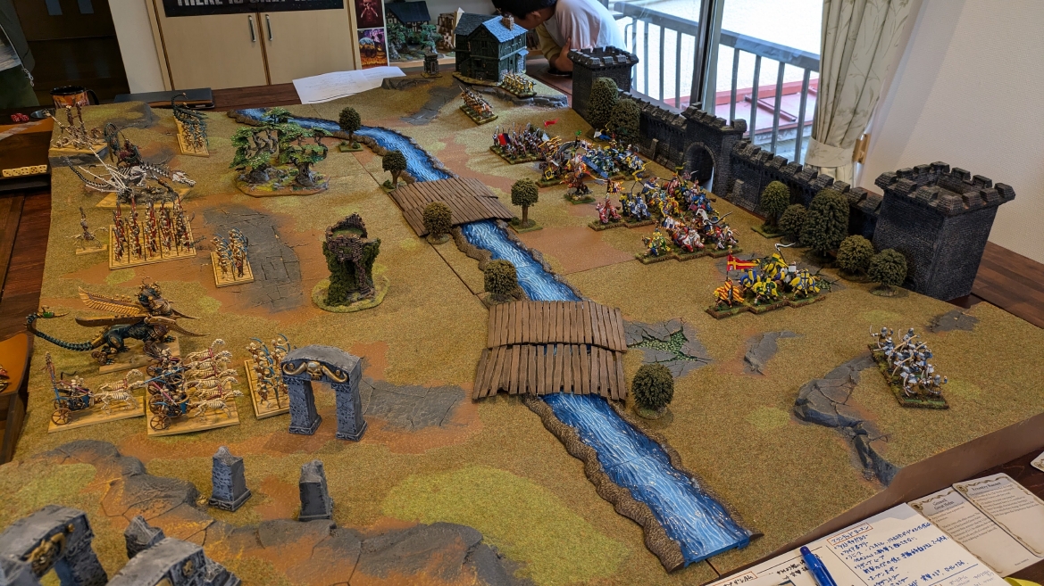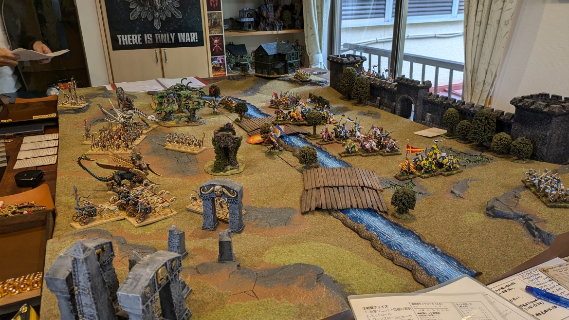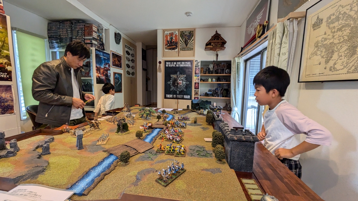 バトルセットアップ ![]() 戦場の構築はホストの役目、というのが昔の本に書いてありました。25年も前の本の記述をいまだに若干引きずってるので、今日の戦場は僕の独断で川を流しました。 今版のOWで川はディフィカルトテレイン(移動力マイナス1、突撃時は2D6の内良いほうの出目を排除)ということで、 昔よりは害が少ない感じで、割と気軽に川があってもいいのかなと思ったりしています。 川テレインは大昔に購入した他社製の塗装済みだったものです。よく売れたみたいで今でもたまに使ってる光景をSNS上で見かけることがありますね。 今回のバトル、テレインで変わり種を入れたので、シナリオ自体はシンプルにオープンバトルとすることにしました。 ![]() それにしても今回はウォーハンマー関連の雑談が盛り上がり過ぎちゃって、ゲームがなかなか始まらないって感じになっちゃってました(笑) そんでもって、ウォーハンマーは初期配置がものすごく悩むし、極端に言えば初期配置で勝敗が決まるっていう人もいるくらい、大事な時間です。 ああでもない、こうでもないとワイワイ話しながらやるのがまたたまらなく楽しいんですよねぇ。 途中、息子がちょくちょく覗きにきてました。 ブレトニア側初期配置 ![]() 背景のウォーハンマーフォートレス(城塞)は盤外においてあって、雰囲気演出用ではあるのですが、城塞を背に今まさに出撃!!という感じのブレトニア軍です。 ![]() ジェネラルのヒポグリフはどこかに隠そうか悩みましたが、意外に隠れられるところもないし、 ブレトニアの王たるものが敵の死角を狙って配置するということは絵的に美しくありません。 堂々と戦うのみ!(だからお前は勝てないとかいわないで) ![]() 城塞の正面門から戦場を覗く息子。「お父ちゃん、こっから見たらすごい迫力あってかっこいいよ!」って教えてくれる息子。かわいいやつ。 ![]() 確かにドラマチック!! トゥームキング側初期配置 ![]() トゥームキング側は川と廃墟となった塔により戦力配分にかなり苦慮されつつの初期配置となりました。 ![]() スケルトンウォーリアー35体ユニットは今回のはたさんの編成のキモのようですから、真ん中に据えられています。 プリンスとネクロテクトも合流され、防御力のみならず攻撃力も最大限に強化されています。 ここにはぶつかりたくないのが正直なところです。 ボーンドラゴンに対しては一発撃破の可能性があるだけでだいぶ気が楽なんですが、このユニットに対する対抗策が今のところ思いつきません。 ![]() スケルトンチャリオットの4期編成は横幅が広すぎてうまく配置できなかったため、1台はランク後方に。 ゲーム開始時に廃墟の塔は二人で話し合って位置決めしたのですが、この塔の位置が絶妙に邪魔過ぎてはたさんも悶絶されていました(笑)。 ![]() 丘の上にはスカルカタパルトが配置され、はたさんも今回こそはと意気込んでおられます。そして今回はトゥームスコーピオンは最初から配置。 増援戦力ですと後半までまったく出てこないというパターンもあり得るので今回は強襲用ではなく、通常戦力としての投入となっています。無難ではありますよね。 ![]() 初期配置が完了するといよいよ戦いが始まるというわくわく感がたまりませんね。すでにかなり満足度も高かったりで。 個人的にはブレトニア側は中央付近にナイトを集中配置できて、絵的にもゲーム的にも良さそうな感じで配置できたなと思っていました。 ![]() いよいよゲーム開始です。 ブレトニアは淑女の加護(全軍6+ワードセーブ、S5以上なら5+ワードセーブ)を得るために後攻を選択します。 「じゃ、僕は加護があるんで後攻でいきます〜」と宣言すると、「淑女への祈りが軽すぎる!!」と、はたさんから叱られました(笑)。 ![]() 1ターン目先行トゥームキングです。歩きながらアーサプの矢の効果で移動後マイナス修正無視で射撃するスケルトン。 と言っても5以上でヒット。そんなには当たりませんよと。 ![]() おおっと!ヨーメンに刺さりました。1体落馬。地味につらいですね、セーブ全くないっていうのも。 ![]() そしていよいよ射撃フェイズのメインディッシュ、スクリーミングスカルカタパルトから放たれた燃え盛る髑髏はちゃんと当たるでしょうか!!? ![]() ナイトオブザレルムに直撃ッ!!!!うわぁぁ〜〜〜一発目でやりましたね! 「閣下危ない」で淑女をかばった騎士も含め、合計7点のダメージを叩き込まれました。 これはさすがにヤバイかな?って思いましたが、セーブ修正加え5+アーマーセーブと5+ワードセーブの結果、ダメージゼロ!! ![]() いや〜これは凄い運がよかったです。しかし今回のカタパルト、幸先はいいですね。かなり。 さて、射撃フェイズも終わりほぼノーダメージで1ターン目前半を追えました。さぁ、ナイト達全軍前進です。突撃はさすがにまだできません。 射撃フェイズに眼前のスケルトンアーチャーに向けてファイアボールを放つプロフェテス! ![]() しかしミスキャストからの魔