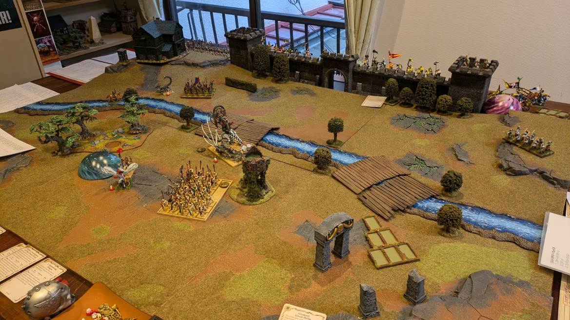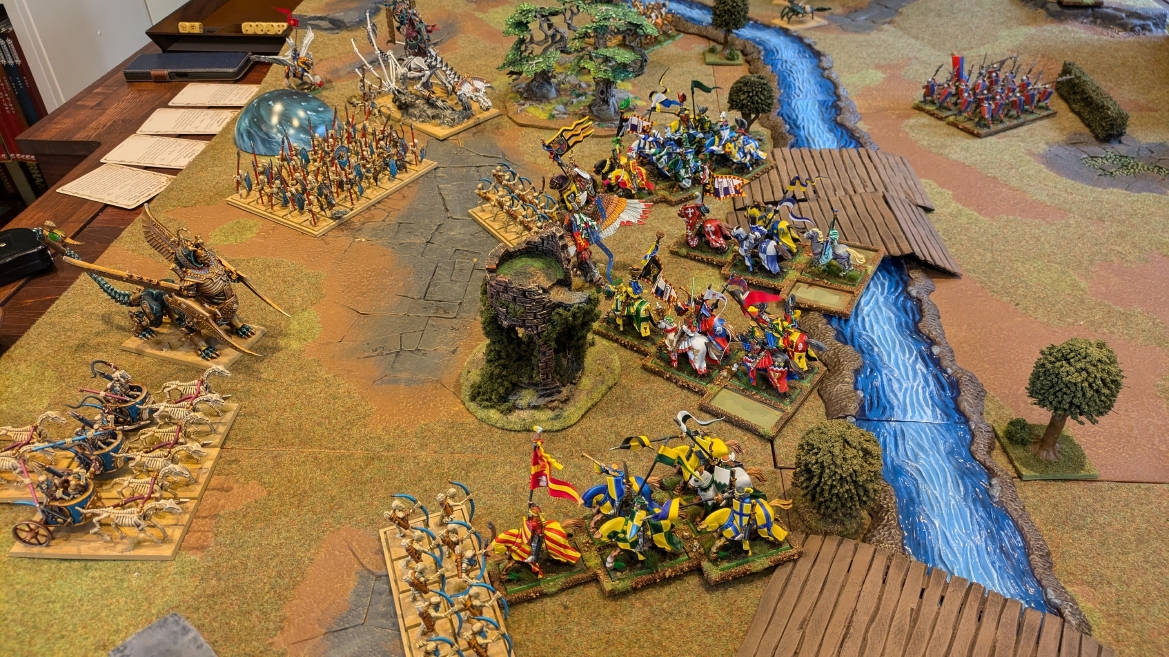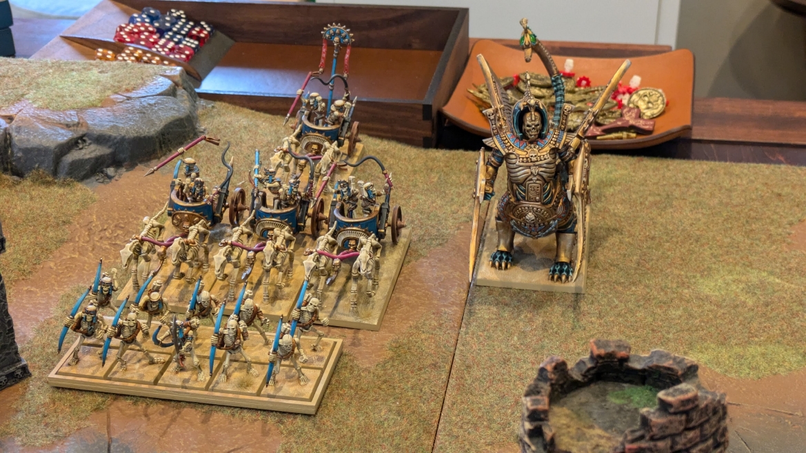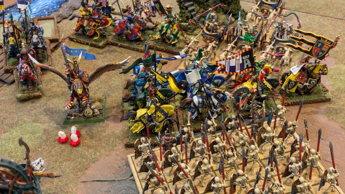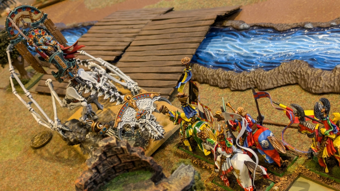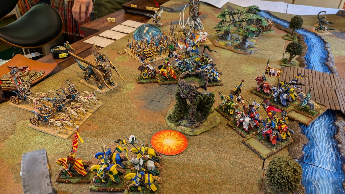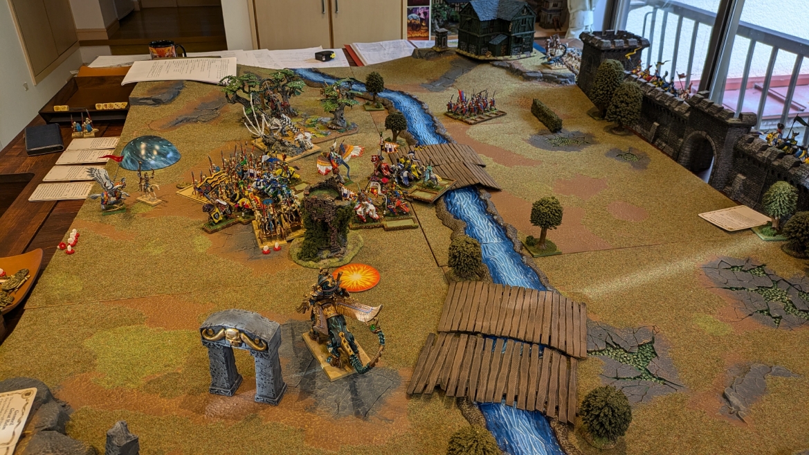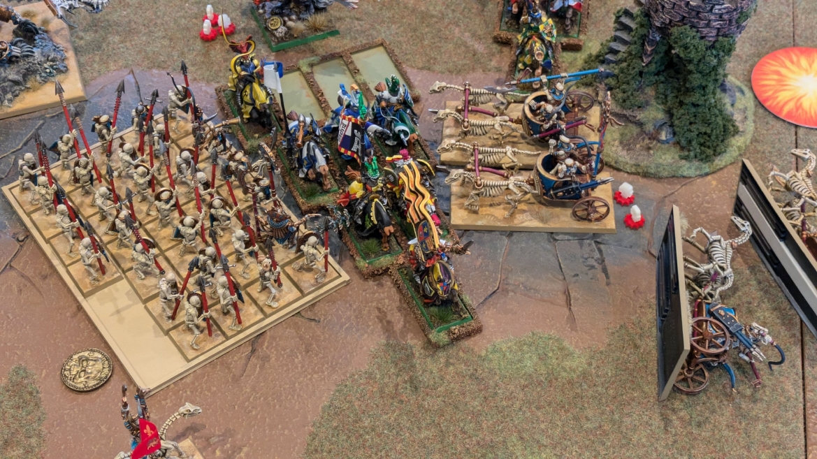バトルセットアップ ![]() 戦場の構築はホストの役目、というのが昔の本に書いてありました。25年も前の本の記述をいまだに若干引きずってるので、今日の戦場は僕の独断で川を流しました。 今版のOWで川はディフィカルトテレイン(移動力マイナス1、突撃時は2D6の内良いほうの出目を排除)ということで、 昔よりは害が少ない感じで、割と気軽に川があってもいいのかなと思ったりしています。 川テレインは大昔に購入した他社製の塗装済みだったものです。よく売れたみたいで今でもたまに使ってる光景をSNS上で見かけることがありますね。 今回のバトル、テレインで変わり種を入れたので、シナリオ自体はシンプルにオープンバトルとすることにしました。 ![]() それにしても今回はウォーハンマー関連の雑談が盛り上がり過ぎちゃって、ゲームがなかなか始まらないって感じになっちゃってました(笑) そんでもって、ウォーハンマーは初期配置がものすごく悩むし、極端に言えば初期配置で勝敗が決まるっていう人もいるくらい、大事な時間です。 ああでもない、こうでもないとワイワイ話しながらやるのがまたたまらなく楽しいんですよねぇ。 途中、息子がちょくちょく覗きにきてました。 ブレトニア側初期配置 ![]() 背景のウォーハンマーフォートレス(城塞)は盤外においてあって、雰囲気演出用ではあるのですが、城塞を背に今まさに出撃!!という感じのブレトニア軍です。 ![]() ジェネラルのヒポグリフはどこかに隠そうか悩みましたが、意外に隠れられるところもないし、 ブレトニアの王たるものが敵の死角を狙って配置するということは絵的に美しくありません。 堂々と戦うのみ!(だからお前は勝てないとかいわないで) ![]() 城塞の正面門から戦場を覗く息子。「お父ちゃん、こっから見たらすごい迫力あってかっこいいよ!」って教えてくれる息子。かわいいやつ。 ![]() 確かにドラマチック!! トゥームキング側初期配置 ![]() トゥームキング側は川と廃墟となった塔により戦力配分にかなり苦慮されつつの初期配置となりました。 ![]() スケルトンウォーリアー35体ユニットは今回のはたさんの編成のキモのようですから、真ん中に据えられています。 プリンスとネクロテクトも合流され、防御力のみならず攻撃力も最大限に強化されています。 ここにはぶつかりたくないのが正直なところです。 ボーンドラゴンに対しては一発撃破の可能性があるだけでだいぶ気が楽なんですが、このユニットに対する対抗策が今のところ思いつきません。 ![]() スケルトンチャリオットの4期編成は横幅が広すぎてうまく配置できなかったため、1台はランク後方に。 ゲーム開始時に廃墟の塔は二人で話し合って位置決めしたのですが、この塔の位置が絶妙に邪魔過ぎてはたさんも悶絶されていました(笑)。 ![]() 丘の上にはスカルカタパルトが配置され、はたさんも今回こそはと意気込んでおられます。そして今回はトゥームスコーピオンは最初から配置。 増援戦力ですと後半までまったく出てこないというパターンもあり得るので今回は強襲用ではなく、通常戦力としての投入となっています。無難ではありますよね。 ![]() 初期配置が完了するといよいよ戦いが始まるというわくわく感がたまりませんね。すでにかなり満足度も高かったりで。 個人的にはブレトニア側は中央付近にナイトを集中配置できて、絵的にもゲーム的にも良さそうな感じで配置できたなと思っていました。 ![]() いよいよゲーム開始です。 ブレトニアは淑女の加護(全軍6+ワードセーブ、S5以上なら5+ワードセーブ)を得るために後攻を選択します。 「じゃ、僕は加護があるんで後攻でいきます〜」と宣言すると、「淑女への祈りが軽すぎる!!」と、はたさんから叱られました(笑)。 ![]() 1ターン目先行トゥームキングです。歩きながらアーサプの矢の効果で移動後マイナス修正無視で射撃するスケルトン。 と言っても5以上でヒット。そんなには当たりませんよと。 ![]() おおっと!ヨーメンに刺さりました。1体落馬。地味につらいですね、セーブ全くないっていうのも。 ![]() そしていよいよ射撃フェイズのメインディッシュ、スクリーミングスカルカタパルトから放たれた燃え盛る髑髏はちゃんと当たるでしょうか!!? ![]() ナイトオブザレルムに直撃ッ!!!!うわぁぁ〜〜〜一発目でやりましたね! 「閣下危ない」で淑女をかばった騎士も含め、合計7点のダメージを叩き込まれました。 これはさすがにヤバイかな?って思いましたが、セーブ修正加え5+アーマーセーブと5+ワードセーブの結果、ダメージゼロ!! ![]() いや〜これは凄い運がよかったです。しかし今回のカタパルト、幸先はいいですね。かなり。 さて、射撃フェイズも終わりほぼノーダメージで1ターン目前半を追えました。さぁ、ナイト達全軍前進です。突撃はさすがにまだできません。 射撃フェイズに眼前のスケルトンアーチャーに向けてファイアボールを放つプロフェテス! ![]() しかしミスキャストからの魔