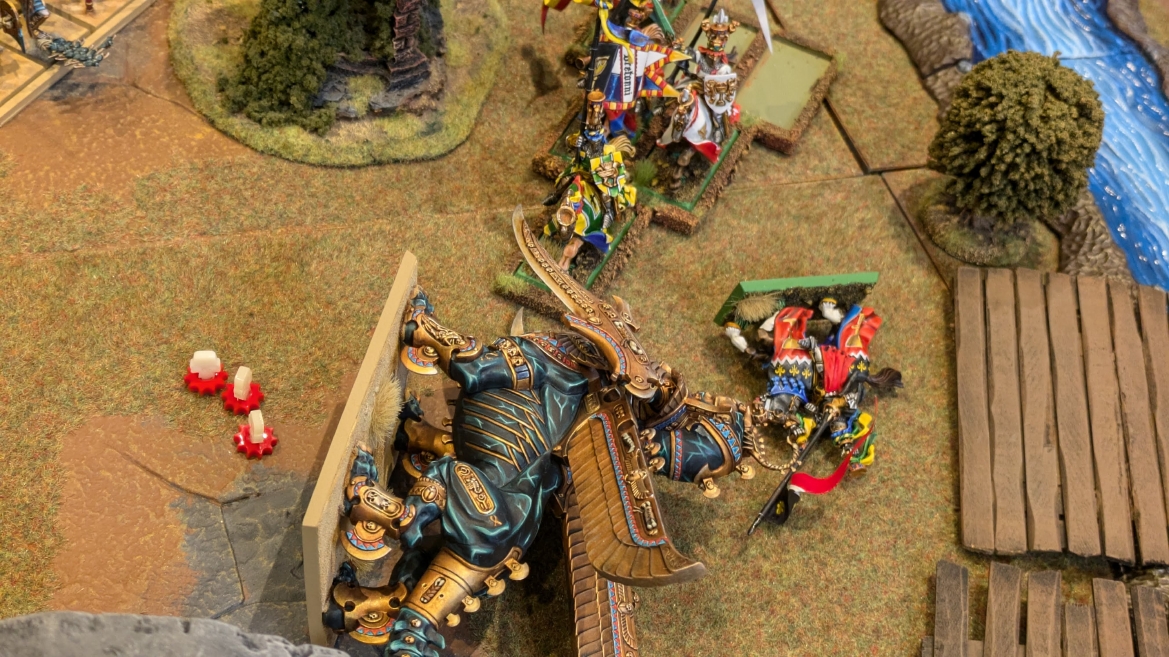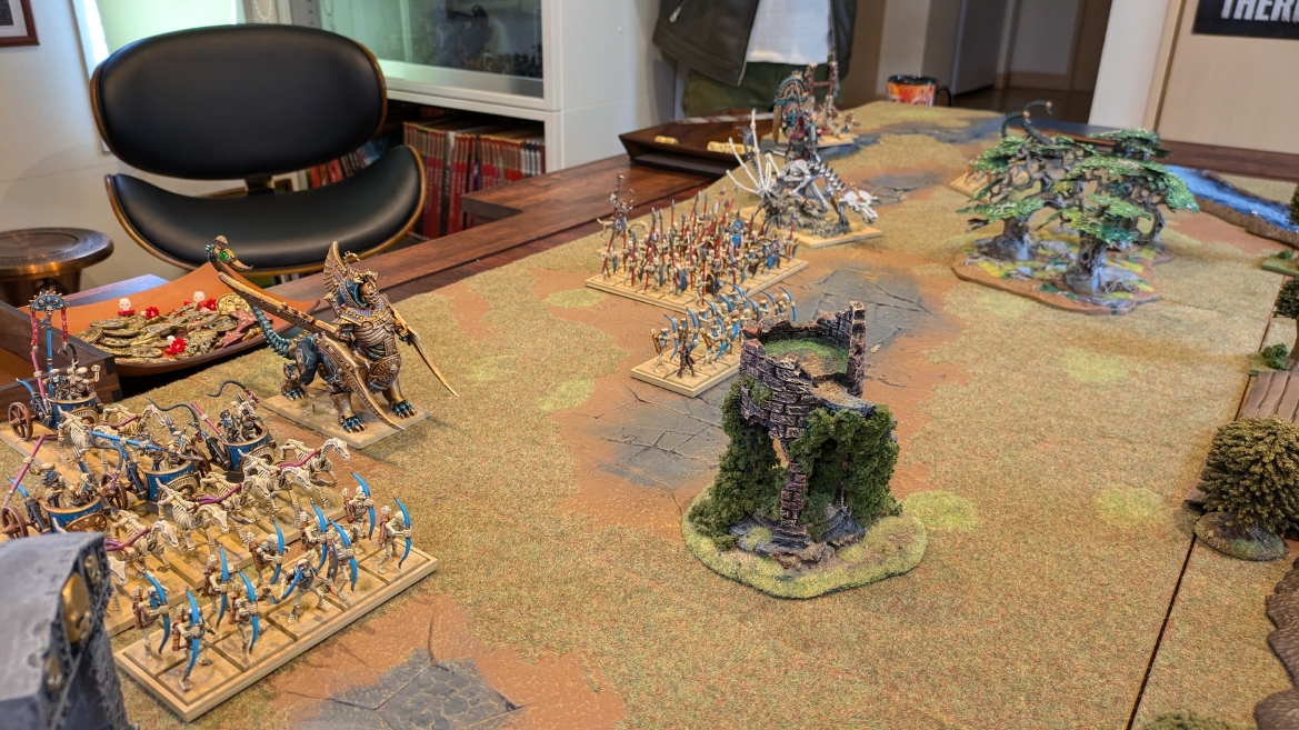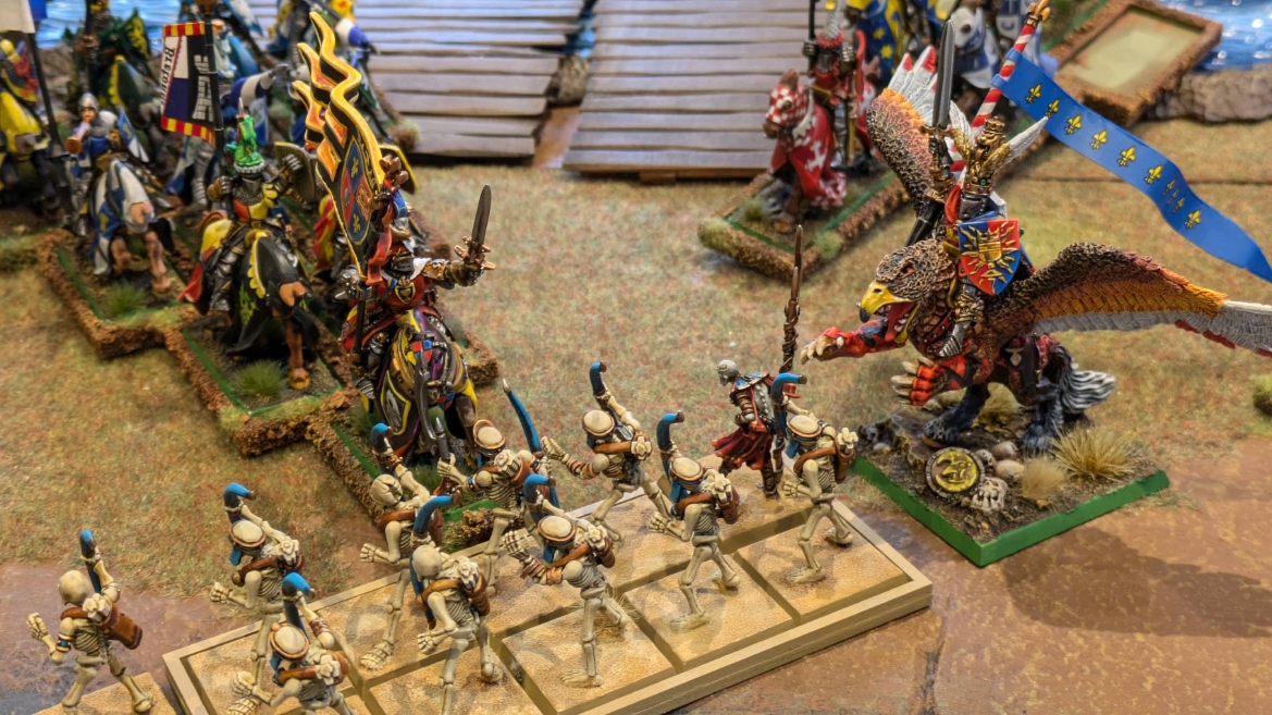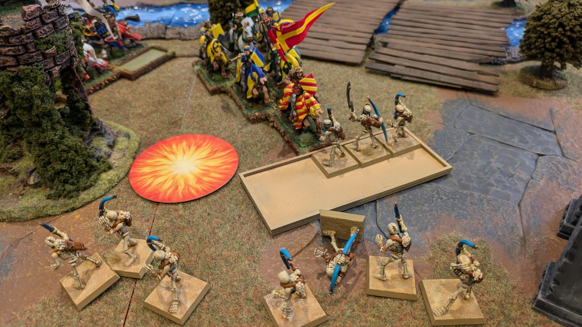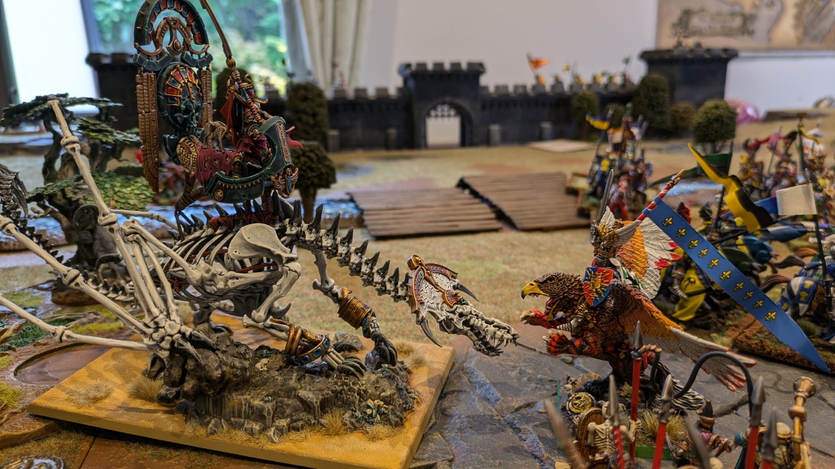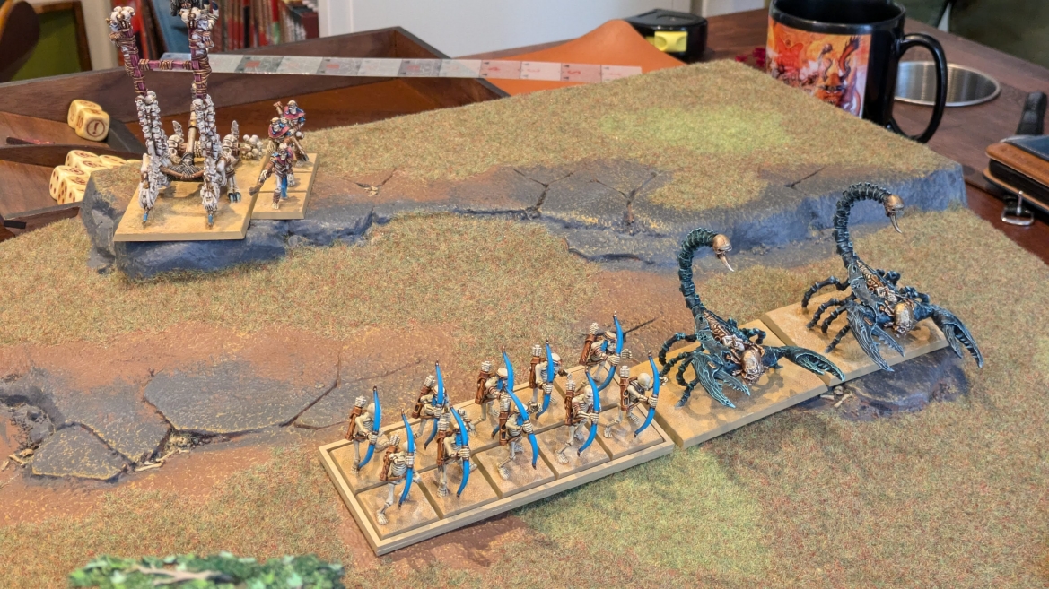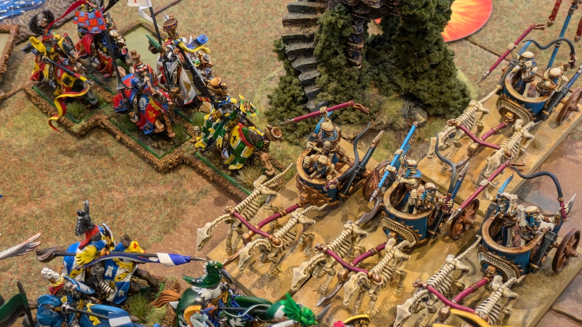 バトルセットアップ ![]() 戦場の構築はホストの役目、というのが昔の本に書いてありました。25年も前の本の記述をいまだに若干引きずってるので、今日の戦場は僕の独断で川を流しました。 今版のOWで川はディフィカルトテレイン(移動力マイナス1、突撃時は2D6の内良いほうの出目を排除)ということで、 昔よりは害が少ない感じで、割と気軽に川があってもいいのかなと思ったりしています。 川テレインは大昔に購入した他社製の塗装済みだったものです。よく売れたみたいで今でもたまに使ってる光景をSNS上で見かけることがありますね。 今回のバトル、テレインで変わり種を入れたので、シナリオ自体はシンプルにオープンバトルとすることにしました。 ![]() それにしても今回はウォーハンマー関連の雑談が盛り上がり過ぎちゃって、ゲームがなかなか始まらないって感じになっちゃってました(笑) そんでもって、ウォーハンマーは初期配置がものすごく悩むし、極端に言えば初期配置で勝敗が決まるっていう人もいるくらい、大事な時間です。 ああでもない、こうでもないとワイワイ話しながらやるのがまたたまらなく楽しいんですよねぇ。 途中、息子がちょくちょく覗きにきてました。 ブレトニア側初期配置 ![]() 背景のウォーハンマーフォートレス(城塞)は盤外においてあって、雰囲気演出用ではあるのですが、城塞を背に今まさに出撃!!という感じのブレトニア軍です。 ![]() ジェネラルのヒポグリフはどこかに隠そうか悩みましたが、意外に隠れられるところもないし、 ブレトニアの王たるものが敵の死角を狙って配置するということは絵的に美しくありません。 堂々と戦うのみ!(だからお前は勝てないとかいわないで) ![]() 城塞の正面門から戦場を覗く息子。「お父ちゃん、こっから見たらすごい迫力あってかっこいいよ!」って教えてくれる息子。かわいいやつ。 ![]() 確かにドラマチック!! トゥームキング側初期配置 ![]() トゥームキング側は川と廃墟となった塔により戦力配分にかなり苦慮されつつの初期配置となりました。 ![]() スケルトンウォーリアー35体ユニットは今回のはたさんの編成のキモのようですから、真ん中に据えられています。 プリンスとネクロテクトも合流され、防御力のみならず攻撃力も最大限に強化されています。 ここにはぶつかりたくないのが正直なところです。 ボーンドラゴンに対しては一発撃破の可能性があるだけでだいぶ気が楽なんですが、このユニットに対する対抗策が今のところ思いつきません。 ![]() スケルトンチャリオットの4期編成は横幅が広すぎてうまく配置できなかったため、1台はランク後方に。 ゲーム開始時に廃墟の塔は二人で話し合って位置決めしたのですが、この塔の位置が絶妙に邪魔過ぎてはたさんも悶絶されていました(笑)。 ![]() 丘の上にはスカルカタパルトが配置され、はたさんも今回こそはと意気込んでおられます。そして今回はトゥームスコーピオンは最初から配置。 増援戦力ですと後半までまったく出てこないというパターンもあり得るので今回は強襲用ではなく、通常戦力としての投入となっています。無難ではありますよね。 ![]() 初期配置が完了するといよいよ戦いが始まるというわくわく感がたまりませんね。すでにかなり満足度も高かったりで。 個人的にはブレトニア側は中央付近にナイトを集中配置できて、絵的にもゲーム的にも良さそうな感じで配置できたなと思っていました。 ![]() いよいよゲーム開始です。 ブレトニアは淑女の加護(全軍6+ワードセーブ、S5以上なら5+ワードセーブ)を得るために後攻を選択します。 「じゃ、僕は加護があるんで後攻でいきます〜」と宣言すると、「淑女への祈りが軽すぎる!!」と、はたさんから叱られました(笑)。 ![]() 1ターン目先行トゥームキングです。歩きながらアーサプの矢の効果で移動後マイナス修正無視で射撃するスケルトン。 と言っても5以上でヒット。そんなには当たりませんよと。 ![]() おおっと!ヨーメンに刺さりました。1体落馬。地味につらいですね、セーブ全くないっていうのも。 ![]() そしていよいよ射撃フェイズのメインディッシュ、スクリーミングスカルカタパルトから放たれた燃え盛る髑髏はちゃんと当たるでしょうか!!? ![]() ナイトオブザレルムに直撃ッ!!!!うわぁぁ〜〜〜一発目でやりましたね! 「閣下危ない」で淑女をかばった騎士も含め、合計7点のダメージを叩き込まれました。 これはさすがにヤバイかな?って思いましたが、セーブ修正加え5+アーマーセーブと5+ワードセーブの結果、ダメージゼロ!! ![]() いや〜これは凄い運がよかったです。しかし今回のカタパルト、幸先はいいですね。かなり。 さて、射撃フェイズも終わりほぼノーダメージで1ターン目前半を追えました。さぁ、ナイト達全軍前進です。突撃はさすがにまだできません。 射撃フェイズに眼前のスケルトンアーチャーに向けてファイアボールを放つプロフェテス! ![]() しかしミスキャストからの魔