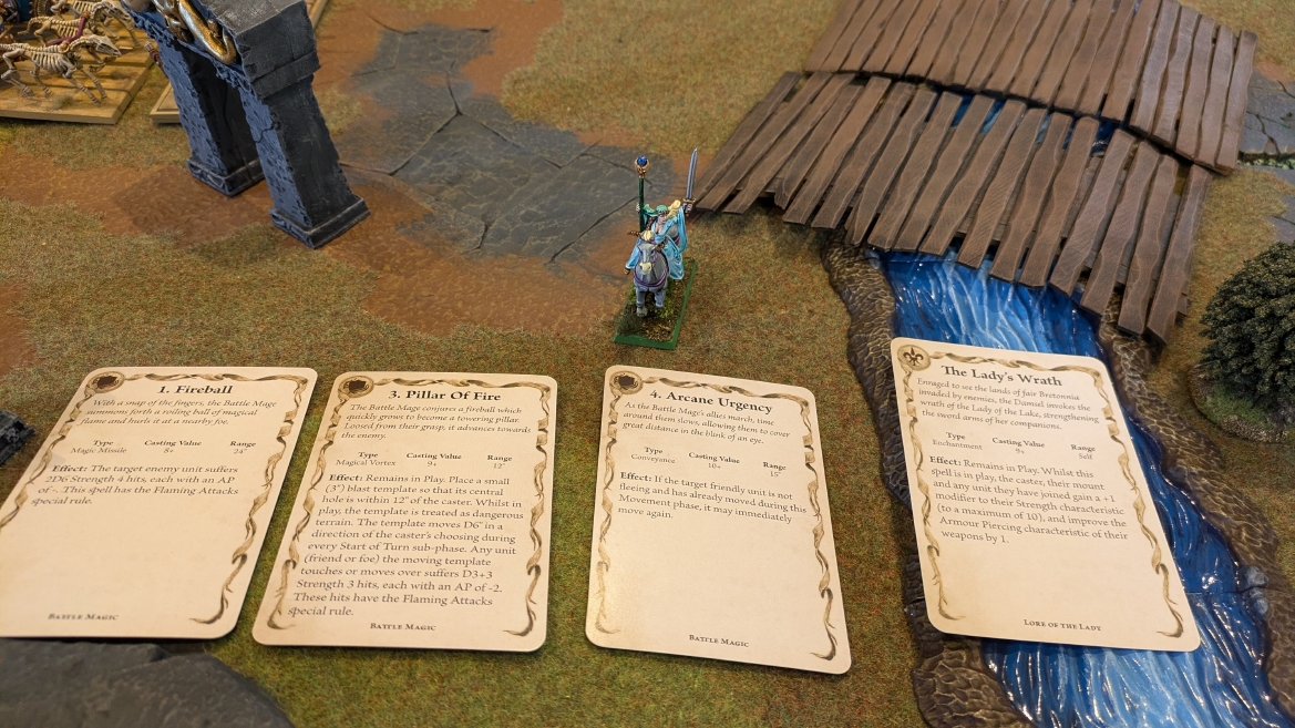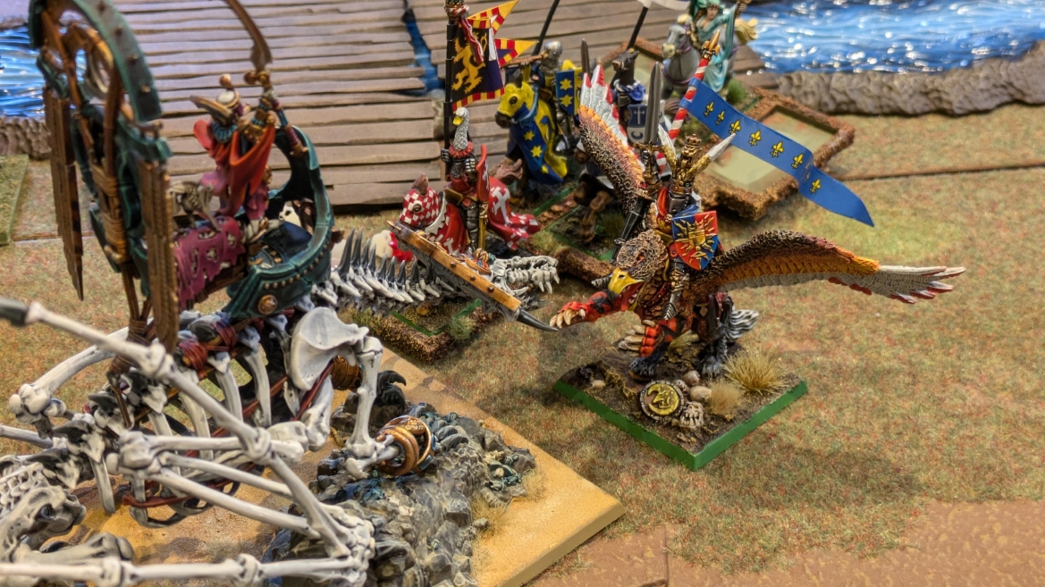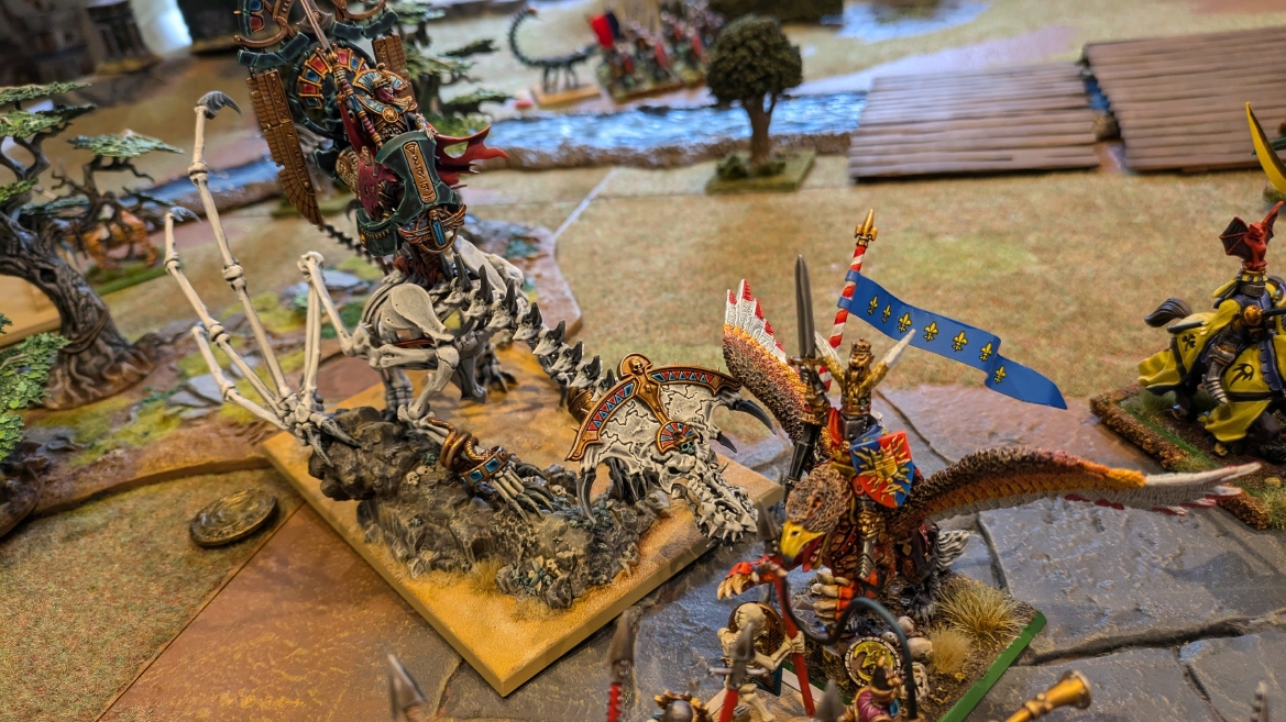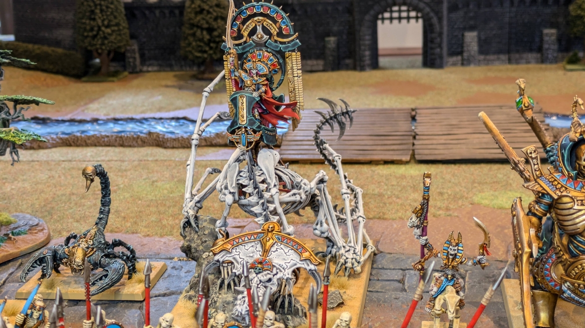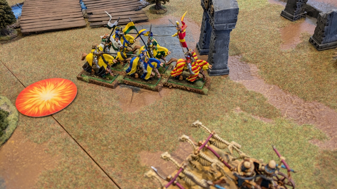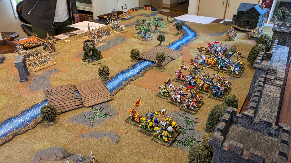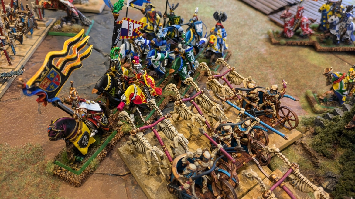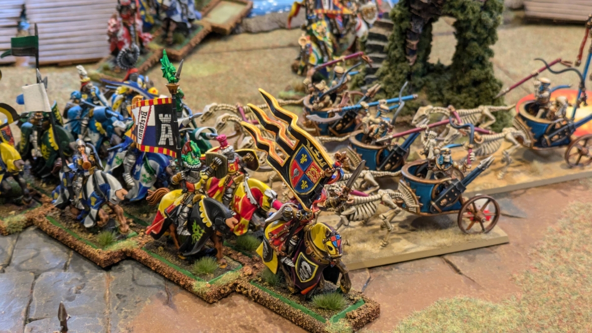 バトルセットアップ ![]() 戦場の構築はホストの役目、というのが昔の本に書いてありました。25年も前の本の記述をいまだに若干引きずってるので、今日の戦場は僕の独断で川を流しました。 今版のOWで川はディフィカルトテレイン(移動力マイナス1、突撃時は2D6の内良いほうの出目を排除)ということで、 昔よりは害が少ない感じで、割と気軽に川があってもいいのかなと思ったりしています。 川テレインは大昔に購入した他社製の塗装済みだったものです。よく売れたみたいで今でもたまに使ってる光景をSNS上で見かけることがありますね。 今回のバトル、テレインで変わり種を入れたので、シナリオ自体はシンプルにオープンバトルとすることにしました。 ![]() それにしても今回はウォーハンマー関連の雑談が盛り上がり過ぎちゃって、ゲームがなかなか始まらないって感じになっちゃってました(笑) そんでもって、ウォーハンマーは初期配置がものすごく悩むし、極端に言えば初期配置で勝敗が決まるっていう人もいるくらい、大事な時間です。 ああでもない、こうでもないとワイワイ話しながらやるのがまたたまらなく楽しいんですよねぇ。 途中、息子がちょくちょく覗きにきてました。 ブレトニア側初期配置 ![]() 背景のウォーハンマーフォートレス(城塞)は盤外においてあって、雰囲気演出用ではあるのですが、城塞を背に今まさに出撃!!という感じのブレトニア軍です。 ![]() ジェネラルのヒポグリフはどこかに隠そうか悩みましたが、意外に隠れられるところもないし、 ブレトニアの王たるものが敵の死角を狙って配置するということは絵的に美しくありません。 堂々と戦うのみ!(だからお前は勝てないとかいわないで) ![]() 城塞の正面門から戦場を覗く息子。「お父ちゃん、こっから見たらすごい迫力あってかっこいいよ!」って教えてくれる息子。かわいいやつ。 ![]() 確かにドラマチック!! トゥームキング側初期配置 ![]() トゥームキング側は川と廃墟となった塔により戦力配分にかなり苦慮されつつの初期配置となりました。 ![]() スケルトンウォーリアー35体ユニットは今回のはたさんの編成のキモのようですから、真ん中に据えられています。 プリンスとネクロテクトも合流され、防御力のみならず攻撃力も最大限に強化されています。 ここにはぶつかりたくないのが正直なところです。 ボーンドラゴンに対しては一発撃破の可能性があるだけでだいぶ気が楽なんですが、このユニットに対する対抗策が今のところ思いつきません。 ![]() スケルトンチャリオットの4期編成は横幅が広すぎてうまく配置できなかったため、1台はランク後方に。 ゲーム開始時に廃墟の塔は二人で話し合って位置決めしたのですが、この塔の位置が絶妙に邪魔過ぎてはたさんも悶絶されていました(笑)。 ![]() 丘の上にはスカルカタパルトが配置され、はたさんも今回こそはと意気込んでおられます。そして今回はトゥームスコーピオンは最初から配置。 増援戦力ですと後半までまったく出てこないというパターンもあり得るので今回は強襲用ではなく、通常戦力としての投入となっています。無難ではありますよね。 ![]() 初期配置が完了するといよいよ戦いが始まるというわくわく感がたまりませんね。すでにかなり満足度も高かったりで。 個人的にはブレトニア側は中央付近にナイトを集中配置できて、絵的にもゲーム的にも良さそうな感じで配置できたなと思っていました。 ![]() いよいよゲーム開始です。 ブレトニアは淑女の加護(全軍6+ワードセーブ、S5以上なら5+ワードセーブ)を得るために後攻を選択します。 「じゃ、僕は加護があるんで後攻でいきます〜」と宣言すると、「淑女への祈りが軽すぎる!!」と、はたさんから叱られました(笑)。 ![]() 1ターン目先行トゥームキングです。歩きながらアーサプの矢の効果で移動後マイナス修正無視で射撃するスケルトン。 と言っても5以上でヒット。そんなには当たりませんよと。 ![]() おおっと!ヨーメンに刺さりました。1体落馬。地味につらいですね、セーブ全くないっていうのも。 ![]() そしていよいよ射撃フェイズのメインディッシュ、スクリーミングスカルカタパルトから放たれた燃え盛る髑髏はちゃんと当たるでしょうか!!? ![]() ナイトオブザレルムに直撃ッ!!!!うわぁぁ〜〜〜一発目でやりましたね! 「閣下危ない」で淑女をかばった騎士も含め、合計7点のダメージを叩き込まれました。 これはさすがにヤバイかな?って思いましたが、セーブ修正加え5+アーマーセーブと5+ワードセーブの結果、ダメージゼロ!! ![]() いや〜これは凄い運がよかったです。しかし今回のカタパルト、幸先はいいですね。かなり。 さて、射撃フェイズも終わりほぼノーダメージで1ターン目前半を追えました。さぁ、ナイト達全軍前進です。突撃はさすがにまだできません。 射撃フェイズに眼前のスケルトンアーチャーに向けてファイアボールを放つプロフェテス! ![]() しかしミスキャストからの魔
