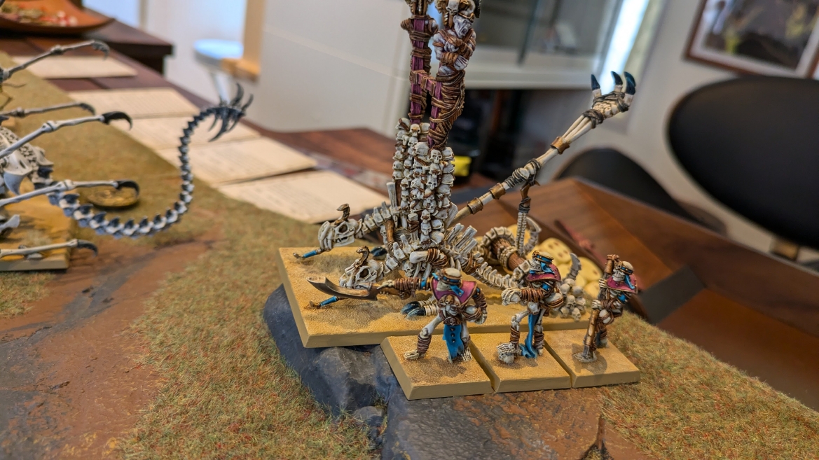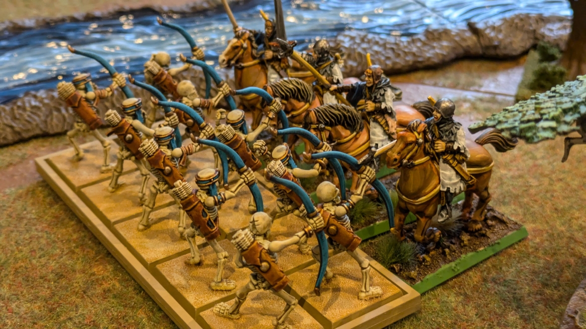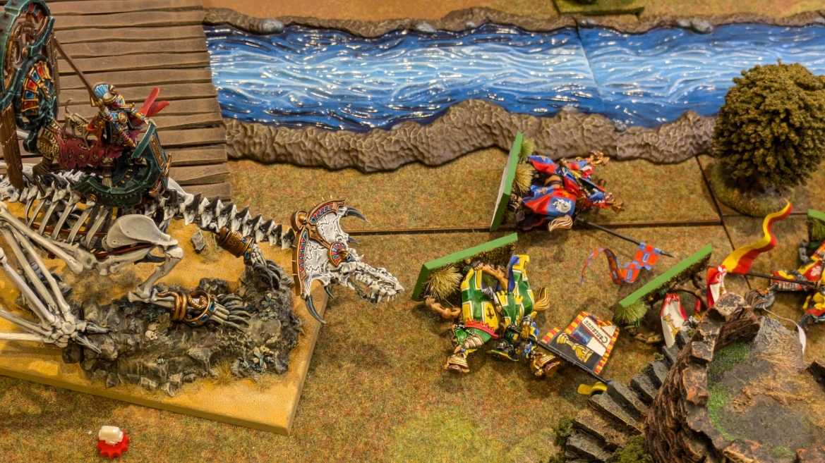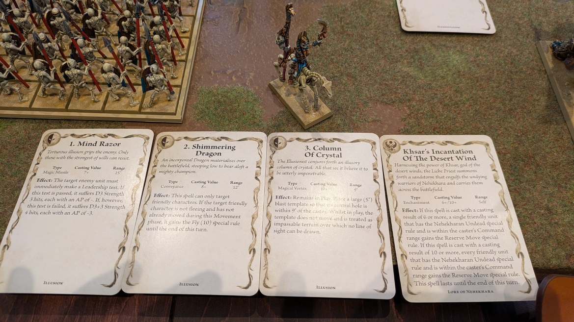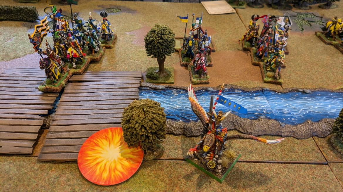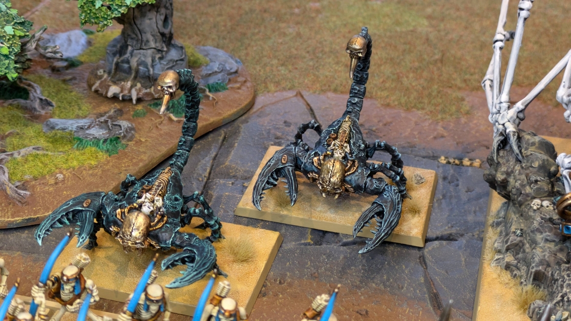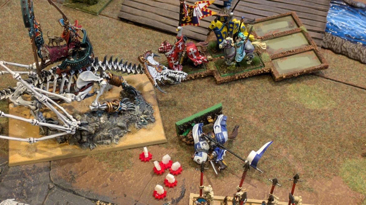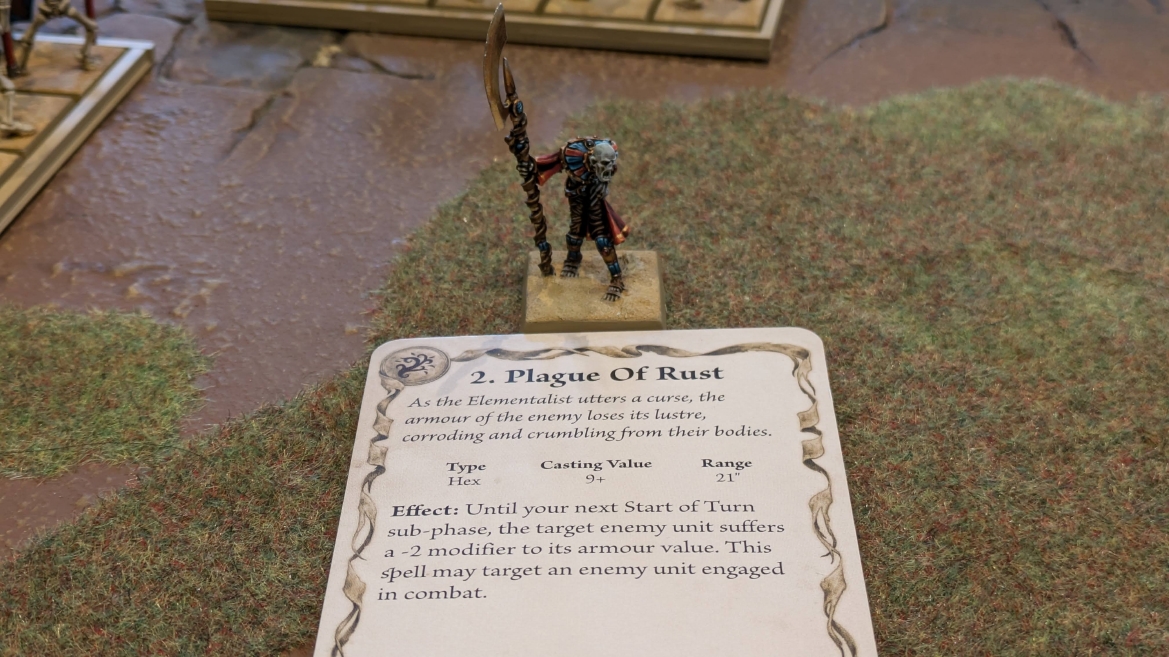 バトルセットアップ ![]() 戦場の構築はホストの役目、というのが昔の本に書いてありました。25年も前の本の記述をいまだに若干引きずってるので、今日の戦場は僕の独断で川を流しました。 今版のOWで川はディフィカルトテレイン(移動力マイナス1、突撃時は2D6の内良いほうの出目を排除)ということで、 昔よりは害が少ない感じで、割と気軽に川があってもいいのかなと思ったりしています。 川テレインは大昔に購入した他社製の塗装済みだったものです。よく売れたみたいで今でもたまに使ってる光景をSNS上で見かけることがありますね。 今回のバトル、テレインで変わり種を入れたので、シナリオ自体はシンプルにオープンバトルとすることにしました。 ![]() それにしても今回はウォーハンマー関連の雑談が盛り上がり過ぎちゃって、ゲームがなかなか始まらないって感じになっちゃってました(笑) そんでもって、ウォーハンマーは初期配置がものすごく悩むし、極端に言えば初期配置で勝敗が決まるっていう人もいるくらい、大事な時間です。 ああでもない、こうでもないとワイワイ話しながらやるのがまたたまらなく楽しいんですよねぇ。 途中、息子がちょくちょく覗きにきてました。 ブレトニア側初期配置 ![]() 背景のウォーハンマーフォートレス(城塞)は盤外においてあって、雰囲気演出用ではあるのですが、城塞を背に今まさに出撃!!という感じのブレトニア軍です。 ![]() ジェネラルのヒポグリフはどこかに隠そうか悩みましたが、意外に隠れられるところもないし、 ブレトニアの王たるものが敵の死角を狙って配置するということは絵的に美しくありません。 堂々と戦うのみ!(だからお前は勝てないとかいわないで) ![]() 城塞の正面門から戦場を覗く息子。「お父ちゃん、こっから見たらすごい迫力あってかっこいいよ!」って教えてくれる息子。かわいいやつ。 ![]() 確かにドラマチック!! トゥームキング側初期配置 ![]() トゥームキング側は川と廃墟となった塔により戦力配分にかなり苦慮されつつの初期配置となりました。 ![]() スケルトンウォーリアー35体ユニットは今回のはたさんの編成のキモのようですから、真ん中に据えられています。 プリンスとネクロテクトも合流され、防御力のみならず攻撃力も最大限に強化されています。 ここにはぶつかりたくないのが正直なところです。 ボーンドラゴンに対しては一発撃破の可能性があるだけでだいぶ気が楽なんですが、このユニットに対する対抗策が今のところ思いつきません。 ![]() スケルトンチャリオットの4期編成は横幅が広すぎてうまく配置できなかったため、1台はランク後方に。 ゲーム開始時に廃墟の塔は二人で話し合って位置決めしたのですが、この塔の位置が絶妙に邪魔過ぎてはたさんも悶絶されていました(笑)。 ![]() 丘の上にはスカルカタパルトが配置され、はたさんも今回こそはと意気込んでおられます。そして今回はトゥームスコーピオンは最初から配置。 増援戦力ですと後半までまったく出てこないというパターンもあり得るので今回は強襲用ではなく、通常戦力としての投入となっています。無難ではありますよね。 ![]() 初期配置が完了するといよいよ戦いが始まるというわくわく感がたまりませんね。すでにかなり満足度も高かったりで。 個人的にはブレトニア側は中央付近にナイトを集中配置できて、絵的にもゲーム的にも良さそうな感じで配置できたなと思っていました。 ![]() いよいよゲーム開始です。 ブレトニアは淑女の加護(全軍6+ワードセーブ、S5以上なら5+ワードセーブ)を得るために後攻を選択します。 「じゃ、僕は加護があるんで後攻でいきます〜」と宣言すると、「淑女への祈りが軽すぎる!!」と、はたさんから叱られました(笑)。 ![]() 1ターン目先行トゥームキングです。歩きながらアーサプの矢の効果で移動後マイナス修正無視で射撃するスケルトン。 と言っても5以上でヒット。そんなには当たりませんよと。 ![]() おおっと!ヨーメンに刺さりました。1体落馬。地味につらいですね、セーブ全くないっていうのも。 ![]() そしていよいよ射撃フェイズのメインディッシュ、スクリーミングスカルカタパルトから放たれた燃え盛る髑髏はちゃんと当たるでしょうか!!? ![]() ナイトオブザレルムに直撃ッ!!!!うわぁぁ〜〜〜一発目でやりましたね! 「閣下危ない」で淑女をかばった騎士も含め、合計7点のダメージを叩き込まれました。 これはさすがにヤバイかな?って思いましたが、セーブ修正加え5+アーマーセーブと5+ワードセーブの結果、ダメージゼロ!! ![]() いや〜これは凄い運がよかったです。しかし今回のカタパルト、幸先はいいですね。かなり。 さて、射撃フェイズも終わりほぼノーダメージで1ターン目前半を追えました。さぁ、ナイト達全軍前進です。突撃はさすがにまだできません。 射撃フェイズに眼前のスケルトンアーチャーに向けてファイアボールを放つプロフェテス! ![]() しかしミスキャストからの魔