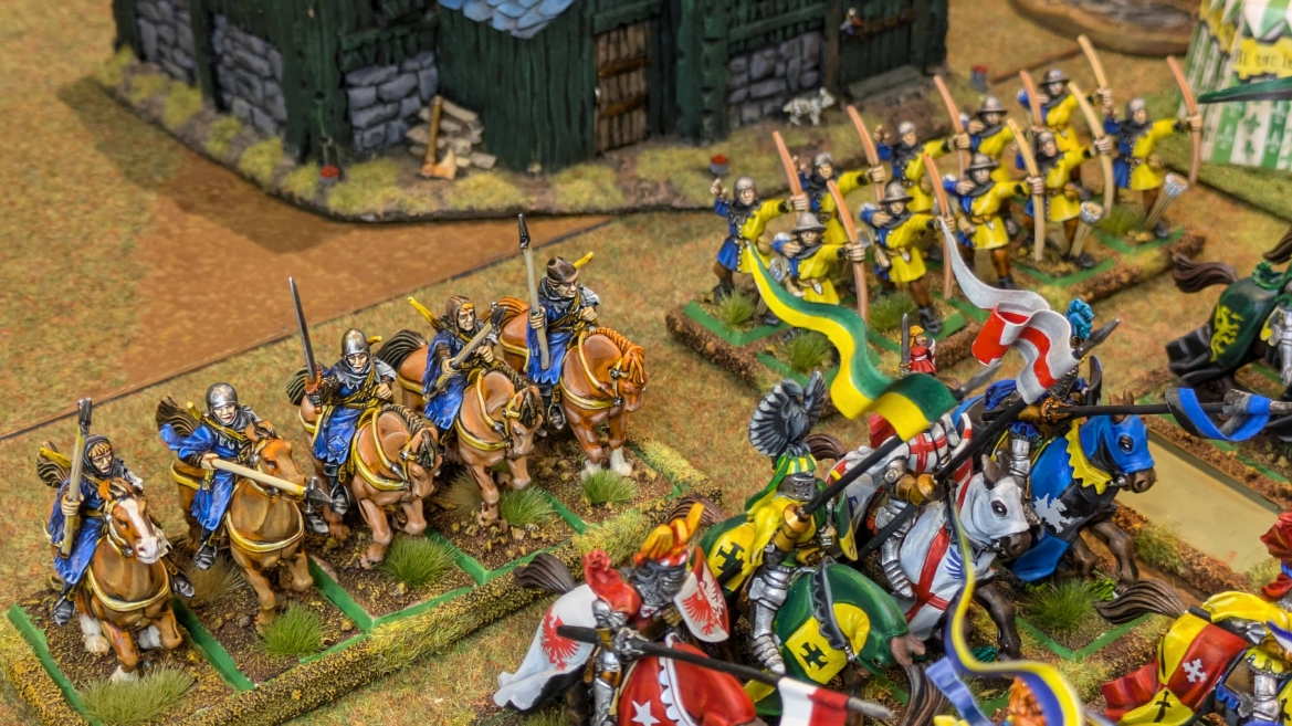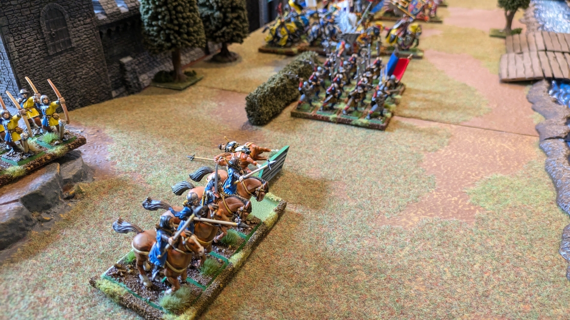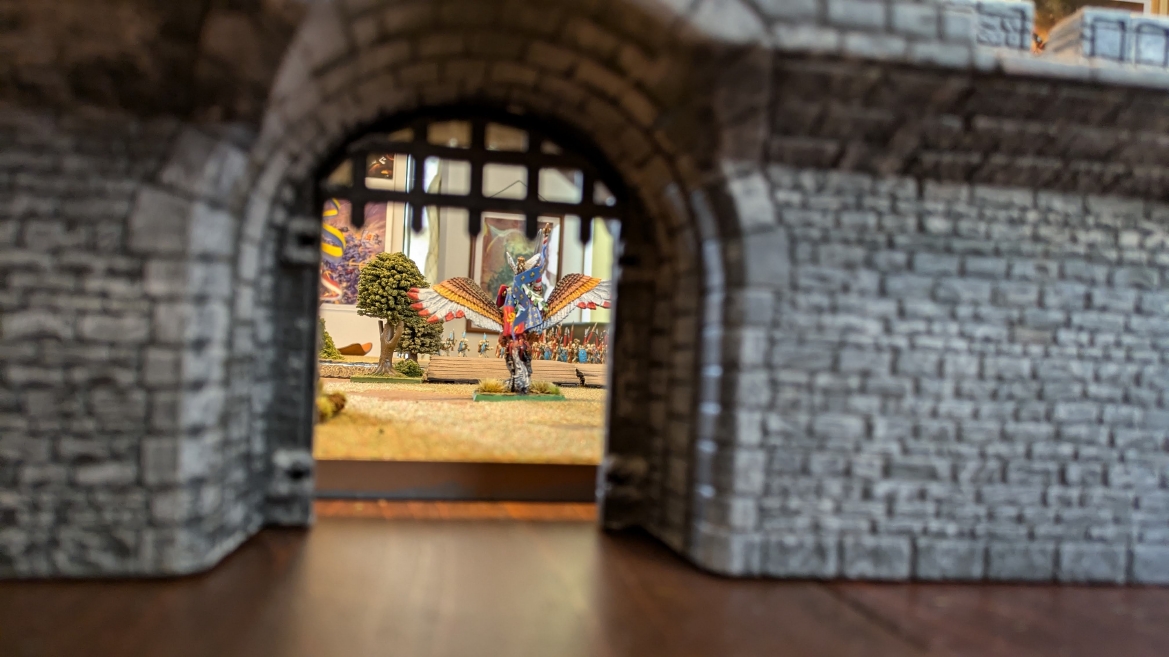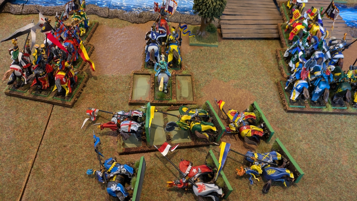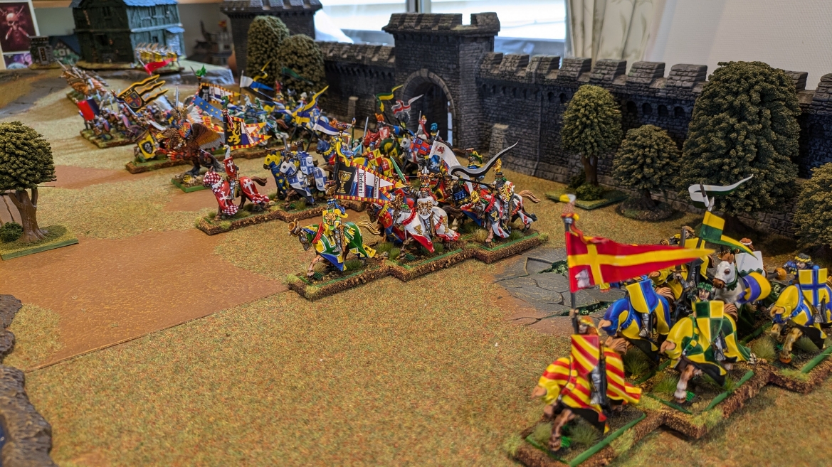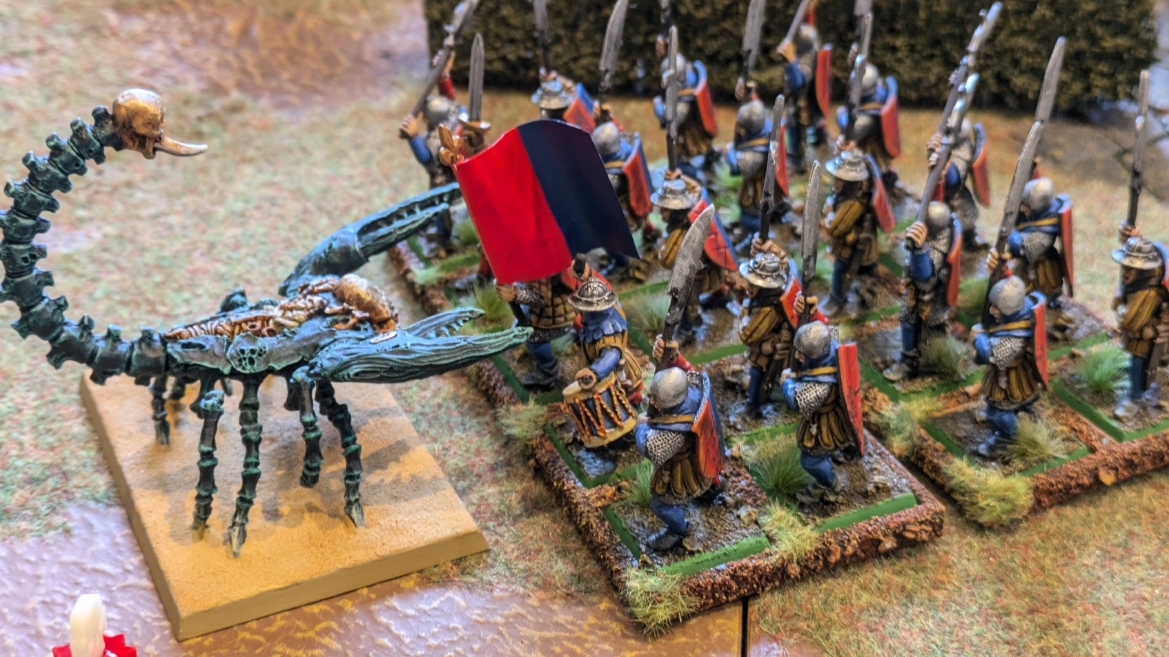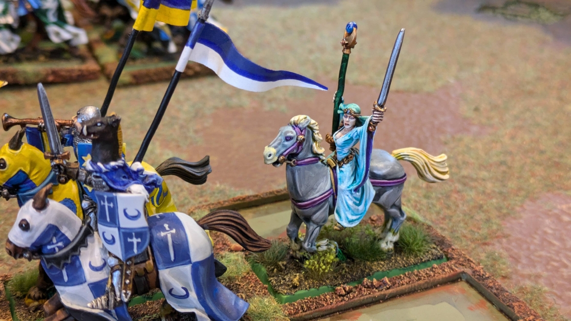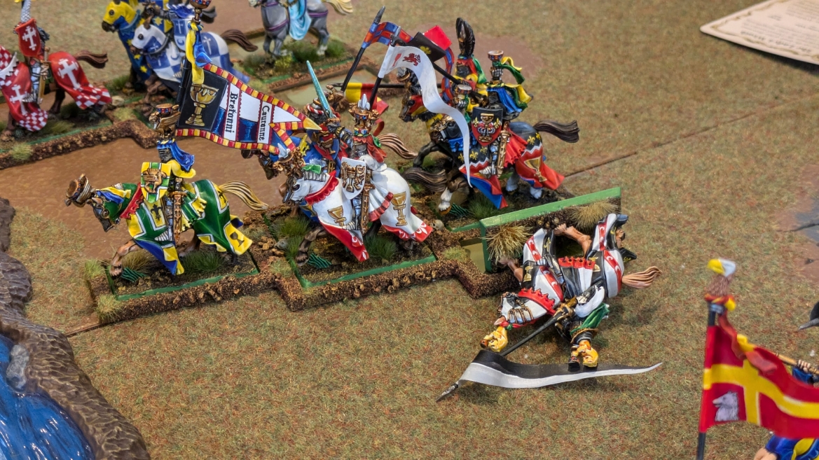 バトルセットアップ ![]() 戦場の構築はホストの役目、というのが昔の本に書いてありました。25年も前の本の記述をいまだに若干引きずってるので、今日の戦場は僕の独断で川を流しました。 今版のOWで川はディフィカルトテレイン(移動力マイナス1、突撃時は2D6の内良いほうの出目を排除)ということで、 昔よりは害が少ない感じで、割と気軽に川があってもいいのかなと思ったりしています。 川テレインは大昔に購入した他社製の塗装済みだったものです。よく売れたみたいで今でもたまに使ってる光景をSNS上で見かけることがありますね。 今回のバトル、テレインで変わり種を入れたので、シナリオ自体はシンプルにオープンバトルとすることにしました。 ![]() それにしても今回はウォーハンマー関連の雑談が盛り上がり過ぎちゃって、ゲームがなかなか始まらないって感じになっちゃってました(笑) そんでもって、ウォーハンマーは初期配置がものすごく悩むし、極端に言えば初期配置で勝敗が決まるっていう人もいるくらい、大事な時間です。 ああでもない、こうでもないとワイワイ話しながらやるのがまたたまらなく楽しいんですよねぇ。 途中、息子がちょくちょく覗きにきてました。 ブレトニア側初期配置 ![]() 背景のウォーハンマーフォートレス(城塞)は盤外においてあって、雰囲気演出用ではあるのですが、城塞を背に今まさに出撃!!という感じのブレトニア軍です。 ![]() ジェネラルのヒポグリフはどこかに隠そうか悩みましたが、意外に隠れられるところもないし、 ブレトニアの王たるものが敵の死角を狙って配置するということは絵的に美しくありません。 堂々と戦うのみ!(だからお前は勝てないとかいわないで) ![]() 城塞の正面門から戦場を覗く息子。「お父ちゃん、こっから見たらすごい迫力あってかっこいいよ!」って教えてくれる息子。かわいいやつ。 ![]() 確かにドラマチック!! トゥームキング側初期配置 ![]() トゥームキング側は川と廃墟となった塔により戦力配分にかなり苦慮されつつの初期配置となりました。 ![]() スケルトンウォーリアー35体ユニットは今回のはたさんの編成のキモのようですから、真ん中に据えられています。 プリンスとネクロテクトも合流され、防御力のみならず攻撃力も最大限に強化されています。 ここにはぶつかりたくないのが正直なところです。 ボーンドラゴンに対しては一発撃破の可能性があるだけでだいぶ気が楽なんですが、このユニットに対する対抗策が今のところ思いつきません。 ![]() スケルトンチャリオットの4期編成は横幅が広すぎてうまく配置できなかったため、1台はランク後方に。 ゲーム開始時に廃墟の塔は二人で話し合って位置決めしたのですが、この塔の位置が絶妙に邪魔過ぎてはたさんも悶絶されていました(笑)。 ![]() 丘の上にはスカルカタパルトが配置され、はたさんも今回こそはと意気込んでおられます。そして今回はトゥームスコーピオンは最初から配置。 増援戦力ですと後半までまったく出てこないというパターンもあり得るので今回は強襲用ではなく、通常戦力としての投入となっています。無難ではありますよね。 ![]() 初期配置が完了するといよいよ戦いが始まるというわくわく感がたまりませんね。すでにかなり満足度も高かったりで。 個人的にはブレトニア側は中央付近にナイトを集中配置できて、絵的にもゲーム的にも良さそうな感じで配置できたなと思っていました。 ![]() いよいよゲーム開始です。 ブレトニアは淑女の加護(全軍6+ワードセーブ、S5以上なら5+ワードセーブ)を得るために後攻を選択します。 「じゃ、僕は加護があるんで後攻でいきます〜」と宣言すると、「淑女への祈りが軽すぎる!!」と、はたさんから叱られました(笑)。 ![]() 1ターン目先行トゥームキングです。歩きながらアーサプの矢の効果で移動後マイナス修正無視で射撃するスケルトン。 と言っても5以上でヒット。そんなには当たりませんよと。 ![]() おおっと!ヨーメンに刺さりました。1体落馬。地味につらいですね、セーブ全くないっていうのも。 ![]() そしていよいよ射撃フェイズのメインディッシュ、スクリーミングスカルカタパルトから放たれた燃え盛る髑髏はちゃんと当たるでしょうか!!? ![]() ナイトオブザレルムに直撃ッ!!!!うわぁぁ〜〜〜一発目でやりましたね! 「閣下危ない」で淑女をかばった騎士も含め、合計7点のダメージを叩き込まれました。 これはさすがにヤバイかな?って思いましたが、セーブ修正加え5+アーマーセーブと5+ワードセーブの結果、ダメージゼロ!! ![]() いや〜これは凄い運がよかったです。しかし今回のカタパルト、幸先はいいですね。かなり。 さて、射撃フェイズも終わりほぼノーダメージで1ターン目前半を追えました。さぁ、ナイト達全軍前進です。突撃はさすがにまだできません。 射撃フェイズに眼前のスケルトンアーチャーに向けてファイアボールを放つプロフェテス! ![]() しかしミスキャストからの魔