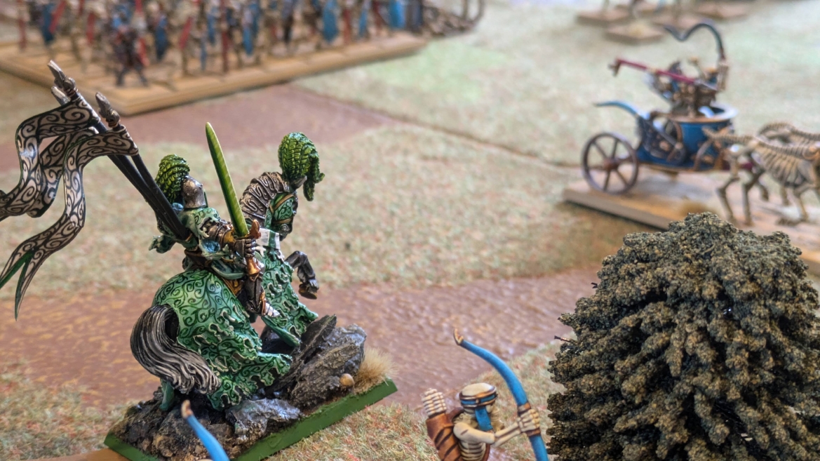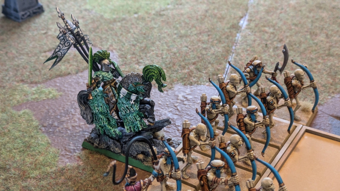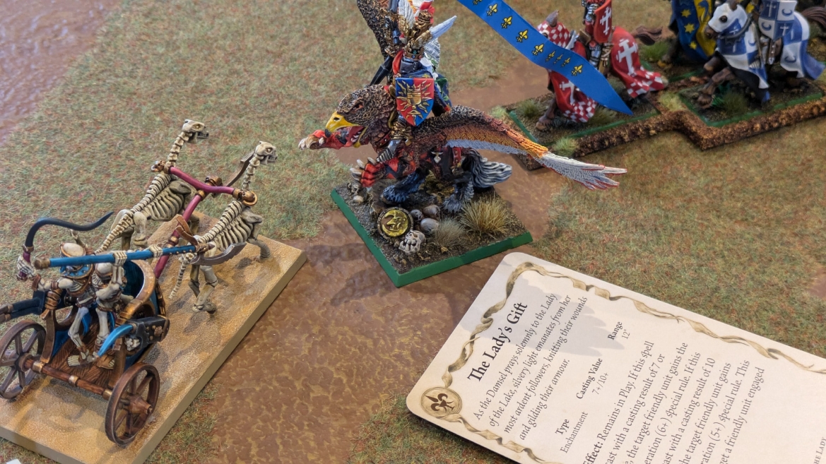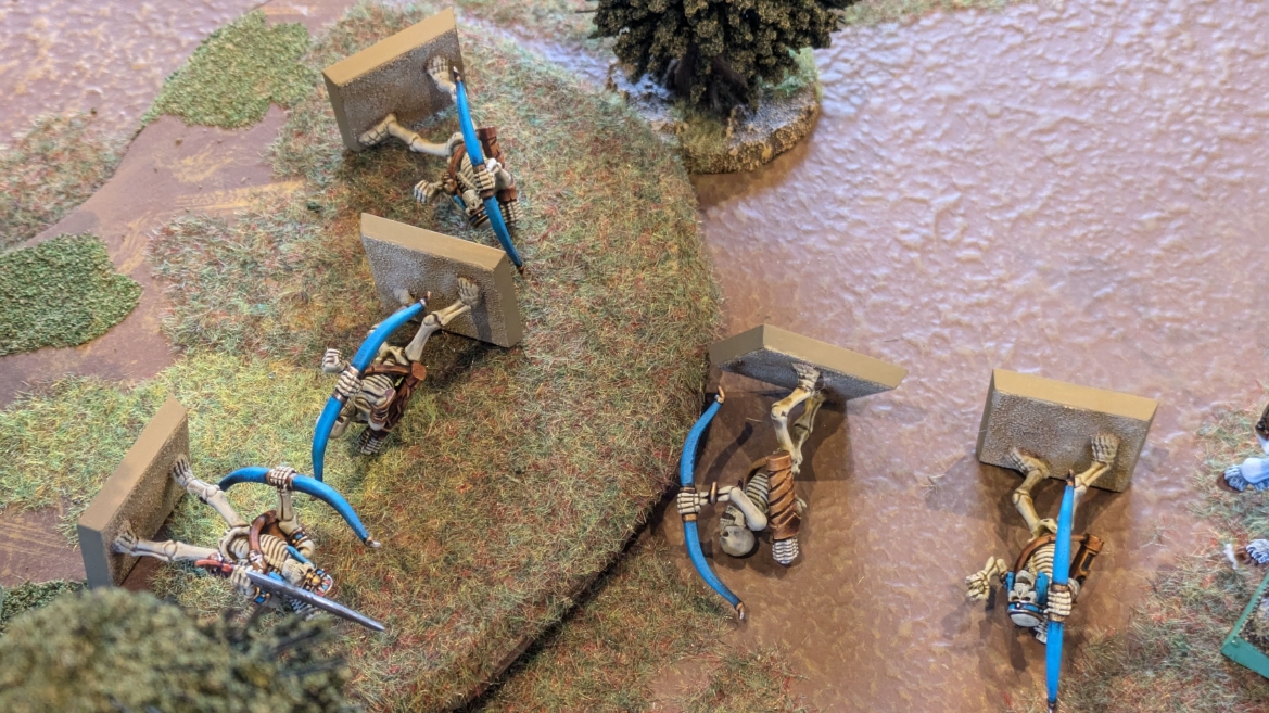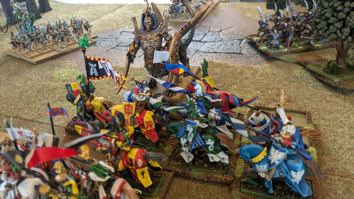 ブレトニアの弓兵が高台から矢を放ち、トゥームキングの軍勢を混乱させる一方で、騎士団は突撃を行い、一時的に敵を後退させる成果を得た。