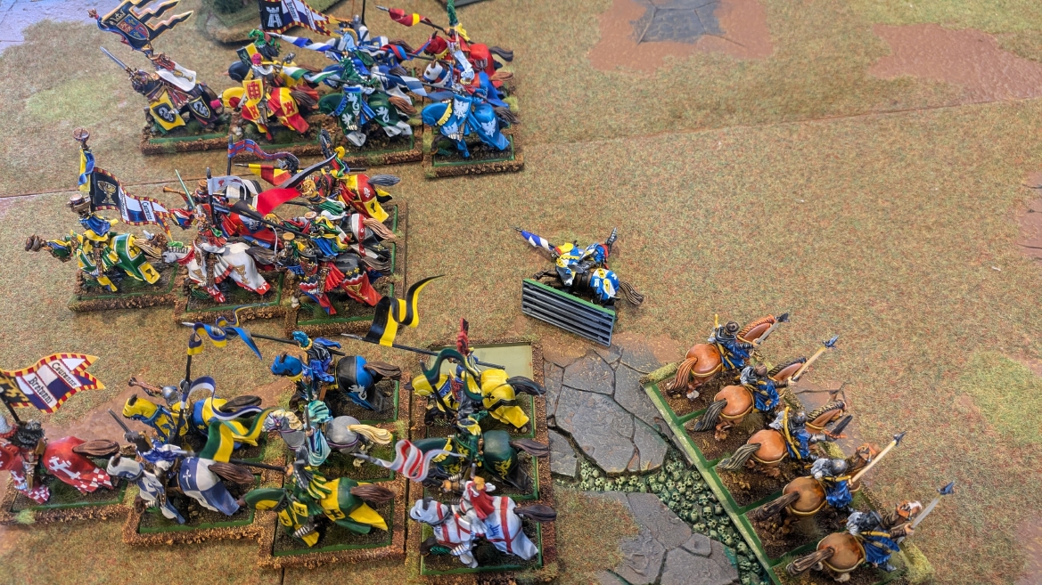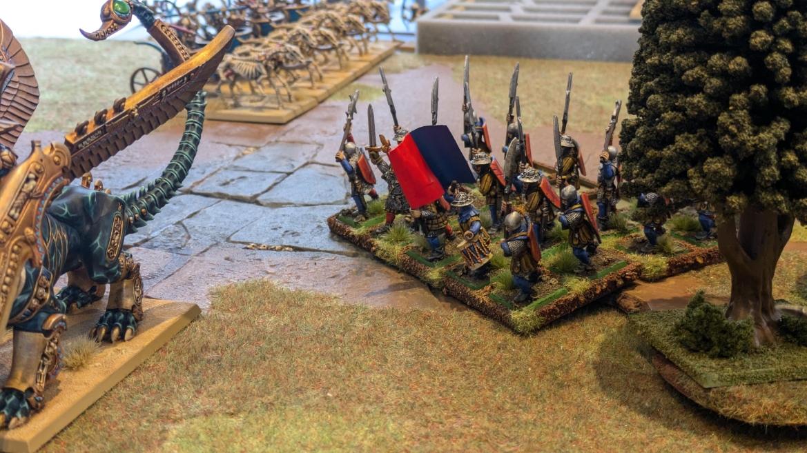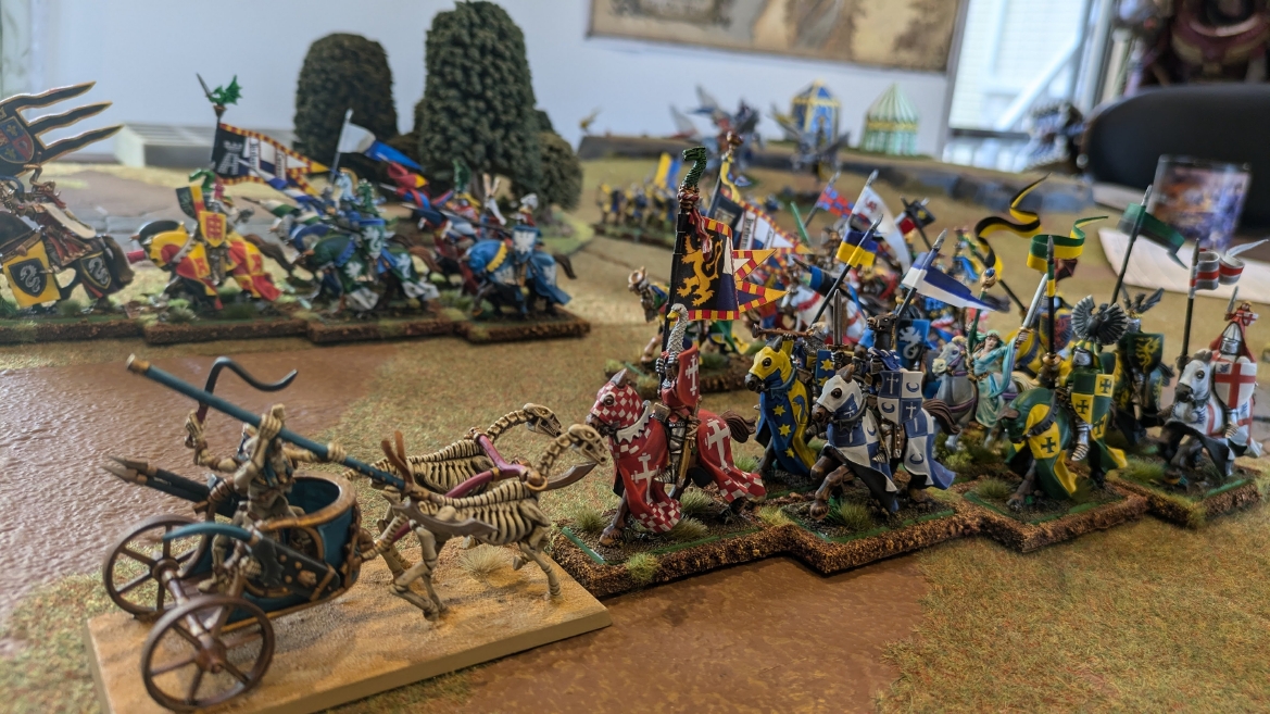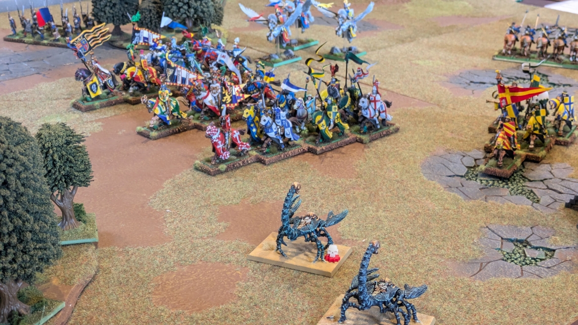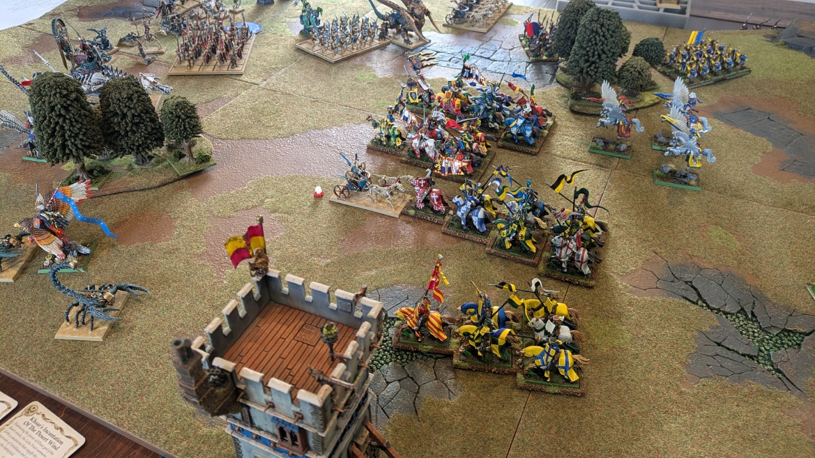 ブレトニアの弓兵が高台から矢を放ち、トゥームキングの軍勢を混乱させる一方で、騎士団は突撃を行い、一時的に敵を後退させる成果を得た。