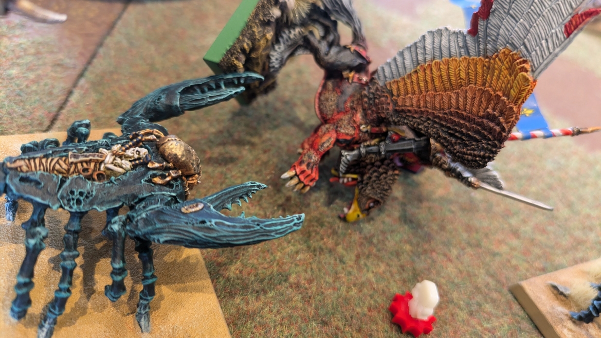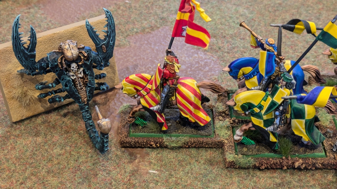一騎打ちを挑むバトルスタンダードベアラー。(これはルールをミスしていて、モンスターに対し一騎打ちは宣言できませんでした)