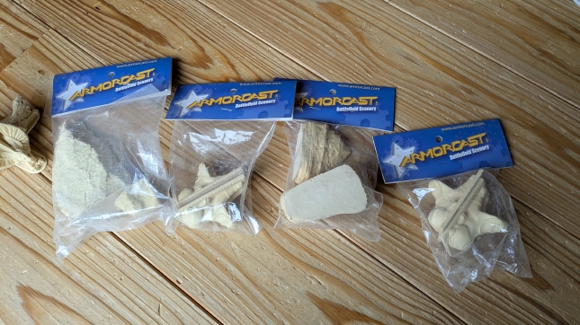 最近再販された公式のプラ製丘とフォージワールド製のオフィシャルテレイン(崩れたピラミッドと崩れた円錐柱)以外はアーマーキャスト社製のエジプト風テレインです。