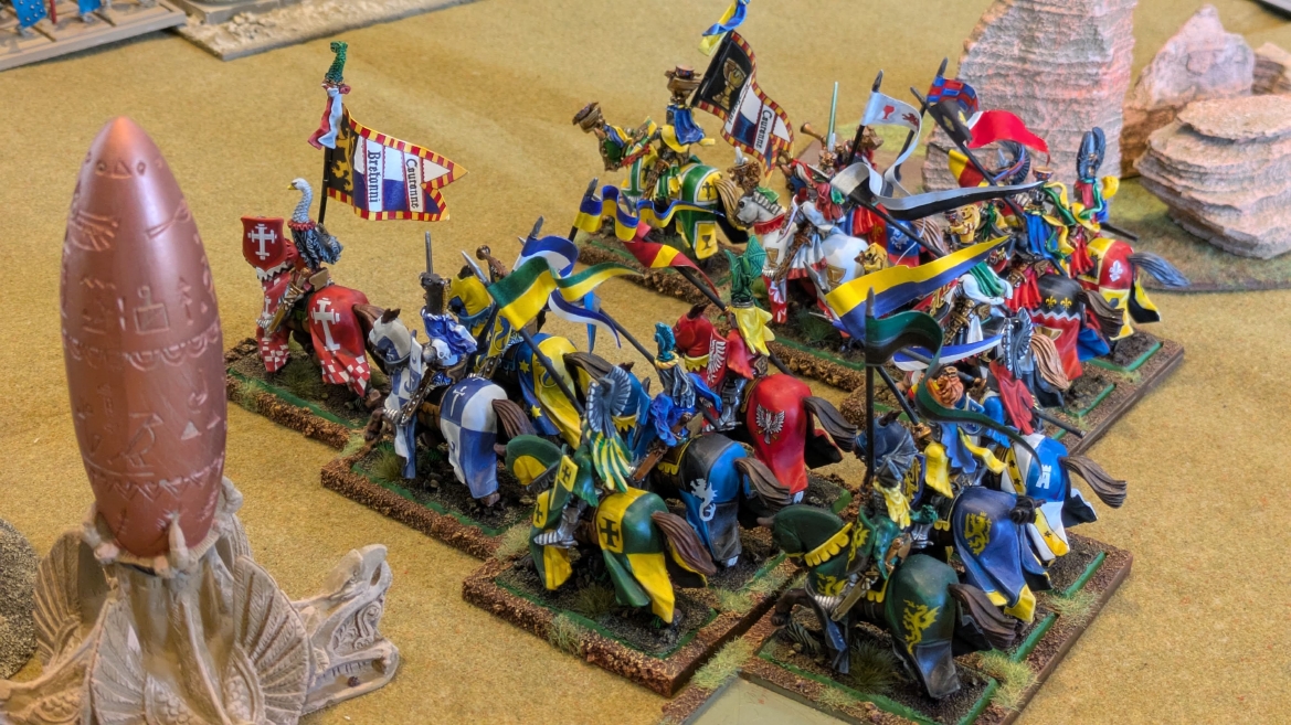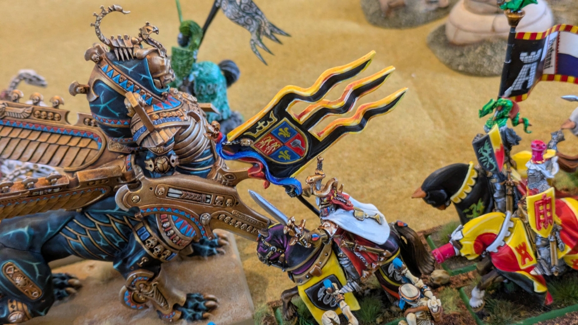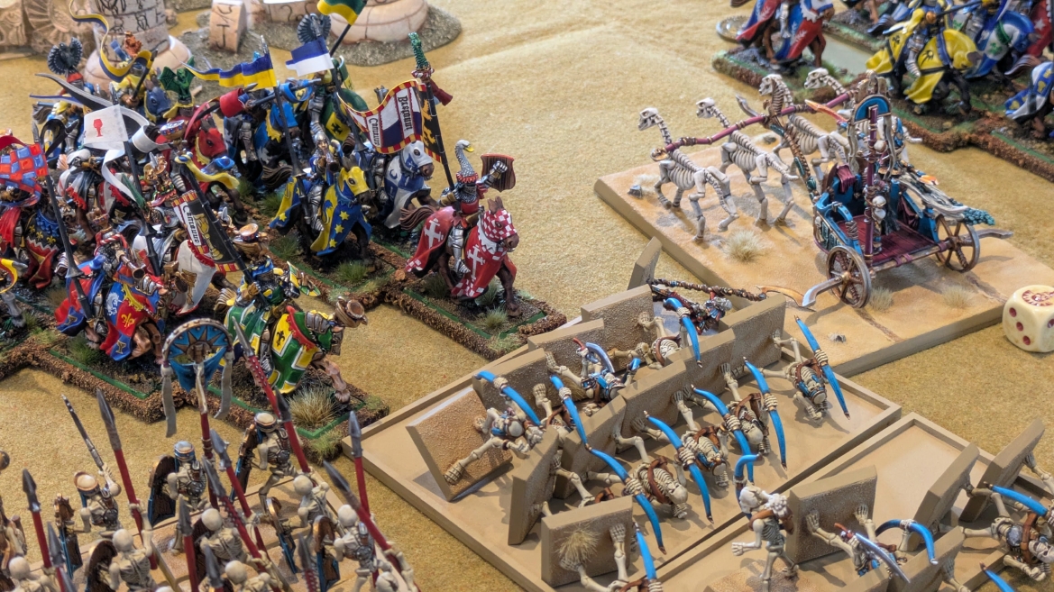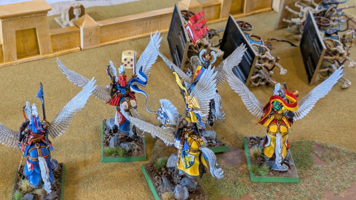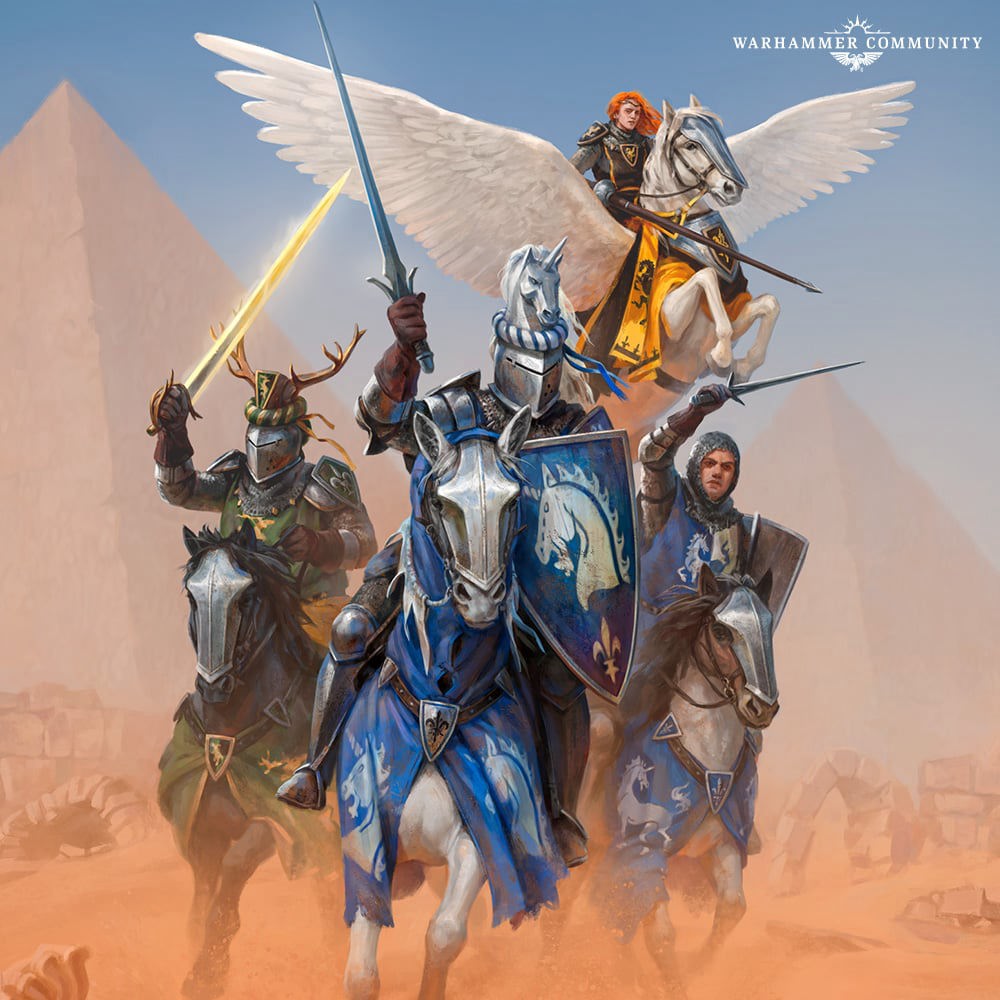 馬蹄の轟音が砂漠を震わせ、聖なる旗の下、騎士たちはトゥームキングの骸骨軍勢を無慈悲に蹂躙する。