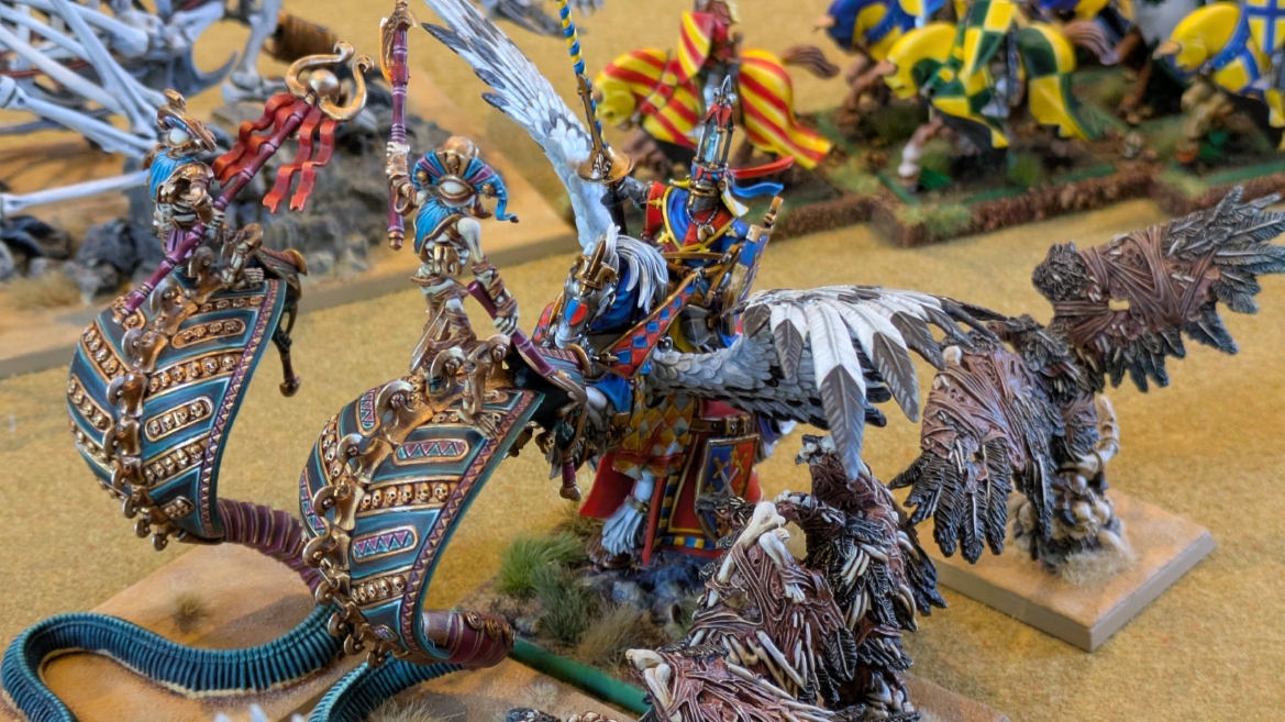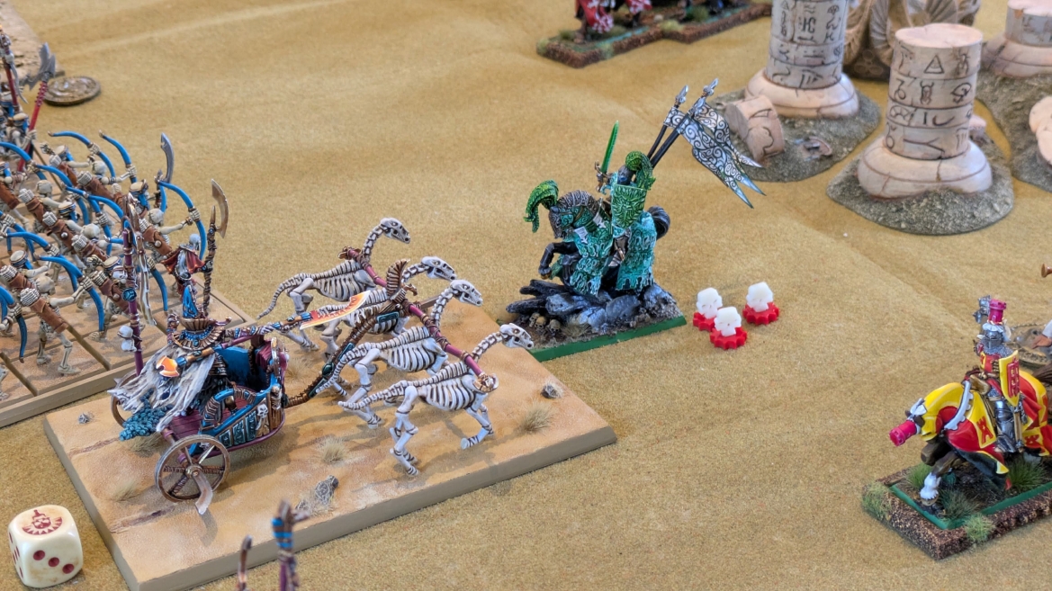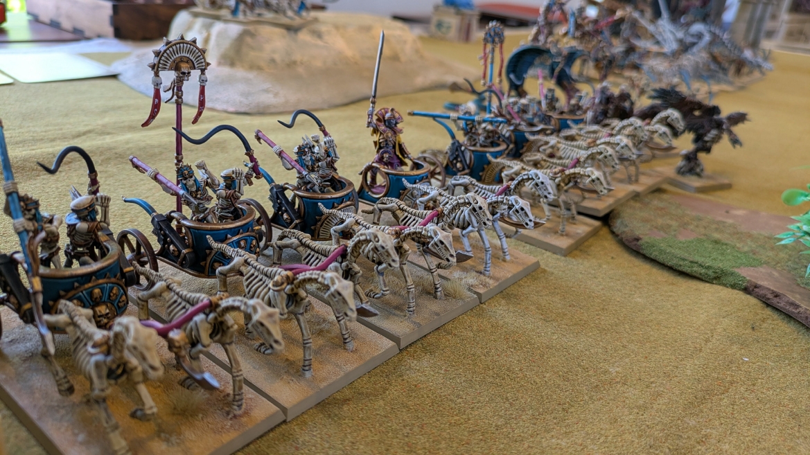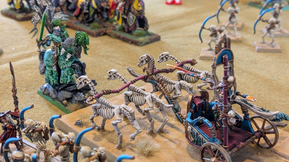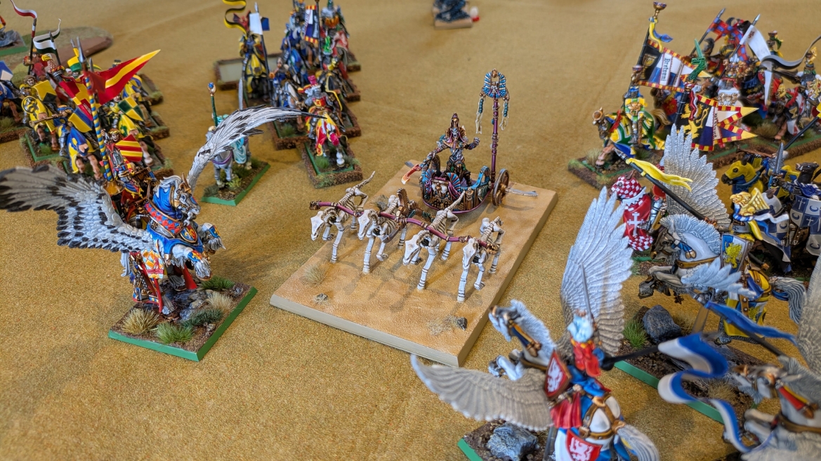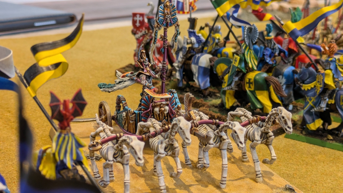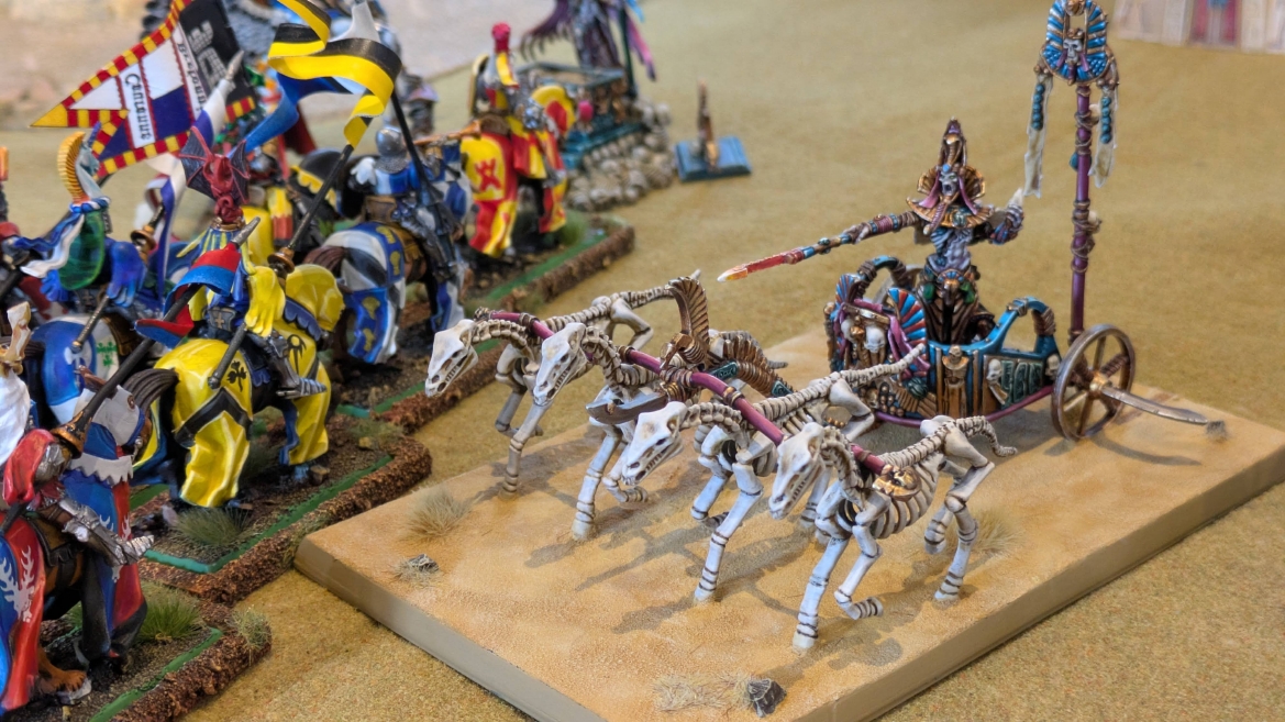 その戦場の中心、不死の王セトラは神々のチャリオットに騎乗し、迫りくるブレトニア騎士を見据えていた。