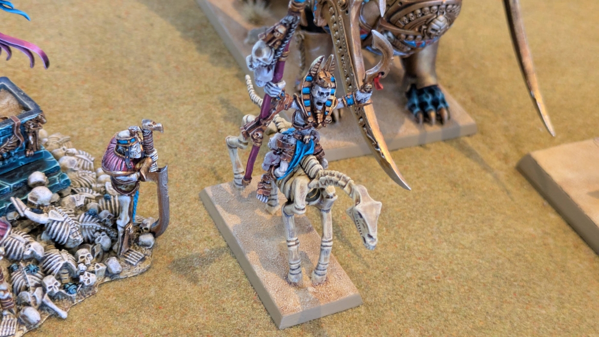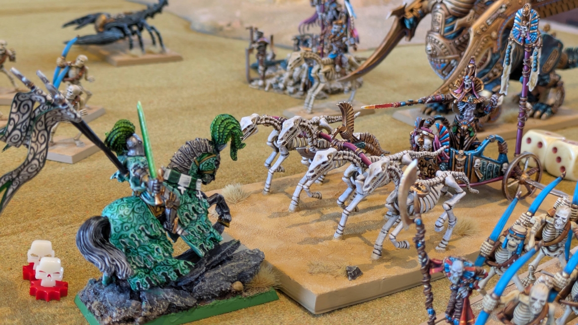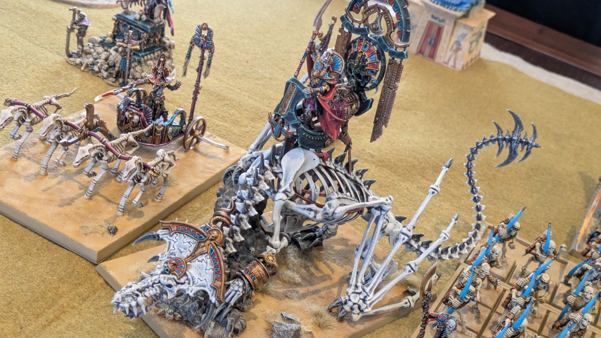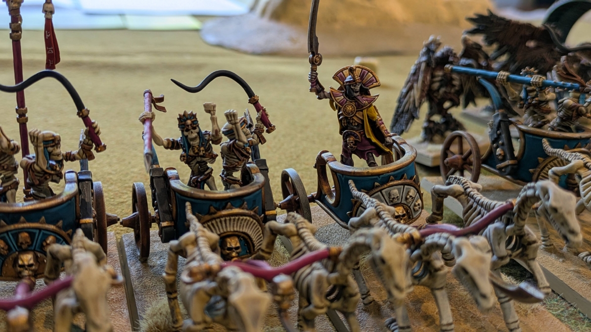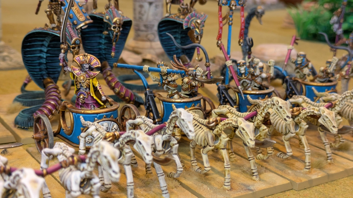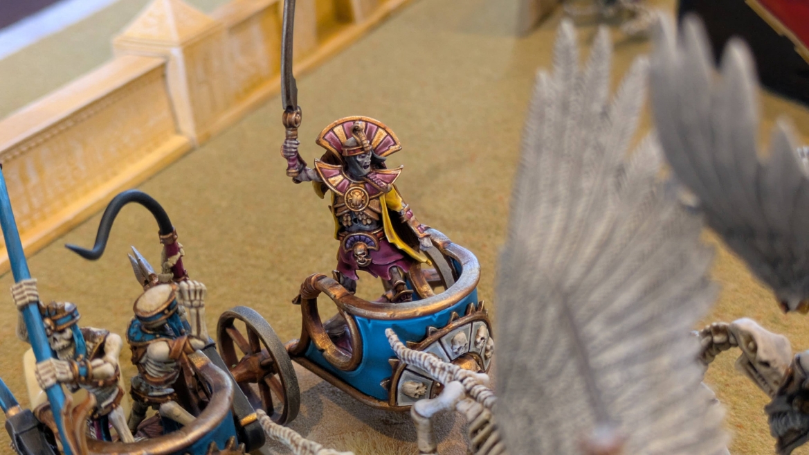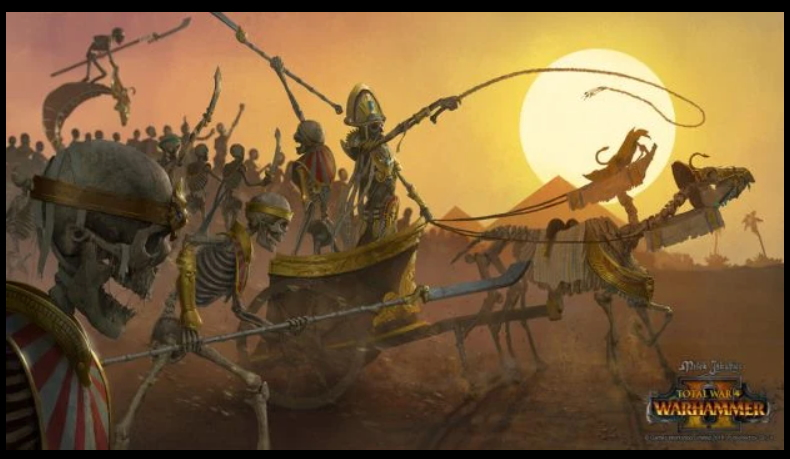 セトラは刃を振り上げ、砂漠が呪いの力でうねり始める。そして、彼はチャリオットを駆り、骸骨の戦馬が嘶く中、ブレトニアの騎兵へと自ら突撃する。
