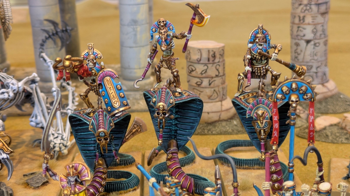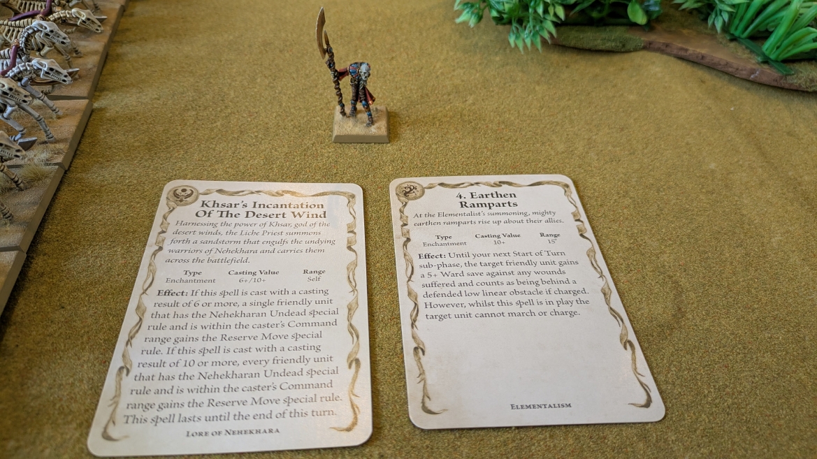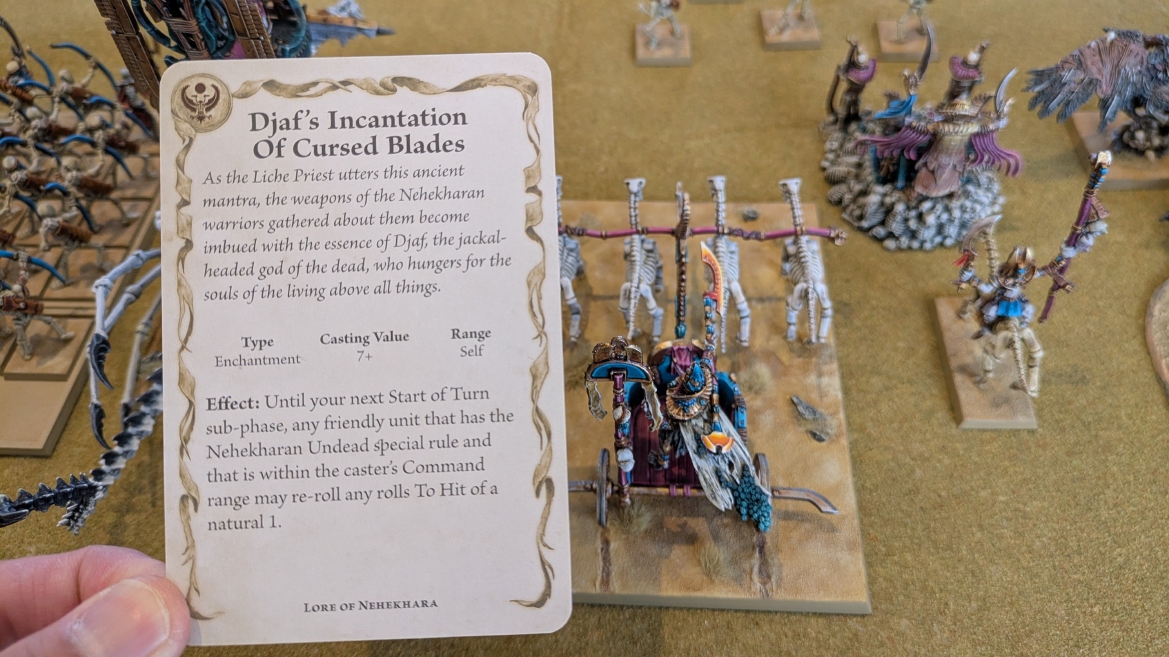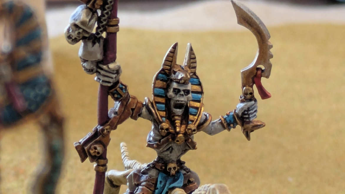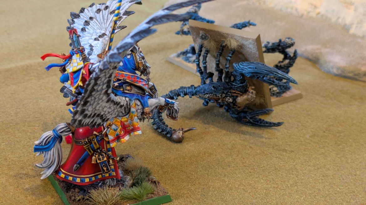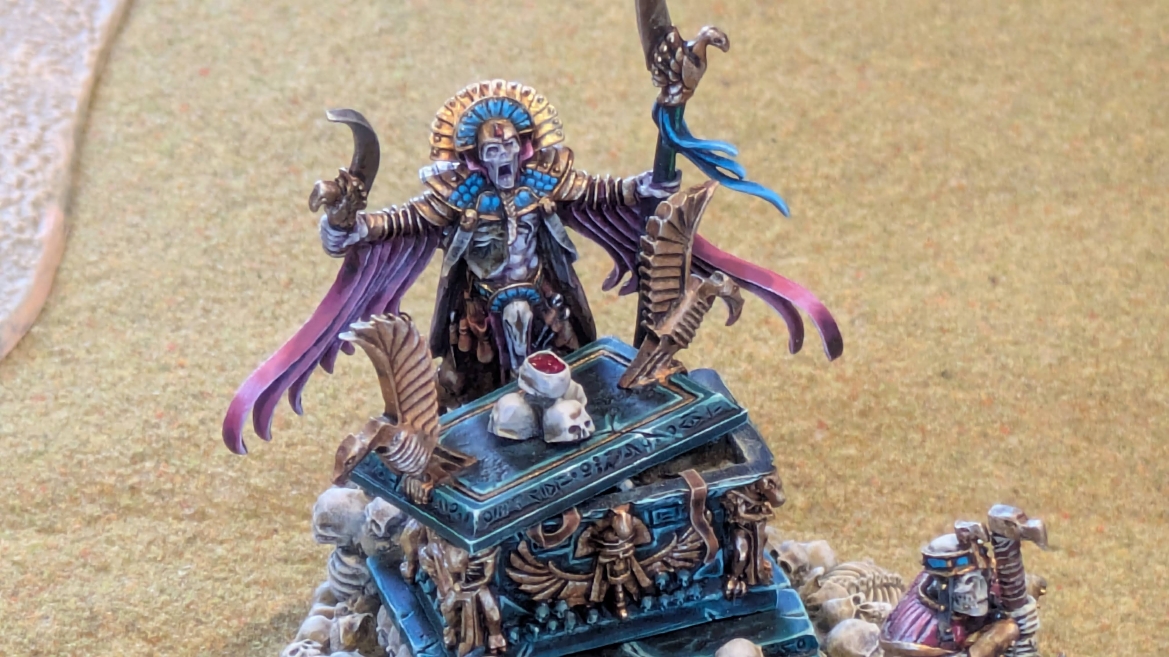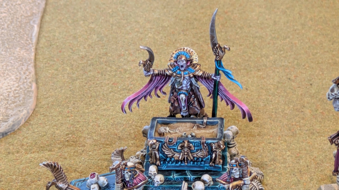 セトラは刃を振り上げ、砂漠が呪いの力でうねり始める。そして、彼はチャリオットを駆り、骸骨の戦馬が嘶く中、ブレトニアの騎兵へと自ら突撃する。
