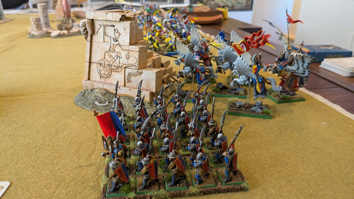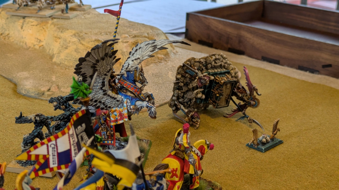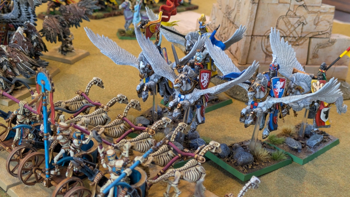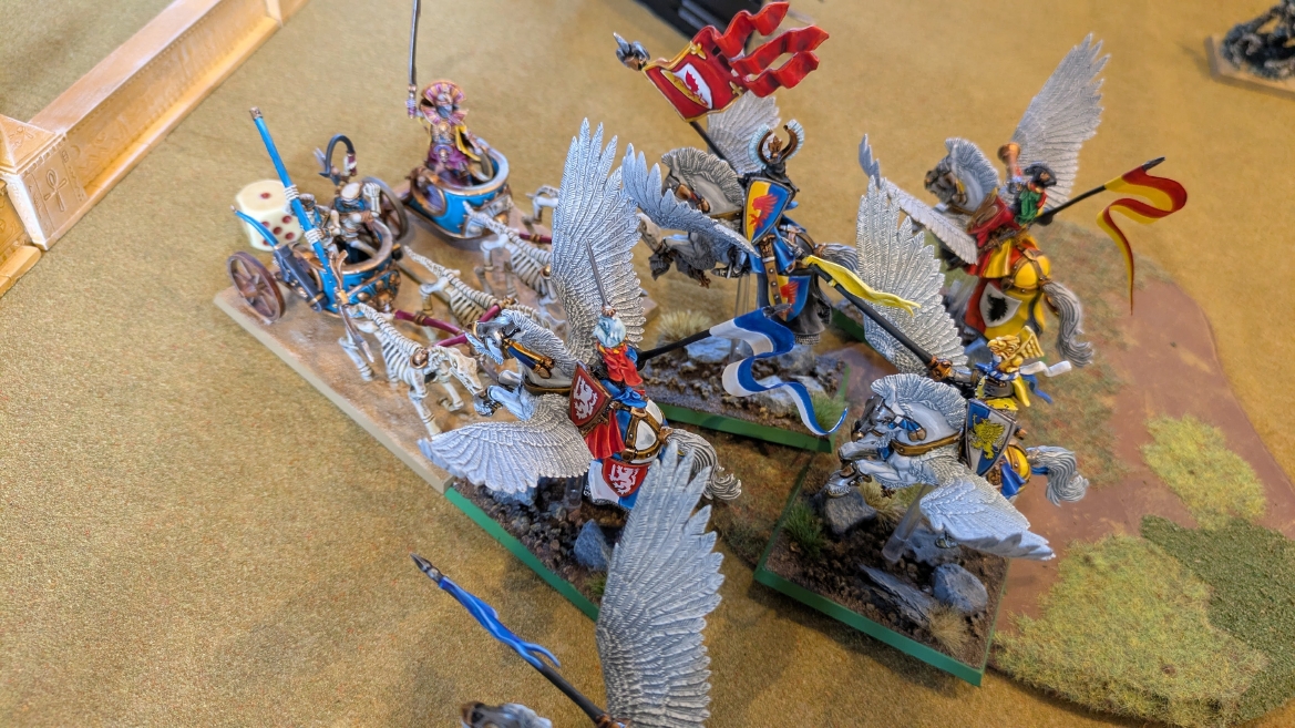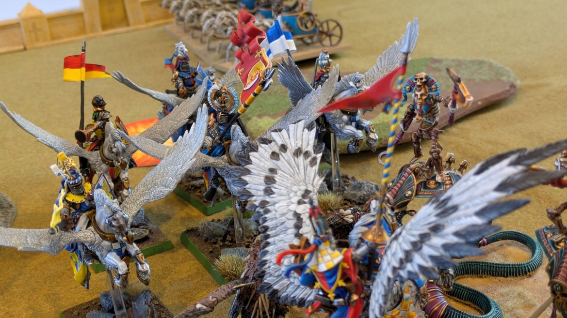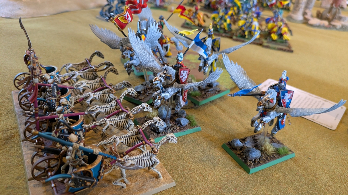 槍が骨を貫き、聖水に輝く剣が不死の呪いを断ち切る。トゥームスフィンクスすらブレトニアの突撃に耐えきれず、砂塵の中で崩れ落ちる。