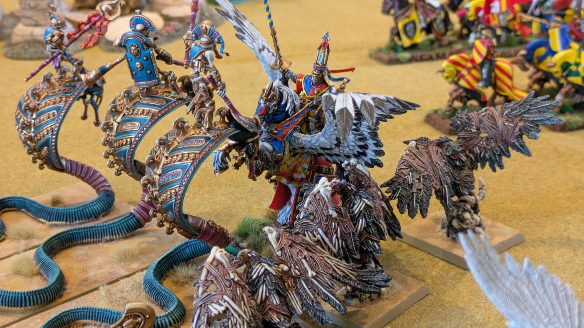 だが、戦場の中心では、セトラ王自らが戦場を支配していた。彼の神聖な戦車は雷鳴のように進み、黄金の刃はブレトニアの騎士を容赦なく切り裂いた。