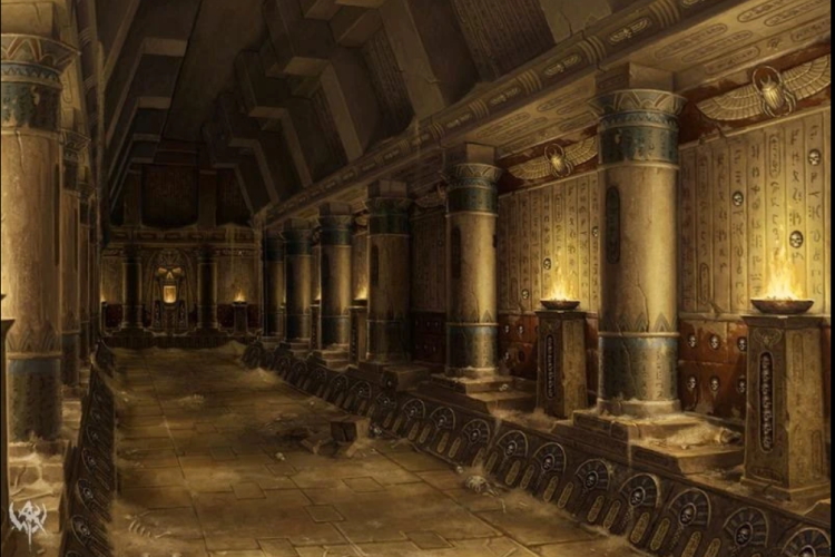 謁見の間は、黄金の柱と不気味なヒエログリフで飾られ、中心にはセトラ王が玉座に座していた。 荘厳にして禍々しき儀礼鎧に身を包み、無数の宝石が闇に煌めくその姿は、死の深淵と永遠の呪いを一身に宿す、畏怖すべき存在であった。