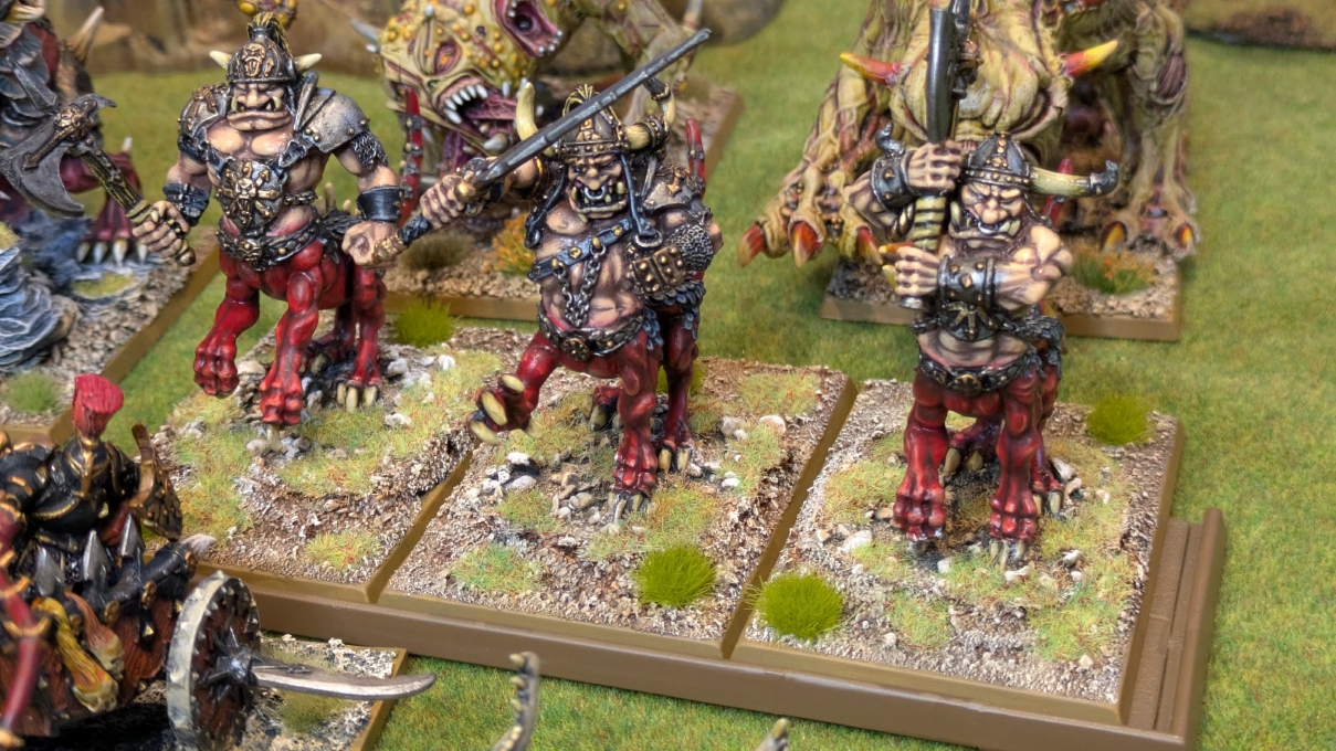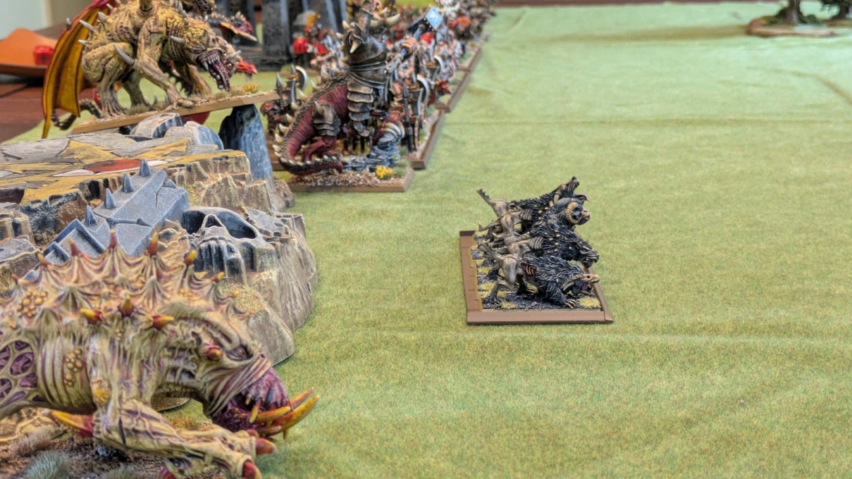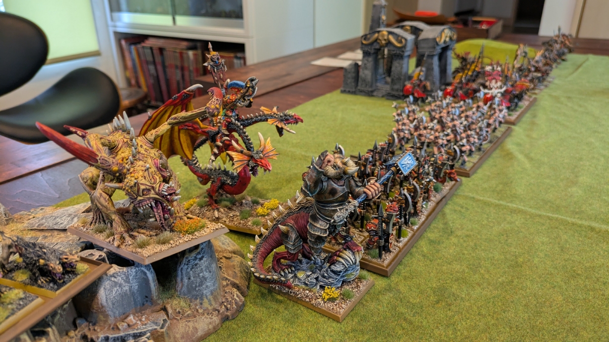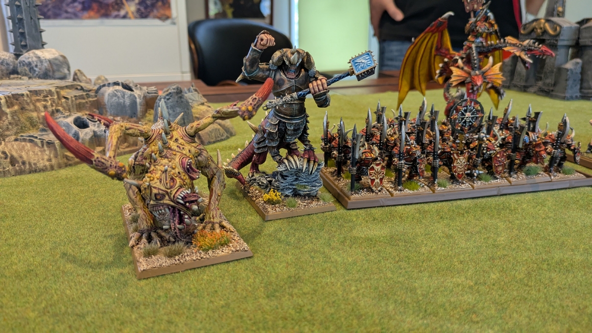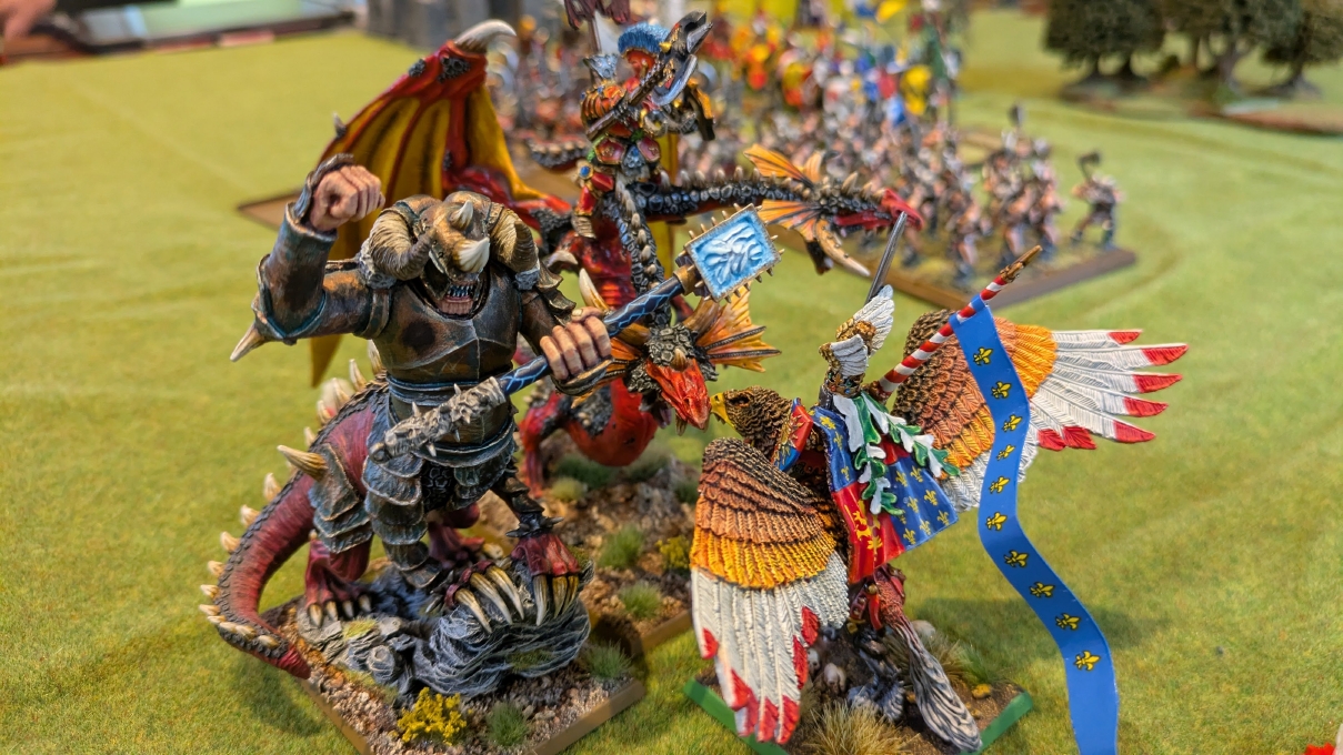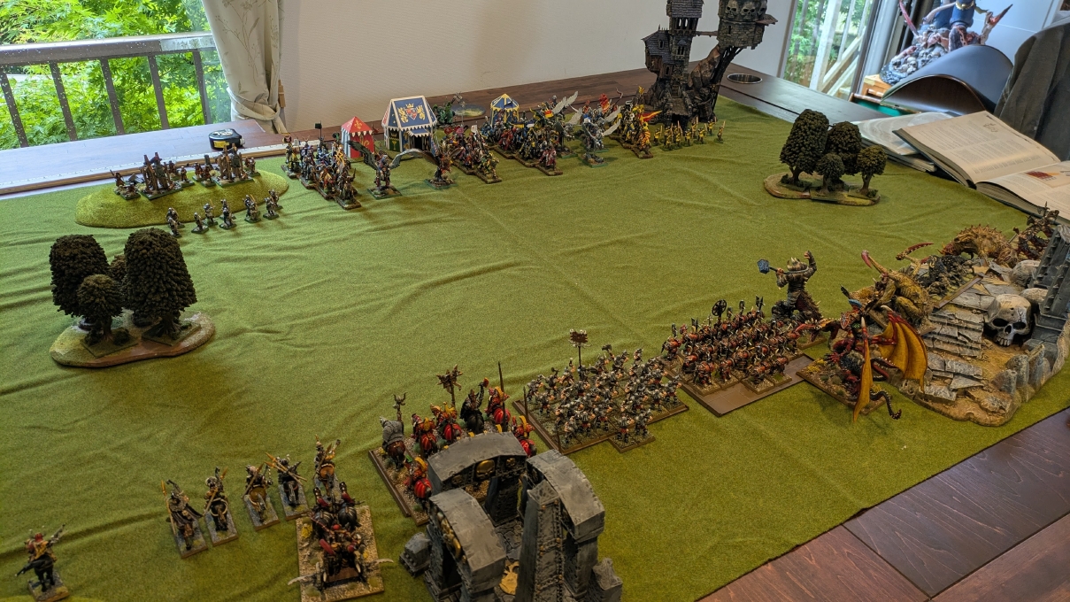 遠くの地平線では、ケイオス軍の巨大なモンスター、ドラゴンオウガが咆哮を上げ、大地を震わせるその姿は、まるで山が動くかのようだった。