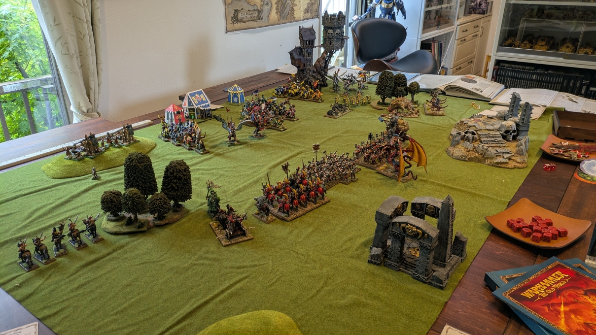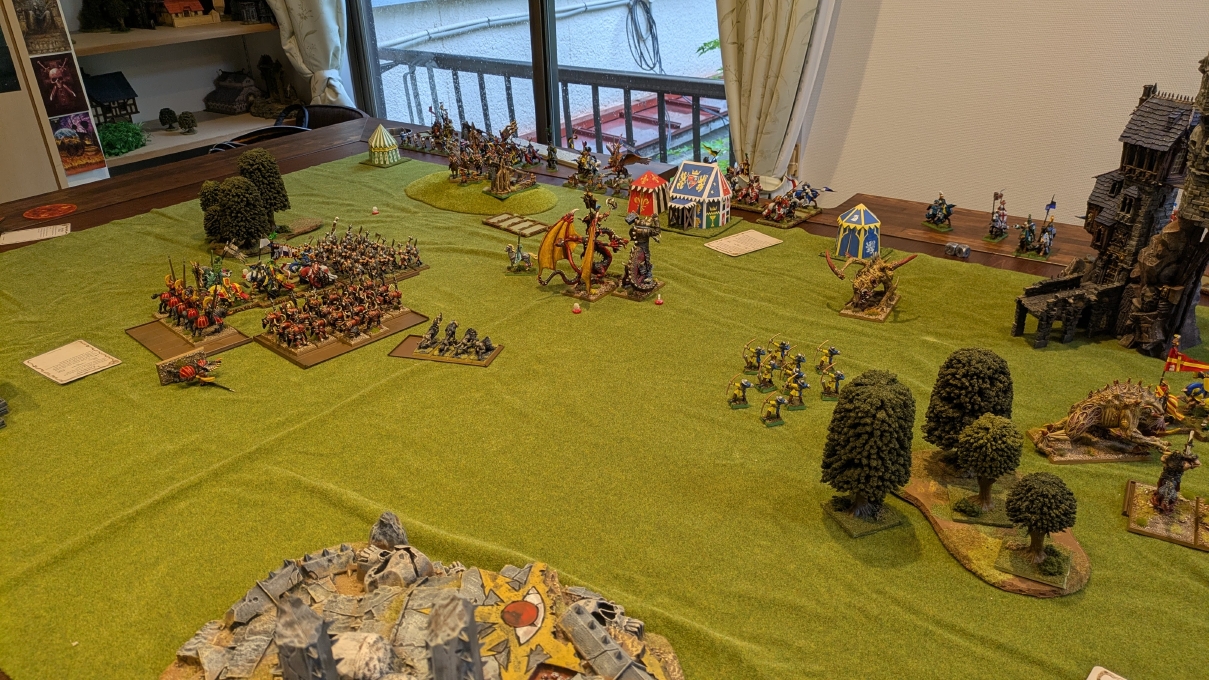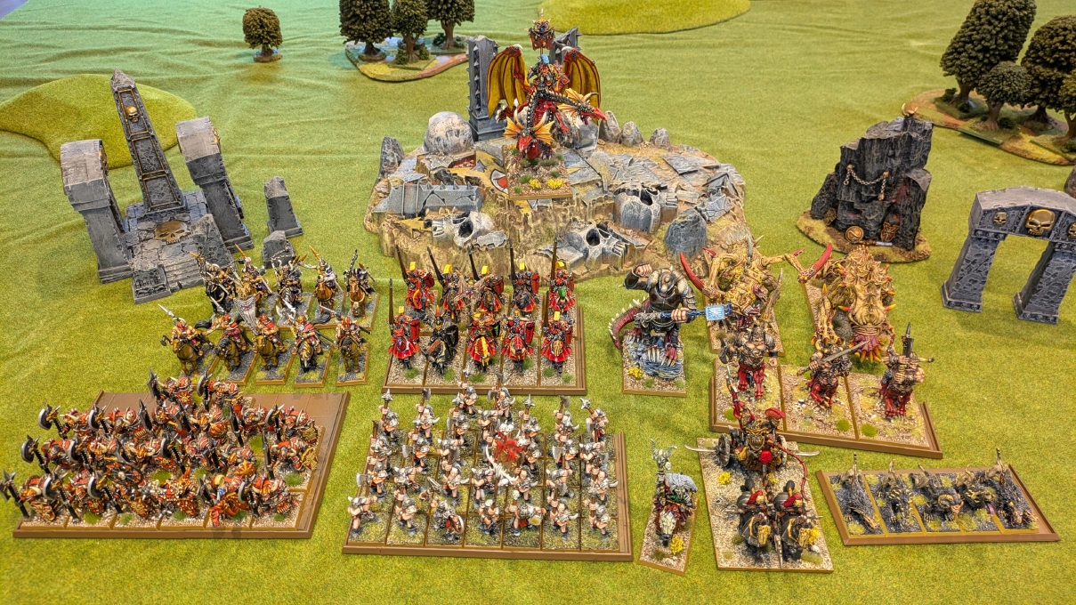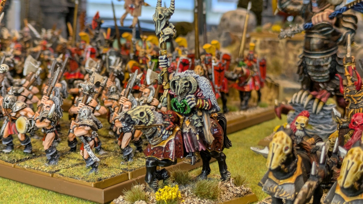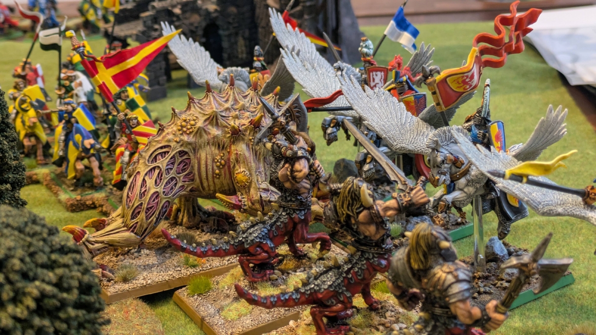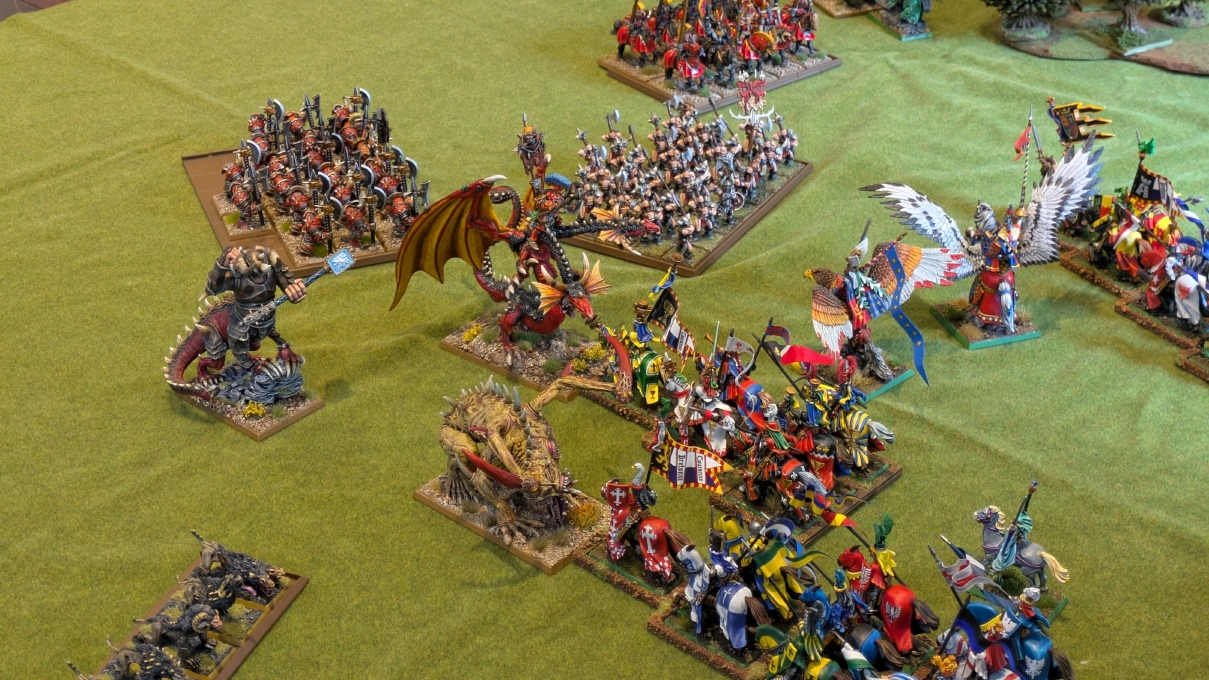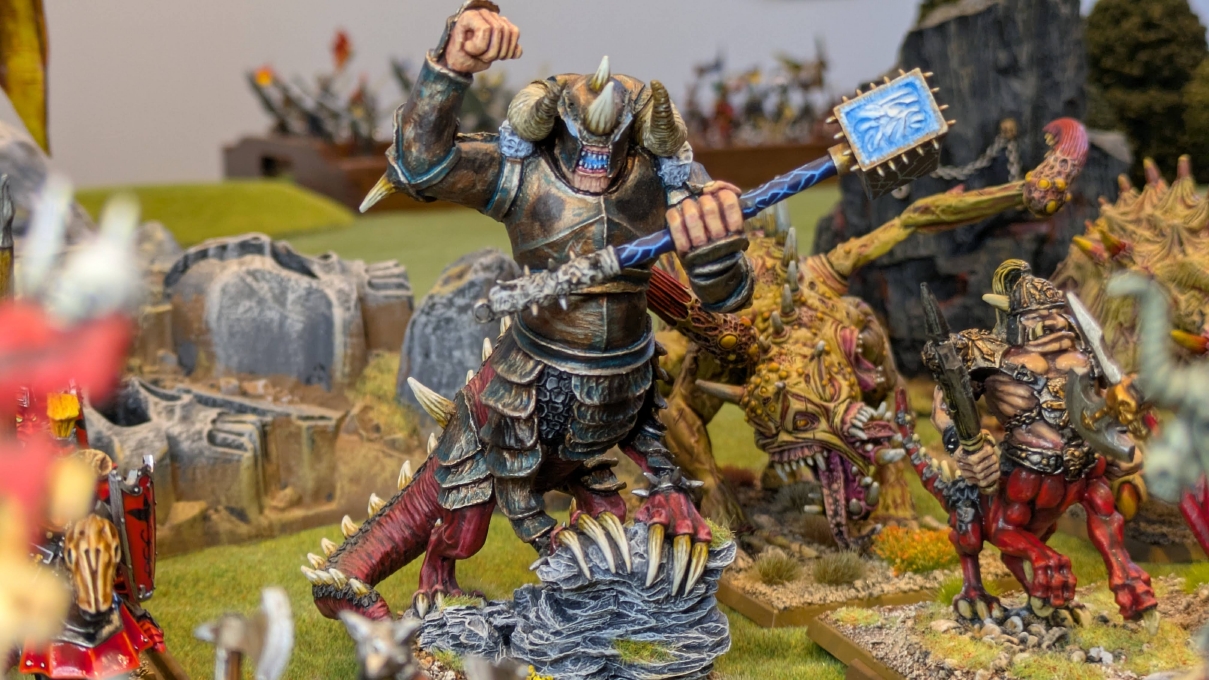 遠くの地平線では、ケイオス軍の巨大なモンスター、ドラゴンオウガが咆哮を上げ、大地を震わせるその姿は、まるで山が動くかのようだった。
