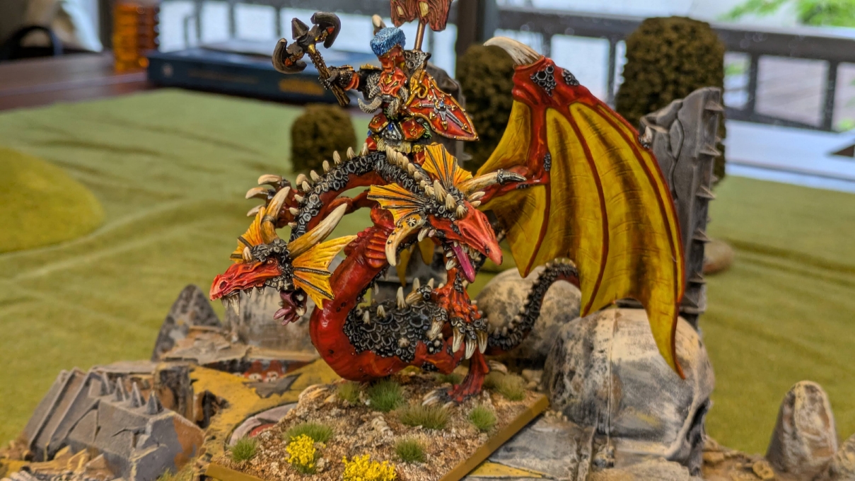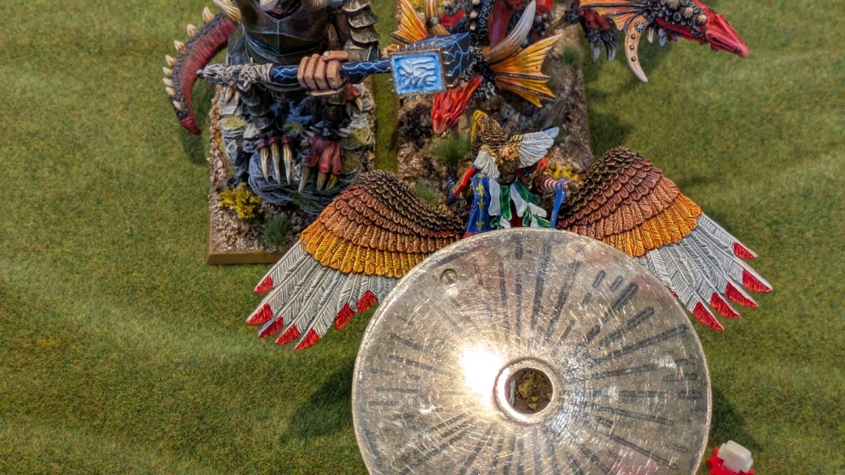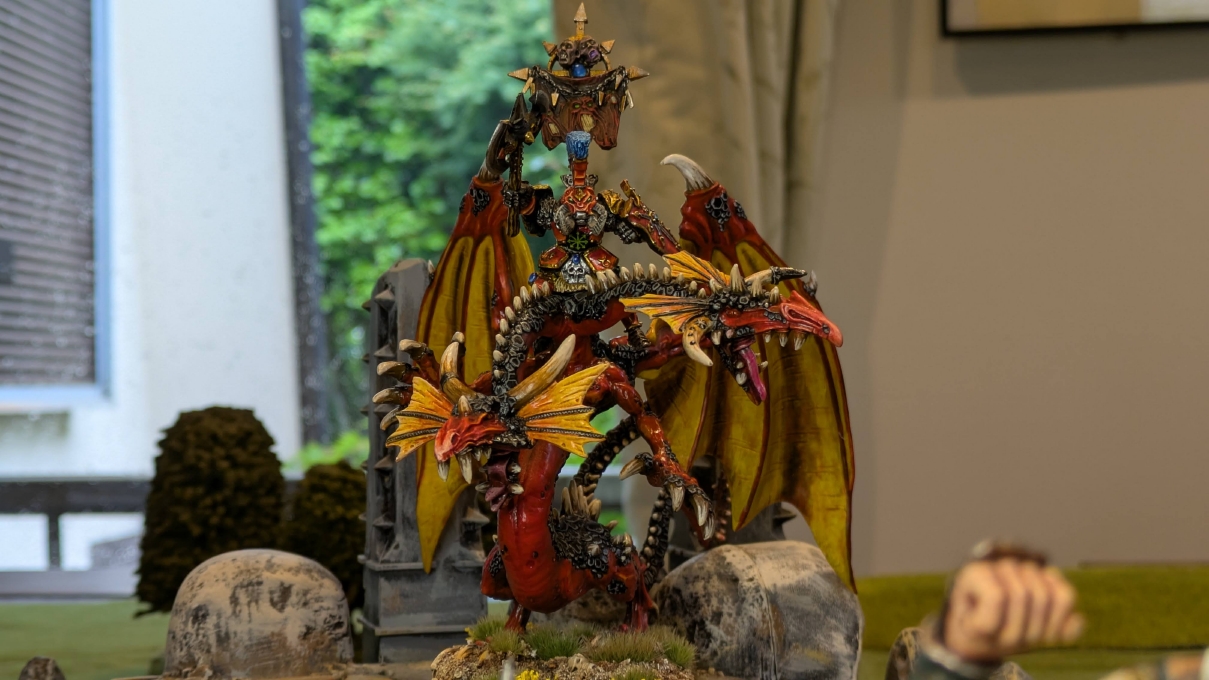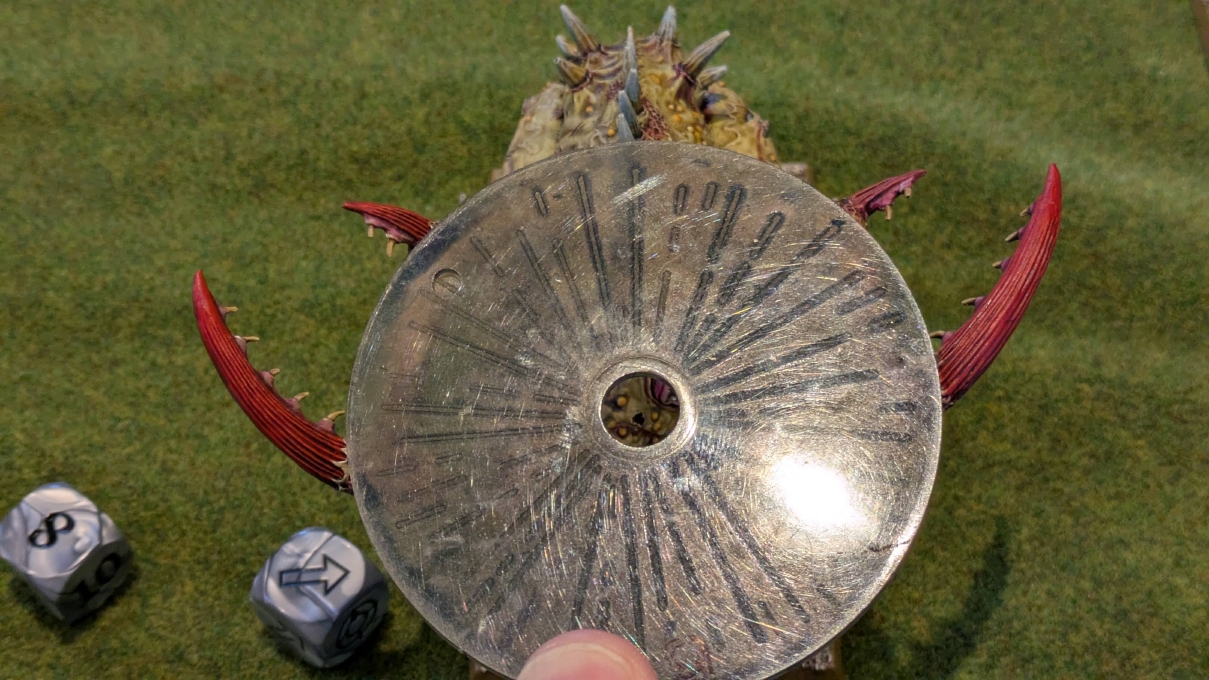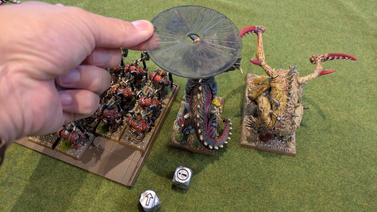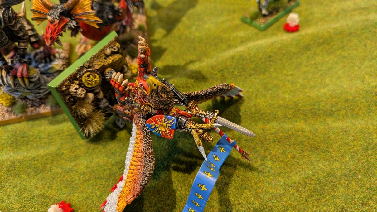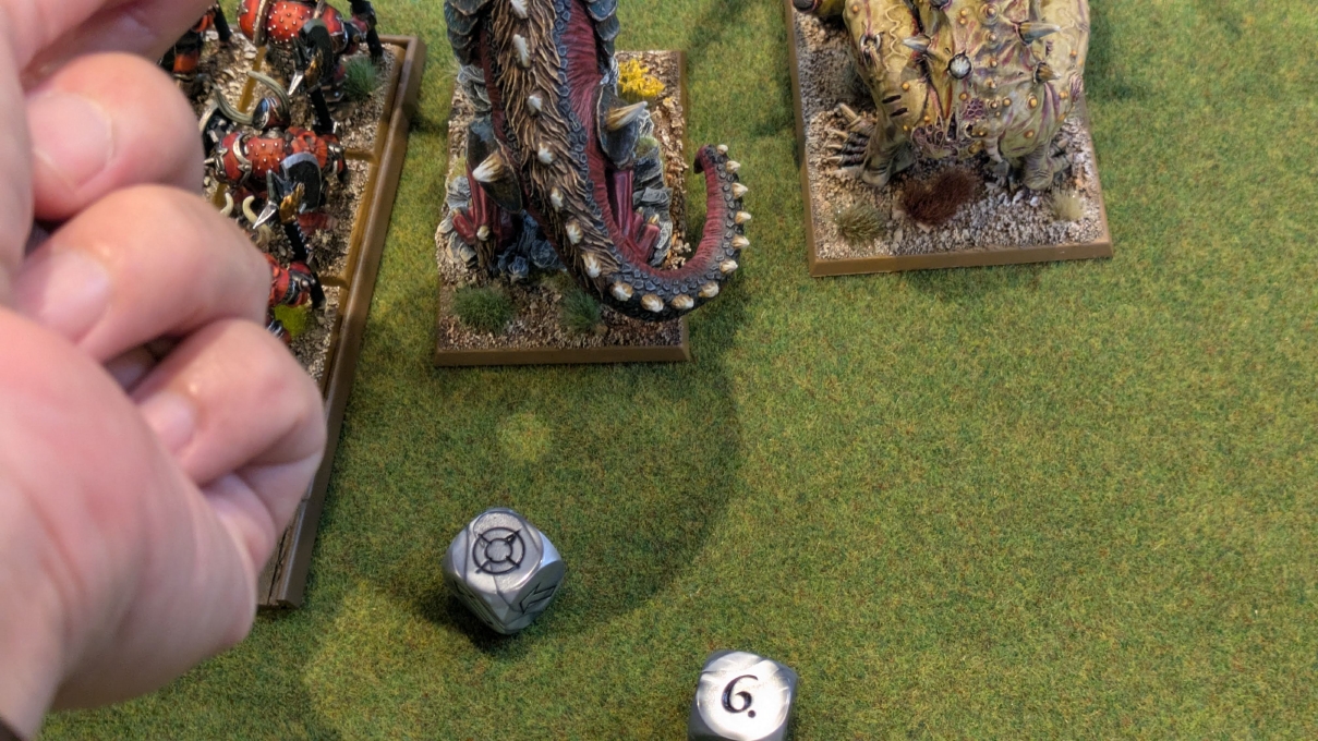 実は今回のエイヴァクス公は一撃必殺を信条として、反撃を受けることは想定しておらず、セーブが3+、ワードセーブ5+のみで、鉄壁とは言い難い状態なのです。