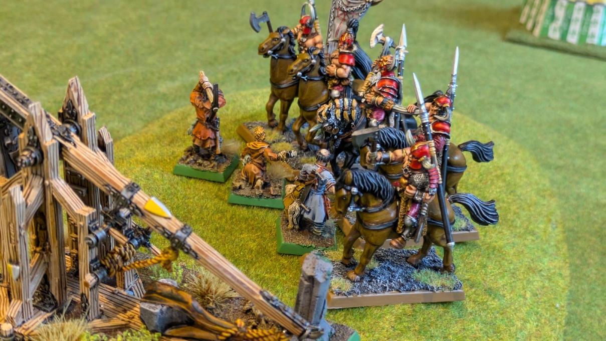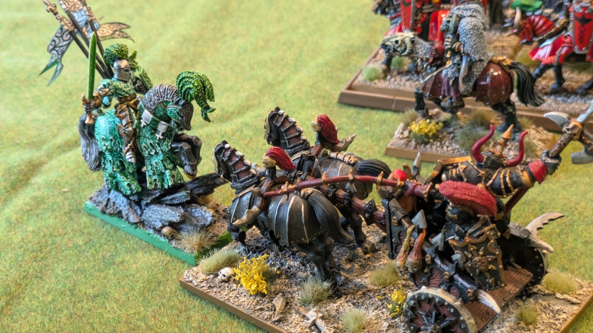 彼は一瞬の躊躇もなく、戦馬を駆りケイオスチャリオットへ突進。剣が冷たく閃き、風が唸る。御者たちが気付く間もなく、グリーンナイトの刃が最初の戦車に迫った。 |