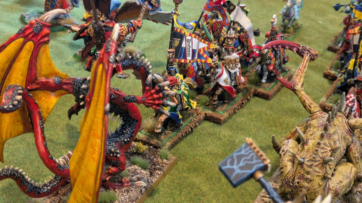 ドラゴンオウガが再び咆哮し、傷ついた肩をものともせず進軍を続ける。その巨体が近づくたび、ブレトニア軍の陣地に恐怖が忍び寄る。
