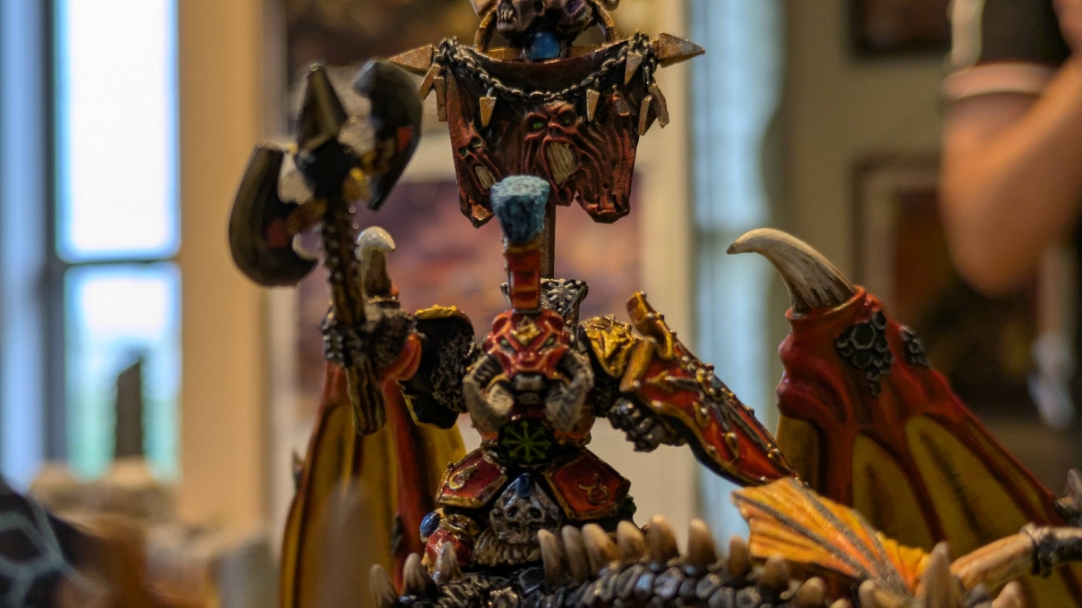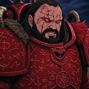 その巨翼が空を裂くたび、風は慟哭し、大地は恐怖に震えた。ラーシェスは赤く輝く黒鉄の甲冑に身を包み、禍々しい戦斧を手に、混沌の神々に捧げる生贄を求めて哄笑する。