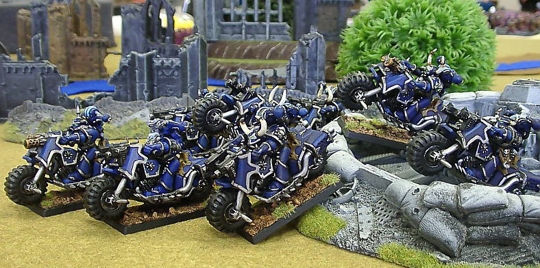 | 卵帝のコメント エンジンの排気音が聞こえてきそうな迫力の奈威吐露羽頭バイカーです。 バイクは、40kのユニットの中でも僕が特に好きなものの一つですね。何かイイじゃないですか(笑)。 ケイオスのバイクはTに加えてAも増えるみたいなので強そです。 ウィリーさせたモデルを混ぜる事で、スコード全体が躍動感あふれるものになっていますね。 ケイオスウォリアーの顔なども使う事で、全員が違う顔になってるのもポイントです。 僕もバイクを製作中なのですが、コレを見て、何でウィリーさせなかったのかと後悔しました(笑)。 何で組んでる時には思いつかなかったんだろう・・・ 思ったんですけど、ナイトローズって何かレディースっぽい名前ですよね・・・ 僕の巣屁偉主鵜瑠腐特攻隊が完成したら抗争しましょう(笑)。 |