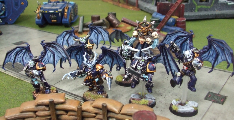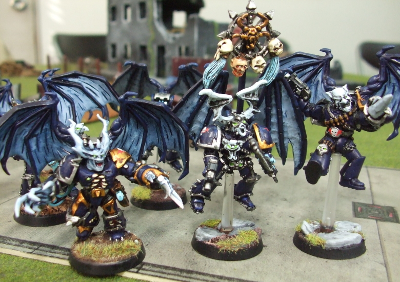 | ダニエルさんのコメント This picture shows my Night Lords Raptors in flying poses. That’s the best way to use them ? jump over terrain, unload with two flamers on an enemy squad, and then assault the survivors. This squad also has a icon for summoning Lesser Daemons on the opponents side of the board! The Champion in this picture has an especially demonic face and is armed with a power fist! The models are mostly “old school” (metal) Raptor models with some new bitz added. The wings are all bat/demon wings from Reaper miniatures. Rmanのコメント ダニエルさんはラプターを2ユニットも作られています。 しかもこのユニットもこだわりのコンバージョンが目白押しです。 新旧のパーツを自由自在に組み合わせて、しっかりラプターに仕立てられているのが見事ですね。 特にフライングしているヤツはポーズもキマってて格好良いと思います。 チャンピオンはボリュームたっぷり、迫力満点ですね。ボディーもポゼッスドから持ってきてるだけに、ただならぬ力強さです。 ダニエルさんのナイトローズは赤羽の部分が白くなっているのが特徴なので、 このラプターもその配色を踏襲されています。おかげでアーミー全体の統一感はバッチリですね。 ダニエルさんのコメントにもあるように、こいつが飛んできて、デーモン召還でもされた日には、 とてもじゃなけど対処しきれないだろうな〜と思います。おそろしや・・・ |