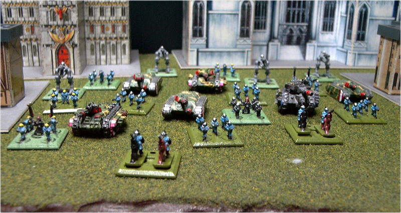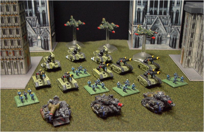 | Davidさんのコメント "Epic Guard Heavy"(上写真)はエピック・ガードのばかなヘヴィーさを見せるために載りました。写真のなかは役750Pです。 "Epic Guard Platoon"(下写真)はスタンダードなガード・デタッチメントです。役300P。これぐらいの3つももっている・・・。 Rmanのコメント エピック大好きなDavidさんならではの写真ですね!この量!40Kだったら何ポイントか想像もできません! こんな物量戦ができるのがエピックの楽しいところなのでしょうね。 小さい戦車もしっかりペイントされていて、格好いいです。 これを見ると、エピックを遊びたい!という気持ちがさらに強くなってくるのを感じます。 |
