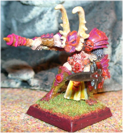 | G-13thさんのコメント 黒っぽい配色ばかりでは何なので気分転換も兼ねて こいつは暖色系を多めに使ってみました。 最初は体の部分が生身とは思えず、後から気付いて驚きまして、 結果かなりマッチョなソーサラーになっています。 Rmanのコメント これは..色合いが独特ですね〜。 鎧の色はどうやってペイントされているのでしょう。 お腹のあたりの塗りが曖昧な感じがあるので、もう少しメリハリを 付けても良いかも知れません。(肌と小物、鎧の塗り) |