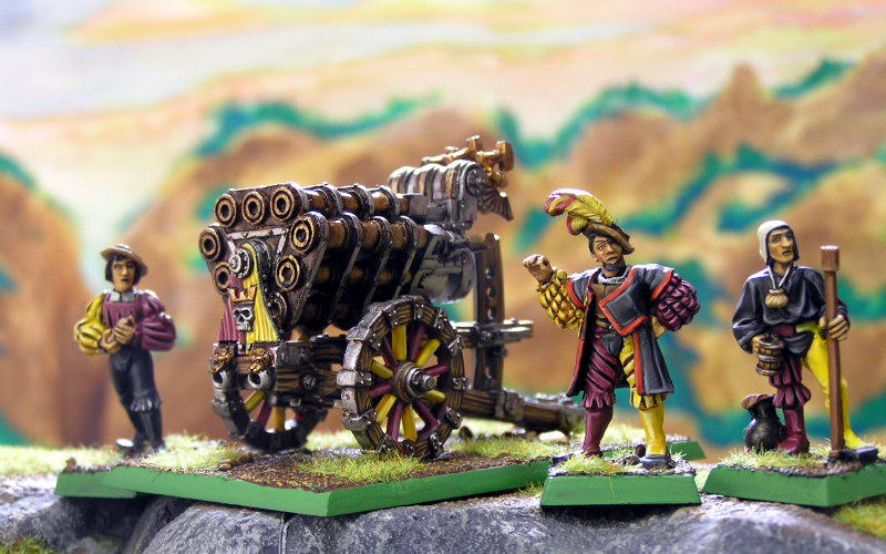 ホイールとフロント周りをオストマルクカラーで塗ってみましたが、 ホイールはちょっとダサかったというかクドかったというか(笑)。 クルーは没個性的で6版エンパイアって感じですが(笑)、真ん中の人はなかなか格好良いとおもいます。 ゲームではとっても不安定でダイスを振るのが非常に楽しいヘルブラスター。 一発で壊れることも多々あるのですが、最後まで粘ったりすると結構な破壊力を持っていたりします。 ヘルブラスターって、6版で新規造形されたのにさっさと7版でプラ化してしまいましたよね〜 Rmanさんも書かれていますが、このエンジニアのオッサンはかなり好きです。右手のポーズとか(笑)。 しかし、確かにどの辺りで州色というかオリジナリティーを出していけばいいのか難しいミニチュアだと思います。 いっそ、コレとかロケットバッテリーとかは、ナルンから試験的に運ばれてきたって事で黒い配色でも良いんじゃないかな〜と思ったり。 7版になってヒットロールしなくてはいけなくなったので、ちょっと使いにくくなりましたよね〜 ドワーフのオルガンにかなり負けてる気がします。 でも、配置してあるとやはりプレッシャーはかなりのものだと思いますので、出目を信じてブッ放して下さい。 |