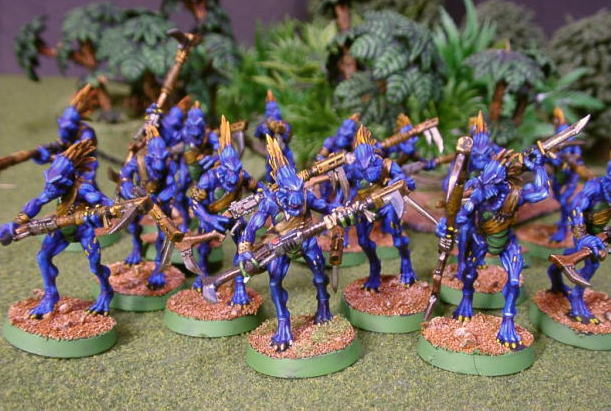 | Rmanのコメント TAUの歩兵クルートです。卵帝君の依頼により塗装。 どことなーく爬虫類系の見た目なので、リザードマンやるときはこういう風に塗ろうとおもってた配色を試してみました。 ミニチュアはプラなのですが、実はかなり出来が良いミニチュアです。 2001年11月24日のイベントに間に合わせる為に時間の短縮ということで15体平行作業をし、 毛嫌いしていたインク等も活用してみました。インクはテカるのが嫌だったのですが、 使う場所をきちんと考えて使うなら実に有効ということがわかりました(銃や革製の服とか)。 |