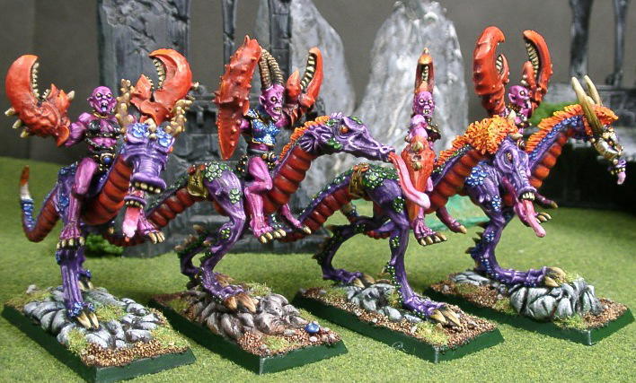 | 40Kで大活躍の予感、デーモニックキャバルリーです。 試作1体目に凝りすぎた為、他を量産するのに苦労しました(笑)。おかげで宝石塗りを何の苦もなく 塗れるようになりましたが(笑)。 しかし、なんと言ってもこのミニチュアの値段はヤバイです。1個$12.99 ですよ、大変です(笑)。 購入を断念し、このギャラリーの下の方にあるスペシャルチャリオットからもぎ取ってきました。 そして上から黒サフ吹いて...。こだわったのは配色ですね。基本配色を同じにして1年半前とくらべて どれくらい上手く塗れるか。自分的にはベースデコレートもまぁまぁ良い感じになりましたし、良い仕事が出来たと思います。 |