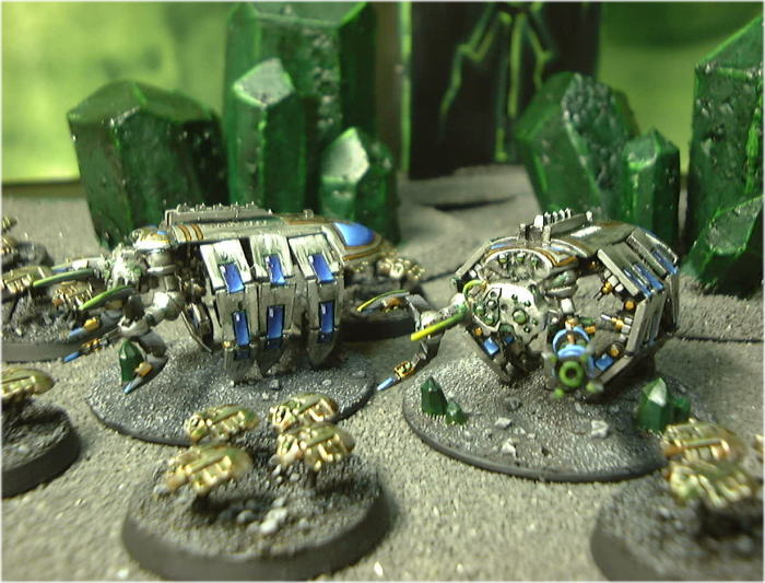 | Rmanのコメント ネクロンCodexで新しく追加されたユニット、トゥームスパイダーです。 ネクロンの中でも珍しく接近戦をこなせるこの墓蜘蛛。モンストラスクリーチャーの攻撃はセーブ不可! マリーンを殺すのにもってこい(?)!S6T6W2という数値にも注目です。 スカラベスォームを生み出せるという面白い能力も持っています。 ペイントに関しては、例にもれず銀一色で塗っていたのですが、コイツの値段を見て(なんと19.99$!) 真面目に塗る決意をしました(笑)。やはり青色がテーマカラーなので、青色のペイントを丁寧にやりました。 塗ってみると、妙に気に入ってしまって。やはりこの顔でしょうかねぇ〜。 上からの写真もあります。 |