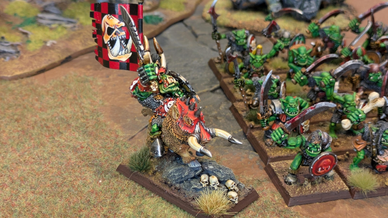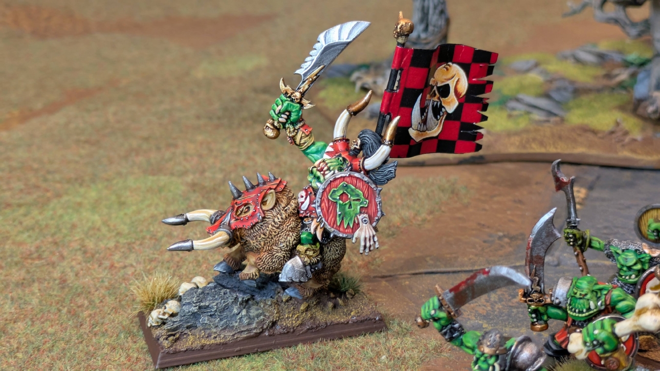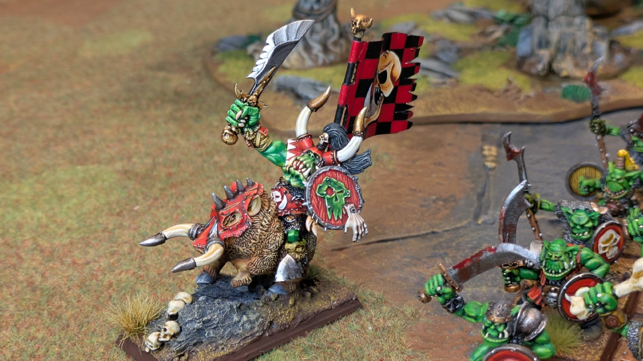 このオークボスはやはりその世代の趣味人にとってこれぞオークと言えるほどに印象深いモデルではないかと思います。5版オークの顔、とも言えるでしょうか。 僕がオークゴブリンのアーミーを作るなら、必ずこいつをジェネラルにしようと決めていました。 ようやくこれを塗る時がきたか、と気合は十分です。 ボアに迫力出そうと思って岩でウィリーさせたところ、斜めになり過ぎてちょっとバランス悪くなっちゃったかな〜と思ったりもしますが、 オークボアボウィとならべても目立ってくれそうなのでヨシとします。 ペイントは楽しく塗れました。オークは不細工になってもオークだし、いいかなと思えるのがいいですね(笑)。 このジェネラル率いるオーク軍で伝説を紡いでいくのが楽しみです! 2025.8.16 |