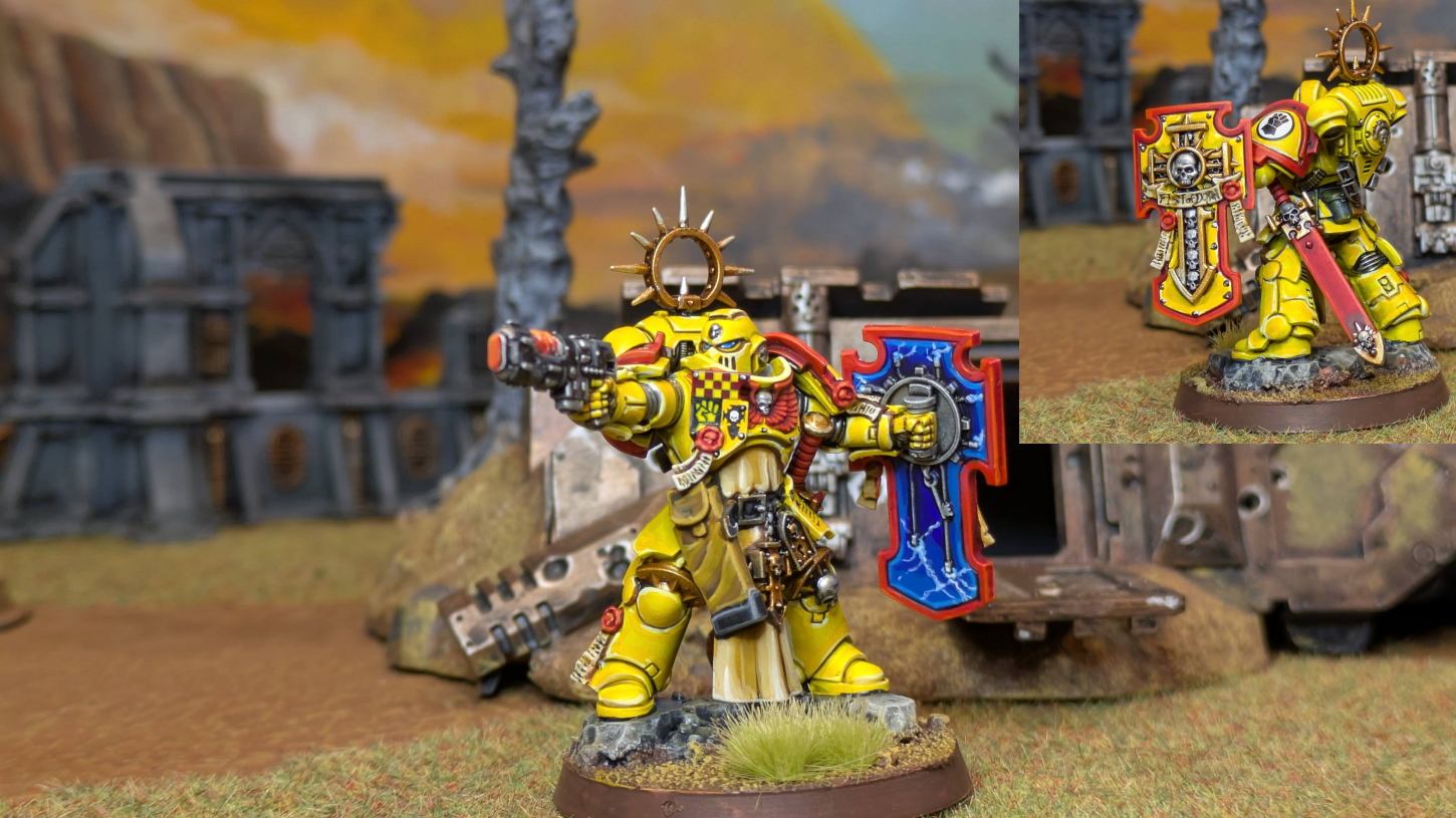アシェット社から出版された週刊ウォーハンマー「インペリウム」の創刊号(500円)に附属のミニチュアでしたから。 創刊号に選ばれるくらいなので、もちろんカッコイイし、8版から登場したプライマリスが熟成化したデザインも40Kゴシック感というかオカルト味というか、 非常に趣が増していて、ある意味、9版の40Kを代表するモデルの一つ、といっても過言ではないと思います。 そんなわけで、インペリウム創刊に合わせて、ウルトラマリーン仕様で塗ってはみましたが、まぁ、ちょっと雑に塗り過ぎたので、 本命のインペリアルフィスト仕様はちゃんと塗るぞと思ってました。 ゲームで使うとか使わないは別として、このモデルを1回ちゃんと塗らねば何かリスタートを切った気になれないと思って、2025年の締めに塗りました。 まぁ、ウルトラマリーンよりは丁寧に塗りましたが、仕上がってみるとやっぱりカッコいい! 装飾が豪華なこともあって、素直に塗るだけでもかなりの見栄えですね。 シールドの裏面はかなりド派手にしてしまいましたが、アクセントになったかなとお気に入りのポイントです。 やはりこのレフテナントは良いですねぇ。白兵戦力(アサルトインターセッサーとかブレイドガードベテランとか)を率いて戦う光景を想像するだけでワクワクしてきます。 2026.1.21 |