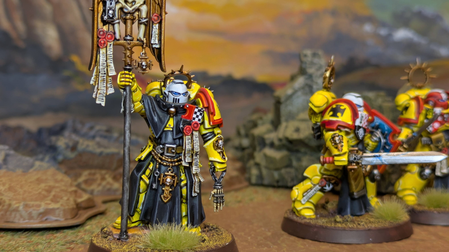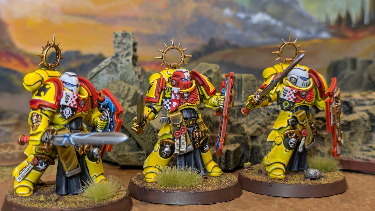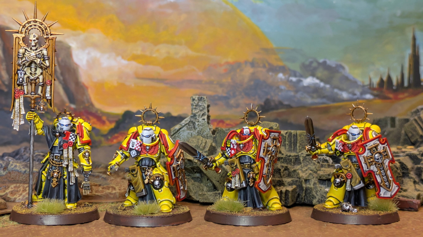 こちらは9版ローンチボックスであるインドミトゥス限定のモデルです。 (一応、GW直通版で購入できます) インペリアルフィストのブレイドガードは30K時代のインペリアルフィスト専用モデルであるソードブレザレンから続くモデルのようでもあり、 見本塗装もブラックテンプラー味を効かせてあって、布を黒くしてみたらこれがドンピシャでハマって格好良く塗れた気がします。 肩のリムもGWの見本は黒でしたが、リムの色はもう割と公式も適当になってきてるし、たぶん第五中隊(黒)が推しなのでそれに合わせてるのかなと。 というわけで、僕の第三中隊(赤)に合わせました。 黄色と赤と黒と白ヘッドでだいぶド派手かつ取っ散らかった気もしなくもないですが、ぱっと見格好良くみえるのでヨシとしましょう。 それにしても第一中隊、ヴァンガードベテランが微妙になっちゃったのに、剣と盾を装備した重厚な騎士が出てきて最高ですね。 もう普通に格好良すぎるので、何体でも作りたくなりますね! いや〜インペリアルフィスト増強、ますます楽しくなってまいりました。 2026.1.26 |