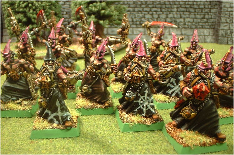 | Rmanのコメント ケイオスデュエリストです!誰がなんと言おうとDoWのデュエリストなのです!(笑)。 このミニチュア、元々はラウンドベースに載せてケイオスマリーンのカルティストとして使用してきました。 ですが、ショックなことに新ケイオスマリーンでは、僕が望む編成にカルティストを入れることが出来なくなってしまったのです! これはショックでしたよ〜〜。こんなクソ雑魚共にもかなりの時間とお金を投資しましたから(笑)。 それで、思いついたのがDoWでした。 DoWは元々、GWゲームで版が変わる毎に消えていったミニチュア達を活用できるアーミーだ! と聞いた記憶があります。なるほどです。 ともあれ、ゴミの壁役だったコイツらもFBでは風のように戦場を走り、刺すようにピストルを撃つ!頼もしいユニットになってくれそうです。 一件落着?(実はまだ未塗装のを12体持っている.....) |