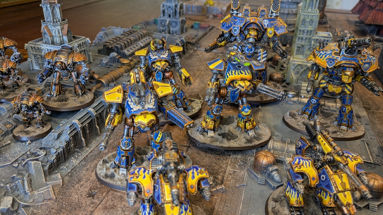 | さて、アデプトゥスタイタニカスの魅力はやはりタイタンを複数運用するその豪華さであります。 写真のようにリーヴァータイタンは複数投入も可能ですし、ウォーハウンドタイタンも複数機投入が日常であります。 40Kの戦場ではこんなにタイタンを投入できませんからね、そこが一番の売りだと思います。 リージョンインペリアリスでもタイタンは複数投入できますが、基本的にスペースマリーン兵団を中心としたアーミー編成になって、 タイタンばかり扱うのは例外的編成のようですので、タイタニカスはタイタンにフォーカスしたゲームとして独自性を保っていると思います。 タイタン好きにはたまらないと思います。 |
