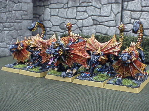| Rmanのコメント 卵帝君の購入したフレッシュハウンドを僕が塗装したものです。 塗装前に決めていたことは卵帝君の赤と緑のフレハとは違う雰囲気をだす、ちゃんとコーンにする。でした。 結果的に見ると(まだ僕は見たことのない)配色にできたし、そこそこコーンのダークさがでたかな?と思ってます。 少なくともナーグル、スラネ、ティーンチっぽいと言うことはないハズです。 しかしこいつらの塗装はほんと疲れました。何故かってやっぱりこのクソ多い鱗の塗りでしょう!これさえなければ簡単でしたよ。 しかもユキさんの超美麗な鱗塗りと卵帝君の鮮やかな鱗の塗りを見せられた後にドライブラシでさっさと仕上げてしまうことは出来ず、 都合4回くらい塗り重ねてしまいました(笑)。死にそうになりながら塗ったのですが今になれば良い思い出です。 卵帝君のお気に入りの作品に入れてもらえたようですし、嬉しい限りです。 |