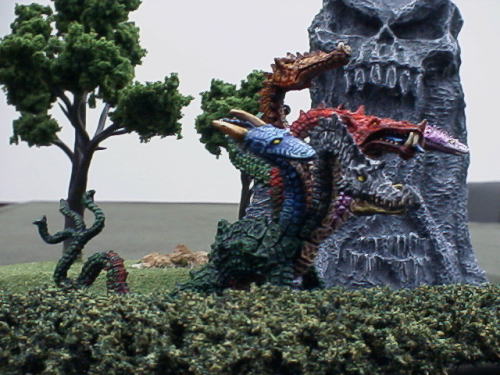 | Rmanのコメント 以前に卵帝君に頼まれて僕が塗装したラルパーサ社のハイドラです。昔メタルを扱っていたという店で偶然卵帝君が手に入れた逸品です。 首が全部違ったり、とにかく造形が美しいので塗るこっちとしても気合い入りましたね。 卵帝君の指令は「首の色は全部違う色」とのことだったので、がんばって違う色にし、さらに調子こいて前進を虹色までしてしまったら 完成品を見た彼に「これでは頭の色違いが目立たないから体は深い緑にしてくれ」と言われてしまいました。厳しい!(笑) そうして完成したのがこいつです。深い緑というのはなかなか難しい注文でした(結果は見ての通りゴジラ色!?)。 |