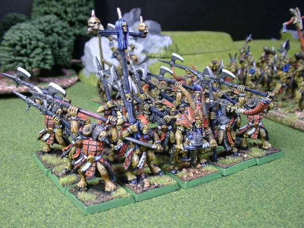 | Rmanのコメント ビーストマンの精鋭部隊ベスティゴールです。ヘビーアーマーとハルバードを装備したこのエリート部隊は 防御面でも攻撃面でも非常に活躍してくれます。 日バトルブックに載ってるこいつ等の塗装ってシルバー単色で塗ってるって感じで物足りないなぁと 思ってたのですが、とある(昔の)WD誌に凄まじい程に格好いいビーストマンアーミーが掲載されてたので 普段は必ずと言っていいほどオリジナル塗装を試みる自分がその塗装に習ってみたのです。(っていうかまんま) しかしどんなアーミーをやっていても精鋭ユニットを塗るのは楽しいですね。 |