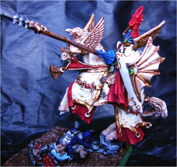 | ゴクリさんのコメント 結構がんばってすこしづつペイントしていきました。 白っていうのは難しいです。ハイライトのつけかたがどううも・・・。 やっぱ黒下地じゃなくて白にしとけばよかったか!と後悔してます。爆 しかも今回はちょびっとですが書き込みしました。!書き込みといえるほどのものじゃないですが!w Rmanのコメント ハイエルフ最高のミニチュアと名高いティリオン!オリジナルカラーで登場ですね! 黒下地からとの事で重厚感をだしつつも決して暗くはならず、白色が綺麗に出てます! 赤に金縁の白バーディングの配色はなんとも高貴な感じで、模様もあってまさにプリンスに相応しいです。 盾の改造も派手で格好いいですね。 |