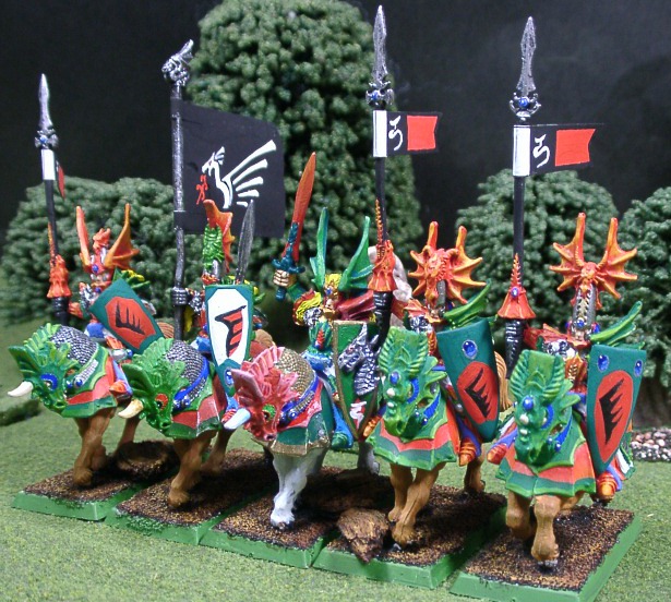 盾や赤緑の配色で差別化はしていますが。一番つらかったのがバナーですね。なんとか手書きでがんばってみました。 チャンピオンのシールドはブレトニアの兜の飾りをぶったぎって半分にわって湾曲部分をパテでうめました。 ん〜ちゃんと違和感なくドラプリのシールドになってるか不安ですけど・・・・。 Rmanのコメント 初ユニット完成おめでとうございます! この配色は中国ドラゴン?っぽくて凄く好きです。ベースデコレートもバッチリですね。 シールドの宝石塗りも綺麗です。ハイエルフ塗りが板に付いてきたという感じでしょうか。 あとはガッシュならではの弱点、塗料の厚ぼったさをどう調整していくかですね。 |