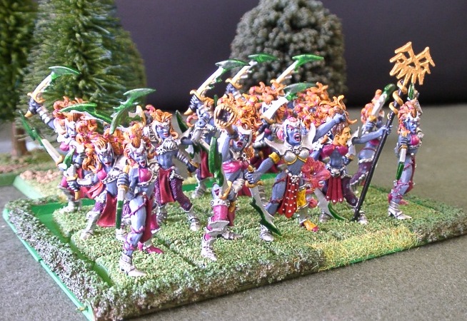 | はつかさんのコメント 狂乱持ちってトコからイメージを膨らまして、ちょっと派手な配色にチャレンジしてみました。 さらにチャンピオンには豹柄のタイツを履かせようとしたんですが、 完成したらキリン模様になっていたのはご愛嬌(笑) Rmanのコメント はつかさんがWHを始められてすぐ塗ったというこのウィッチエルフ。え?まじで?っていうくらいの クオリティーです。顔もしっかり描かれていますし、配色も新鮮です。 はつかさんのダークエルフの皮膚色はちょっと独特で好きです。 |