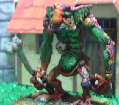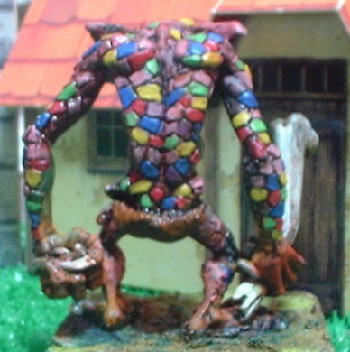 | Rmanのコメント 見たことのないholtenさんパワー爆発のストーントロール! ウロコは同系色で塗るという固定概念を見事にうち破られてます(笑) 体が緑で統一されているだけにウロコの異様さが目立ちます。もはやストーントロールというより別の生物という感じですね。 どこかの酔狂な魔法使いが自分のペット用にストーントロールに魔法を掛けて鮮やかにしてしまった とかそういうストーリーを感じさせるものがあります(笑)。ファンタジーミニチュアってホント良いですね〜。 |