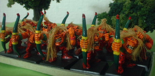 | Rmanのコメント またろうさんのホブゴブリンアーチャーです。 髪の毛が生えたゴブリンということで、ホブゴブリンということです。新しい改造方法で面白いですね。 肌の色がオレンジなのもグリーンスキンの基本を覆す塗りで新鮮みがあります。 ただ、肝心の髪の毛が塗っておらず付けただけなので、わらをかぶっているように見えてしまうかも。 髪の毛も色を乗せるといいと思います。 ベースデコレートはシタデルフロックをまくだけで完成度が随分変わるはずです。ぜひやってください。 |
