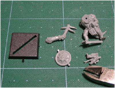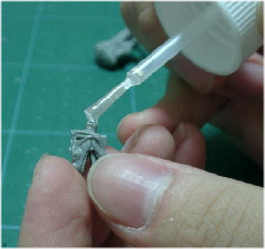 パーツ同士を接着する。 パーティングラインを落としたらいよいよ組み立てに入る。最初にも書いたが、ここではスチロール樹脂系接着剤を使う。このタイプの接着剤は、有機溶剤系の成分を含んでおりプラ同士を溶かして接着するのでガッチリとくっつく。瓶の口で余分な接着剤を落として、パーツに塗ろう。接着剤はつけすぎない事。そして、もう一点注意してもらいたいのは、換気をちゃんと行うことである。上に書いたように、有機系の成分を含んでいるので、長く吸い続けるとレルム・オブ・ケイオスに直行は確定である。別に私は止めはしないがね・・・ |