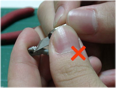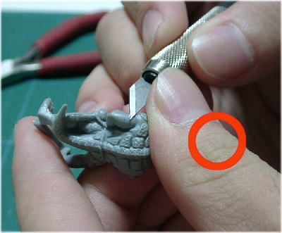 2つ目に注意する点は、決してデザインナイフの進行方向に自分の指を置かない事だ。理由は言わずもがなである。私が気を付けて見ていると、意外とこれを守っていない趣味人が多い。写真は多少極端な例であるが、例え力を入れずに作業をしていても万が一と言うこともある。十分に気を付けてくれ。 |